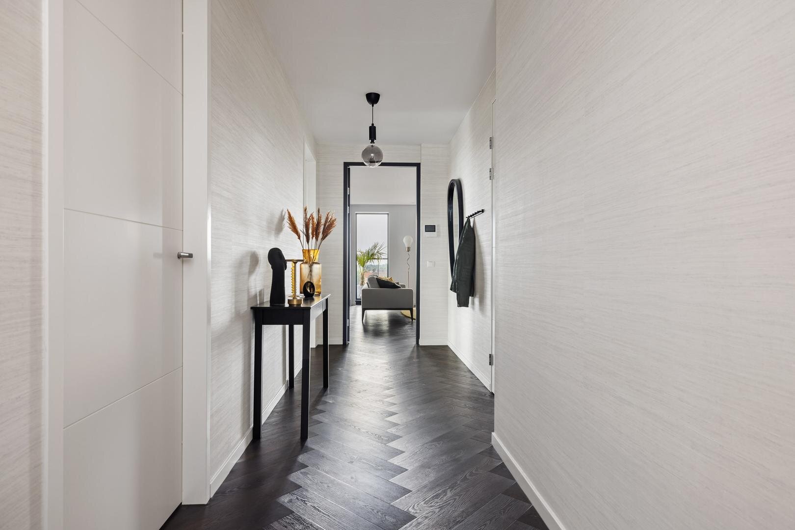 - ruime entree/hal met toegang tot het separate toilet, de badkamer, drie slaapkamers en de woonkamer;