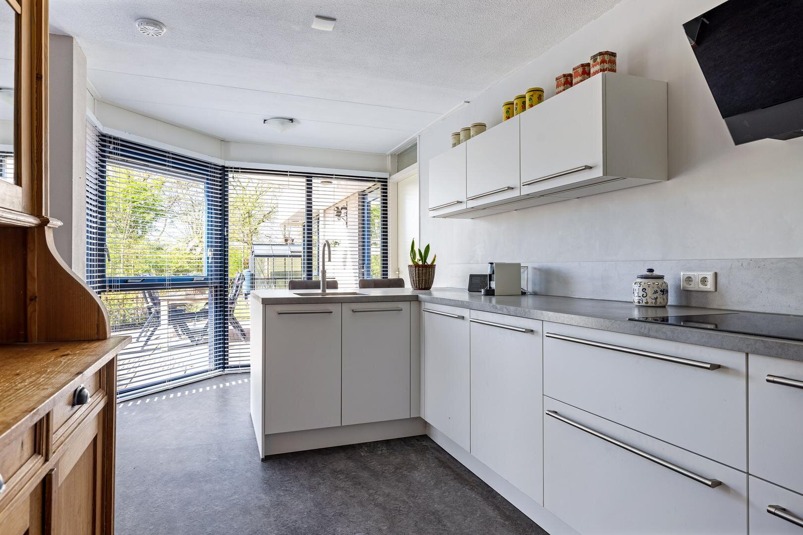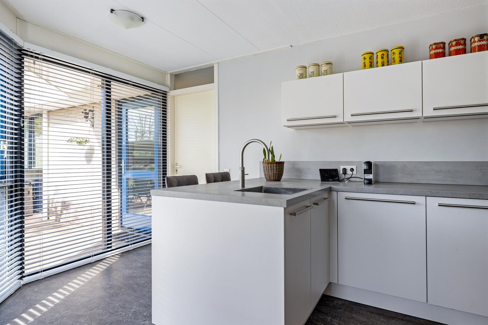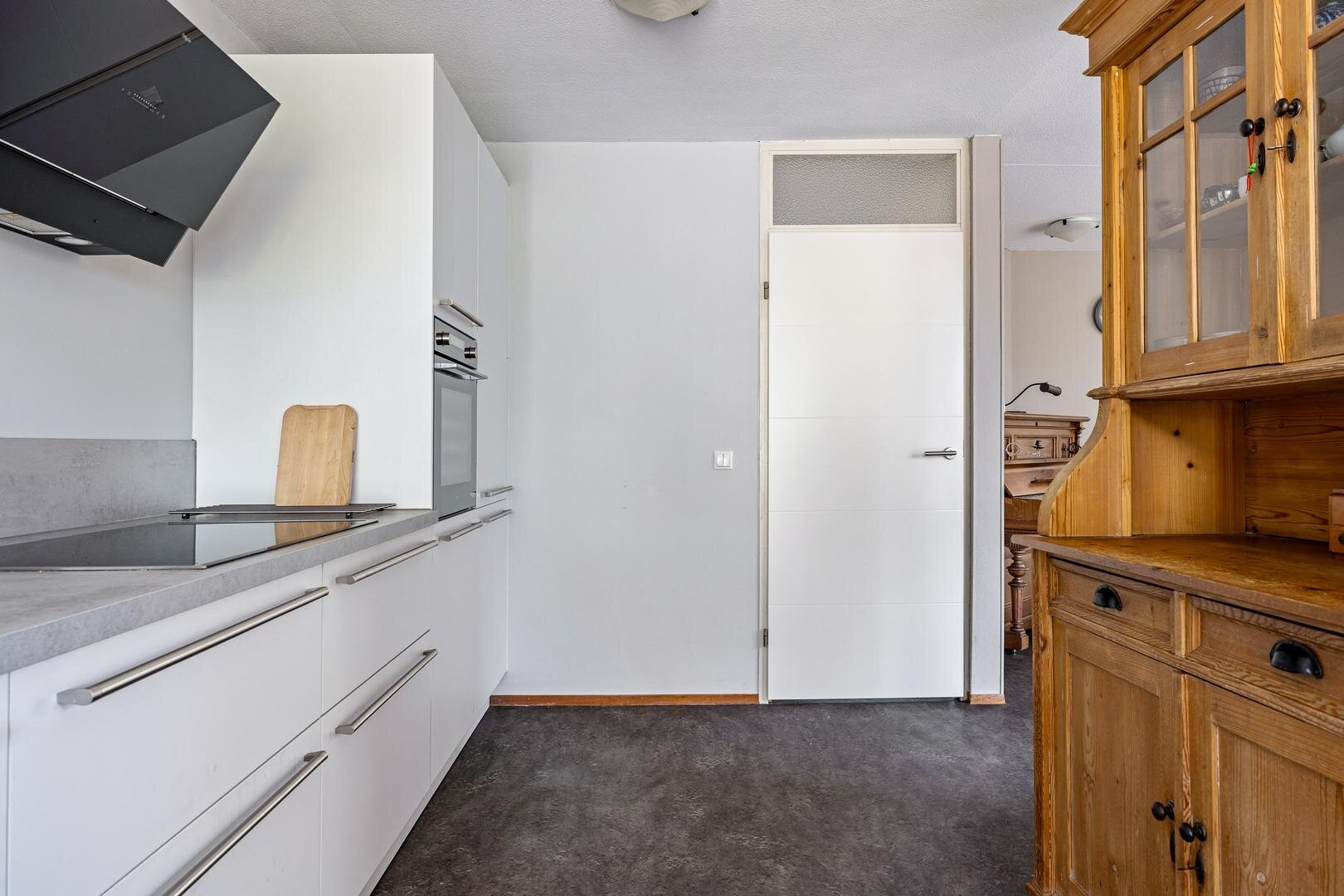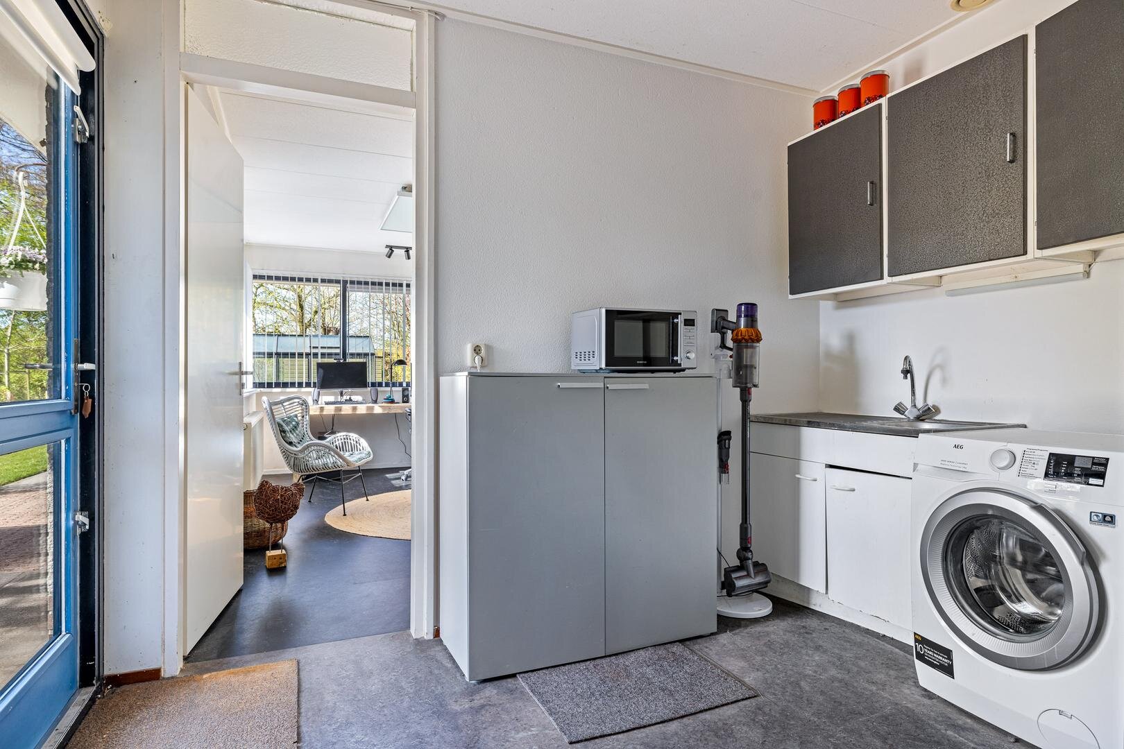 De keuken is uitgevoerd in een praktische L-opstelling en voorzien van diverse inbouwapparatuur, waaronder een koelkast, inductiekookplaat, combioven, Quooker en vaatwasser. Aansluitend bevindt zich de bijkeuken met pantry en opstelling voor het witgoed. Vanuit hier bereik je de multifunctionele kamer aan de achterzijde, momenteel in gebruik als kantoor.