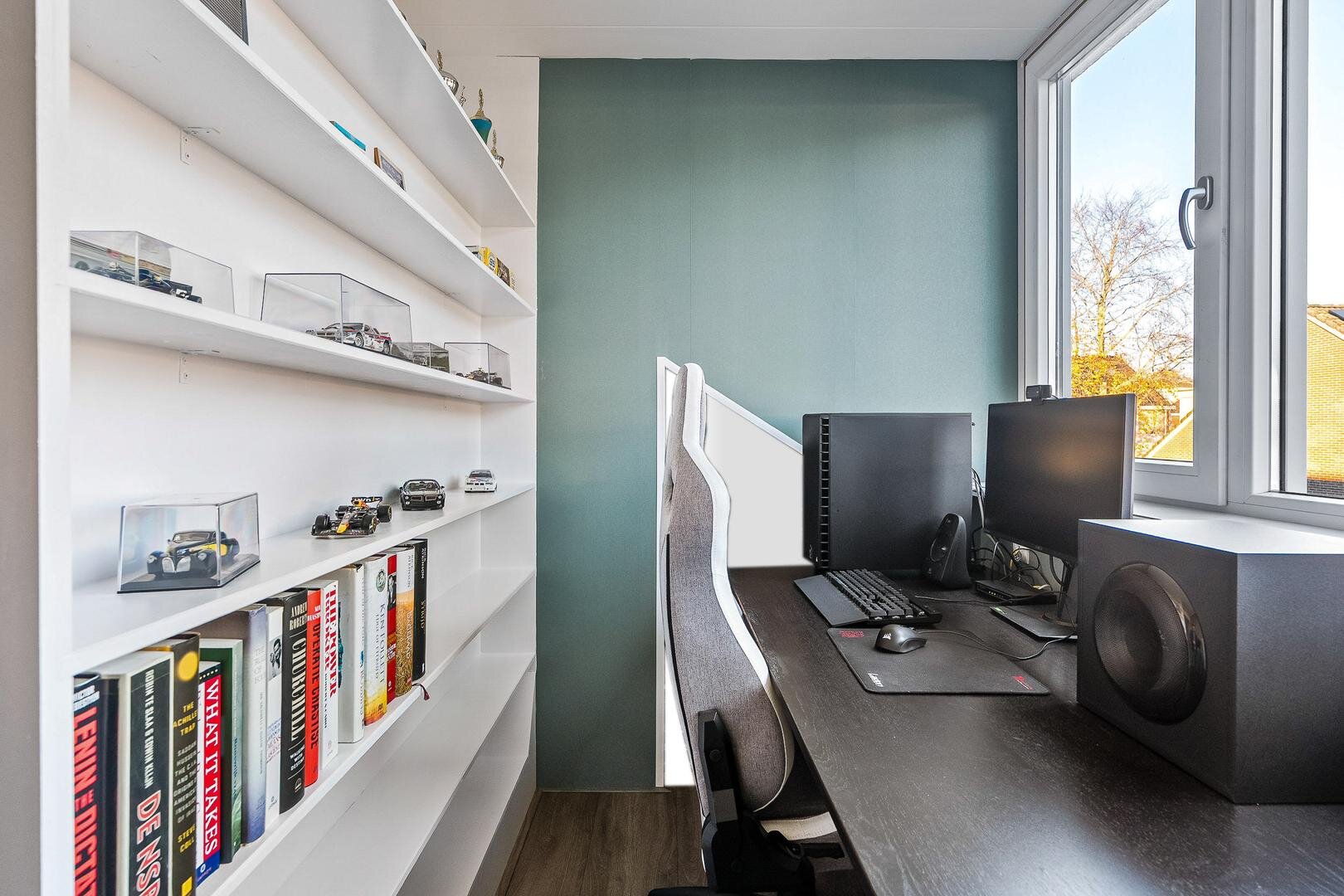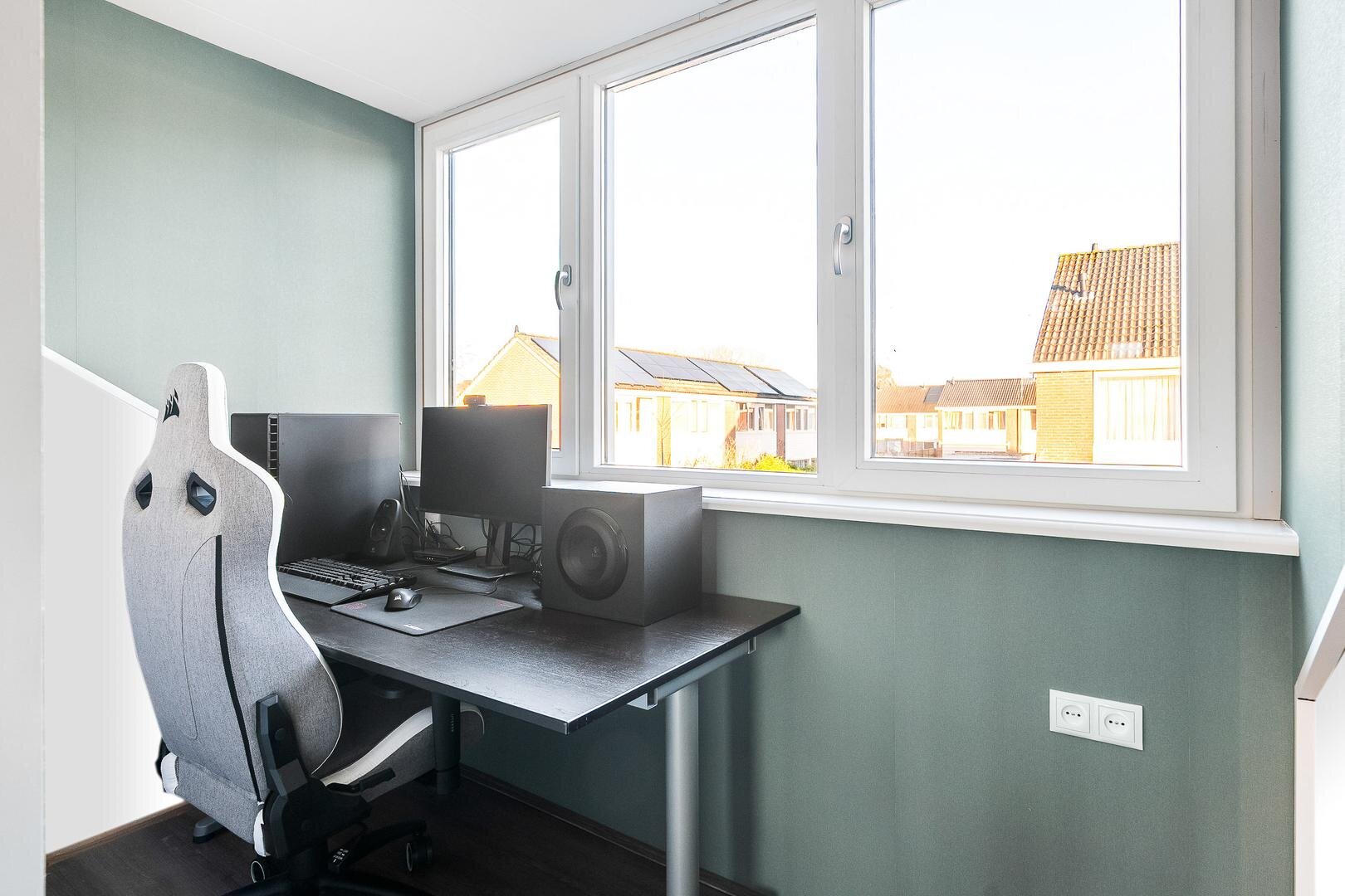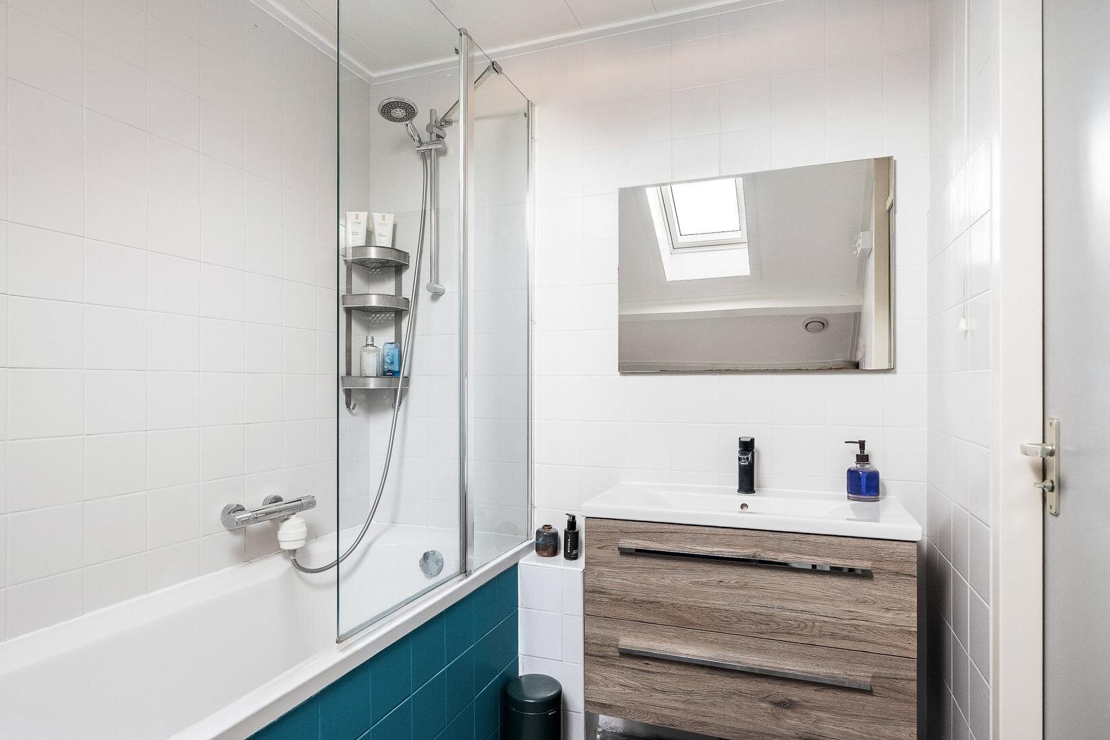 Op de verdieping bevinden zich drie slaapkamers, waarvan twee ruime en een kleinere kamer die momenteel wordt gebruikt als werkkamer. Deze ruimte is ook perfect geschikt als baby- of hobbykamer. De badkamer is voorzien van een ligbad-douchecombinatie, wastafel en aansluitingen voor wasmachine en droger.