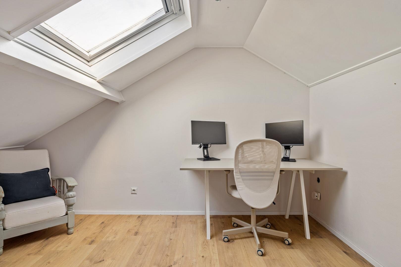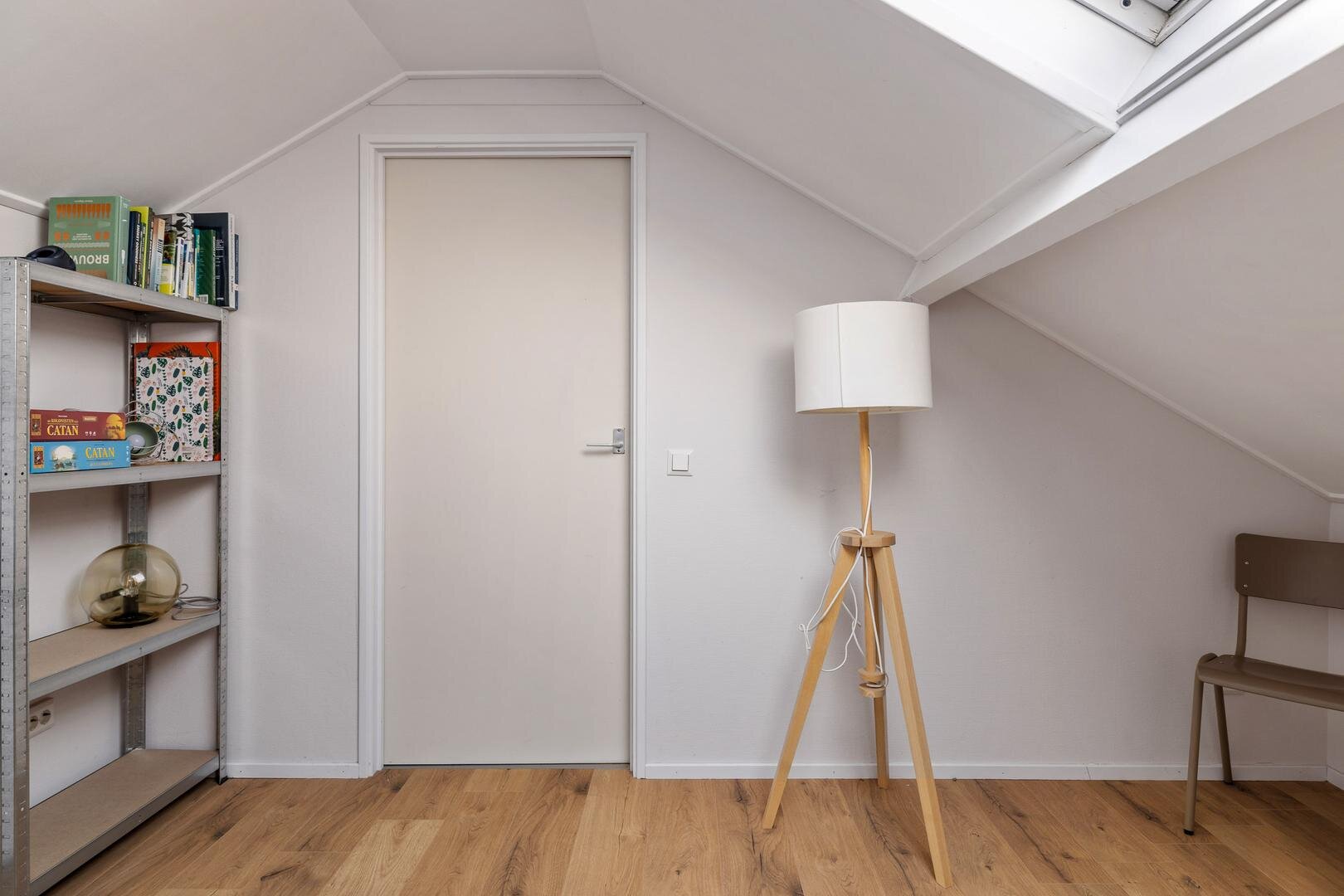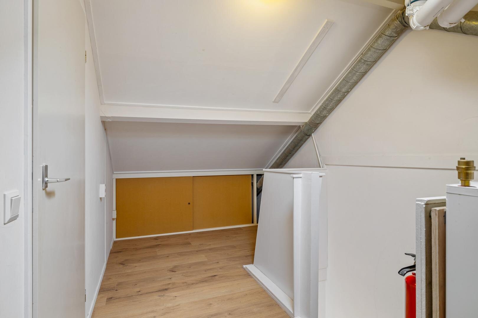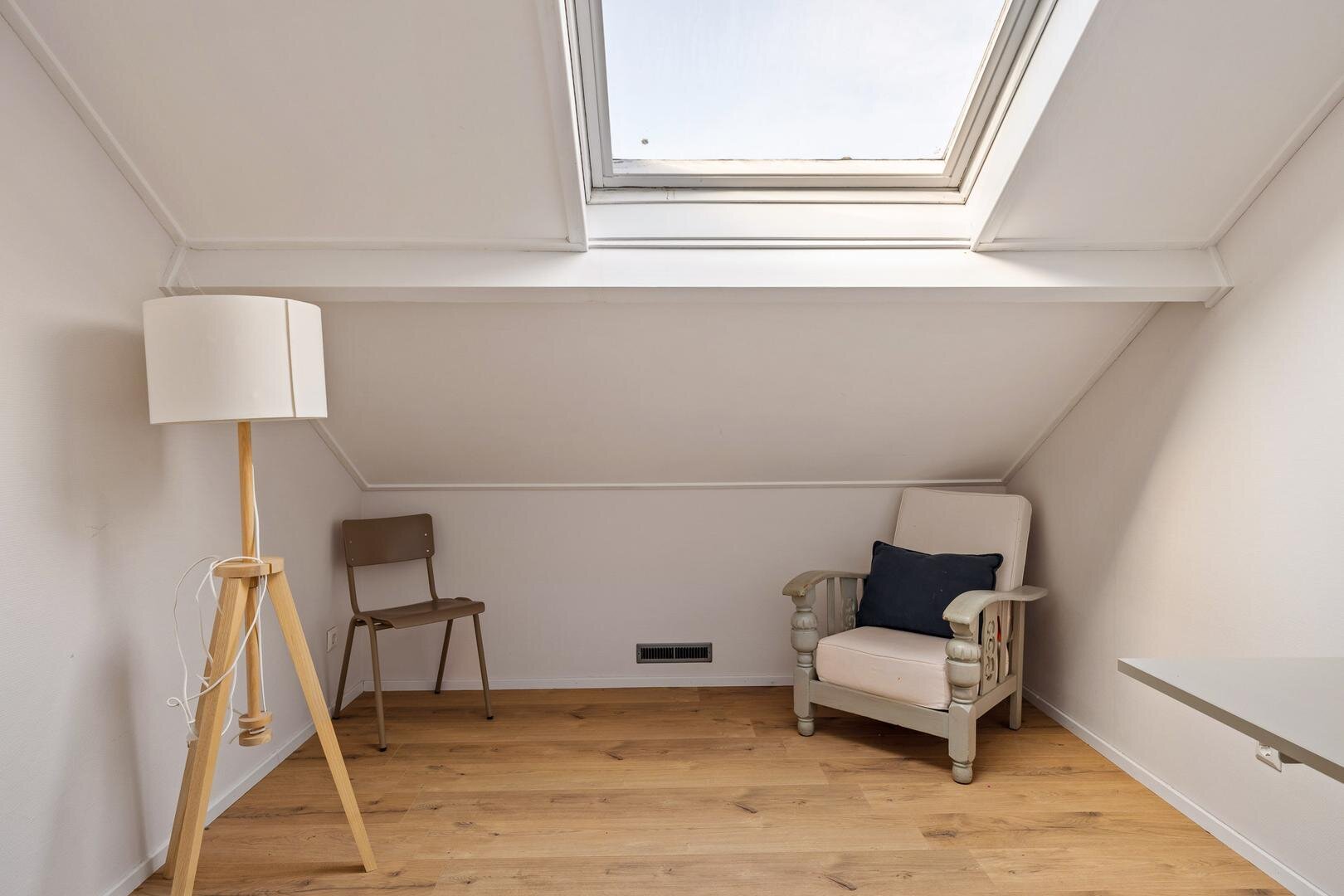 Via weer een vaste trap gaan we naar de verrassend ruime tweede verdieping. Hier bevindt zich de vierde slaapkamer. De knieschotten zorgen hier bovendien voor fijn veel bergruimte.