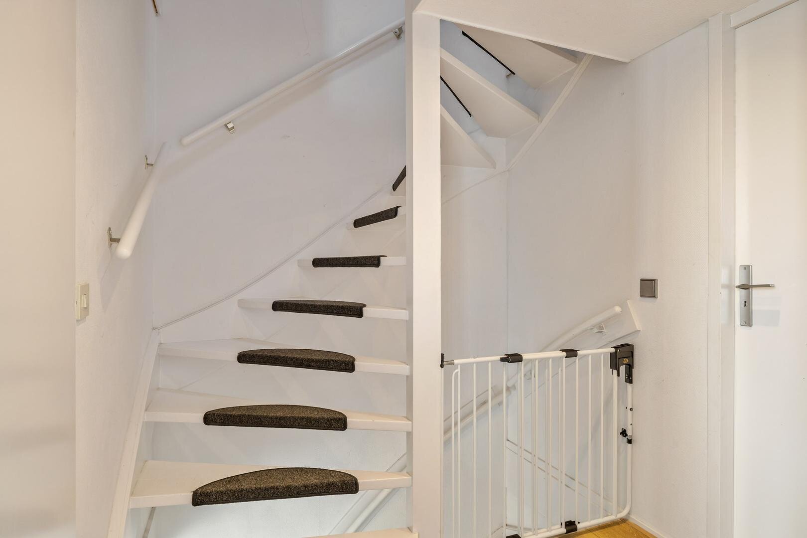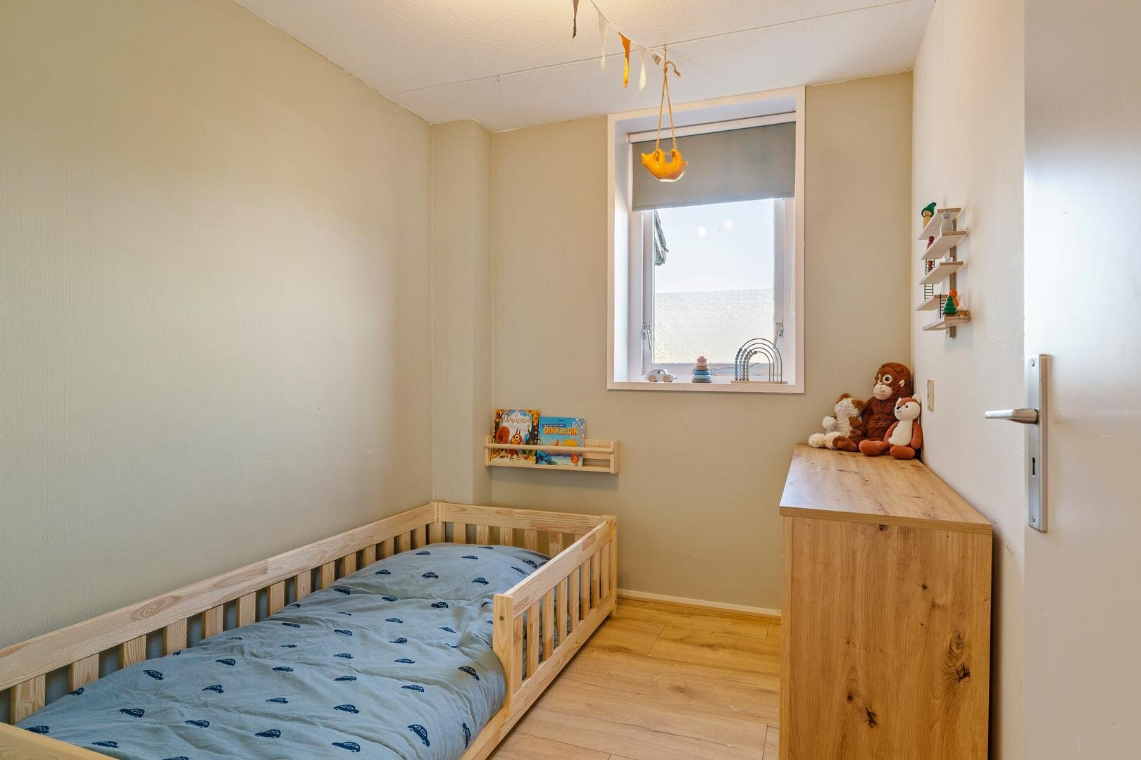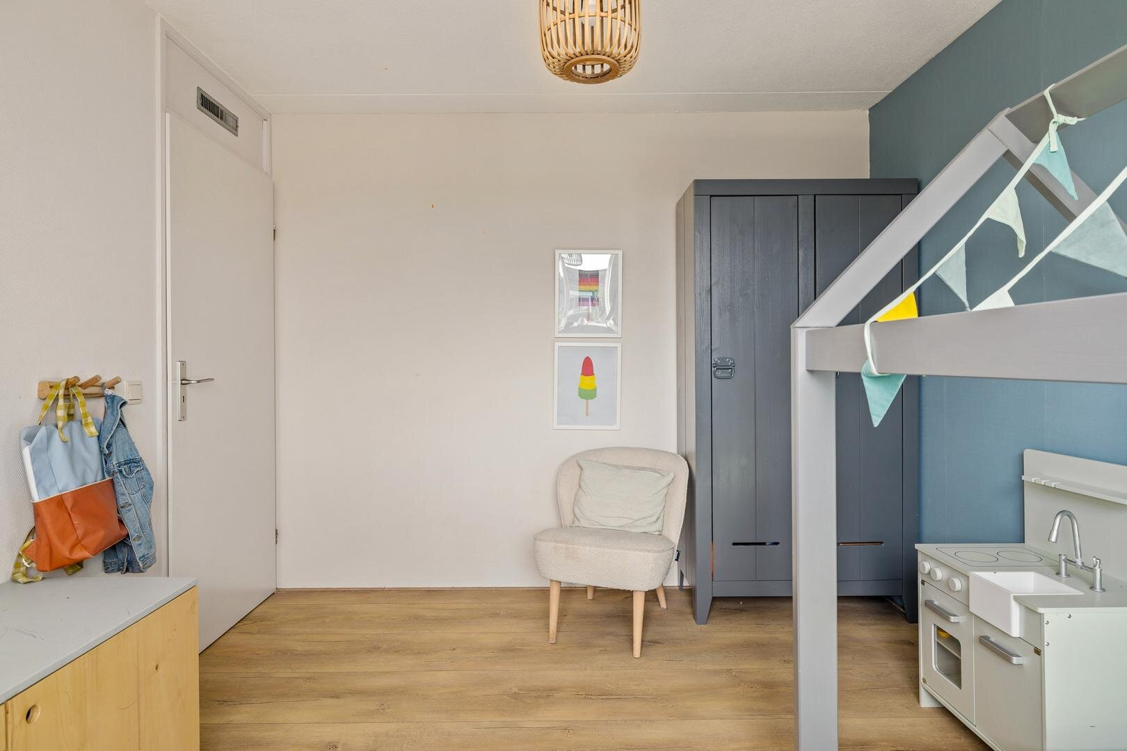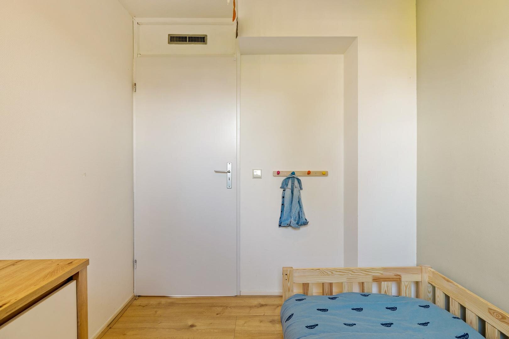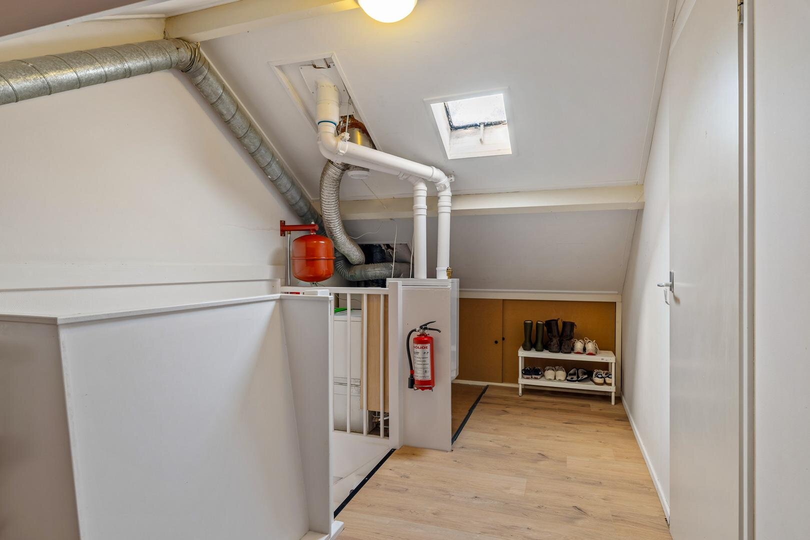 Via weer een vaste trap gaan we naar de verrassend ruime tweede verdieping. Hier bevindt zich de vierde slaapkamer. De knieschotten zorgen hier bovendien voor fijn veel bergruimte.