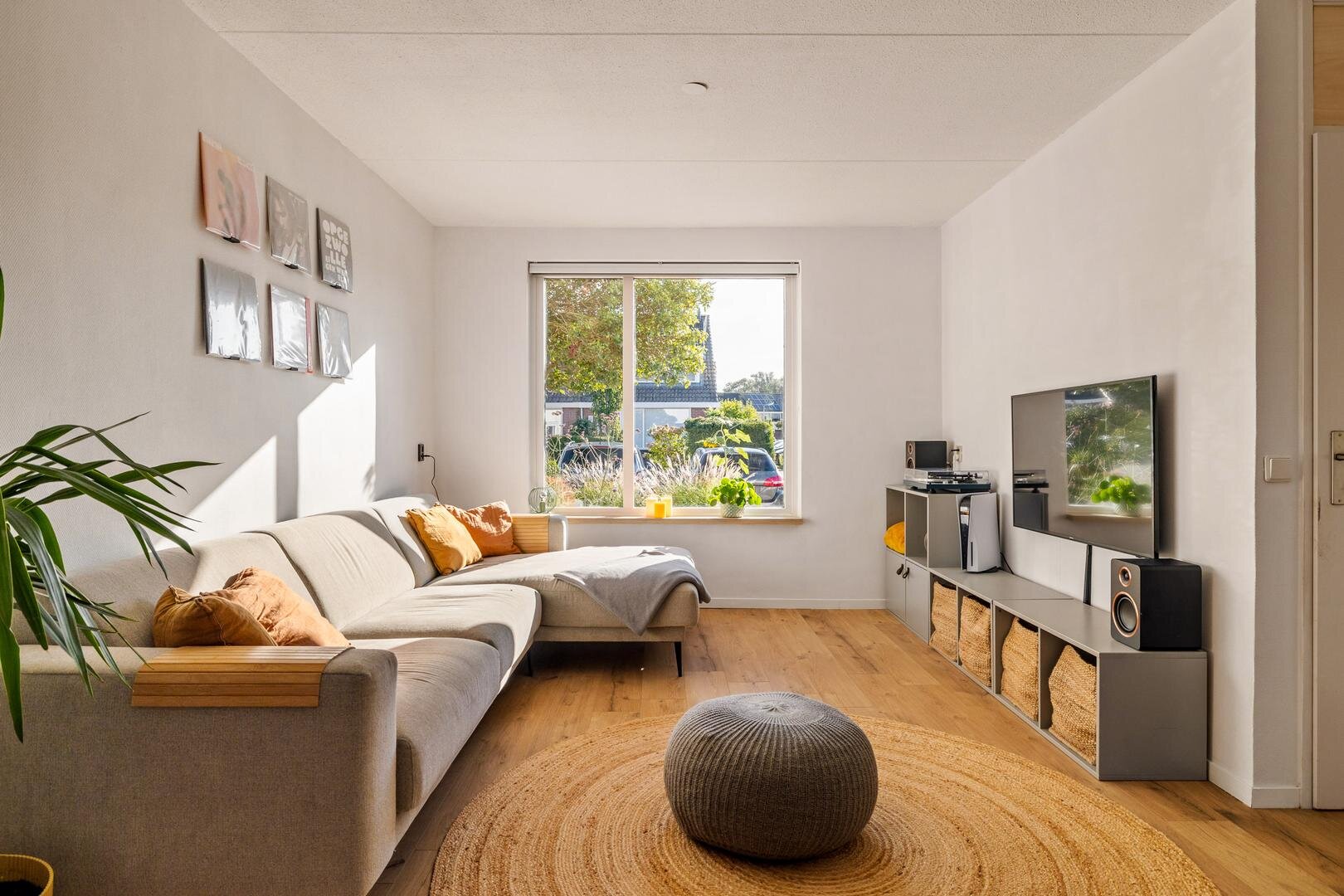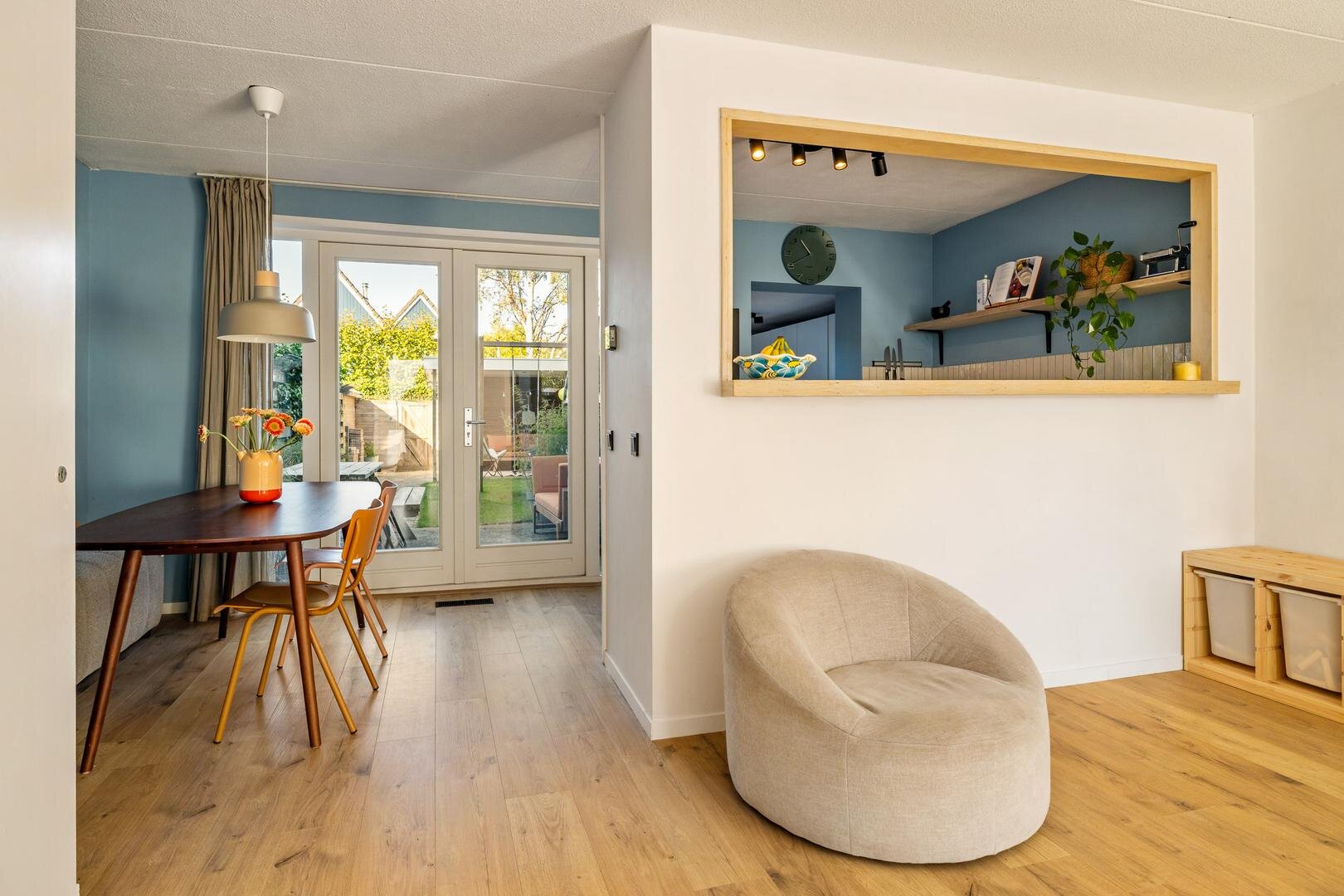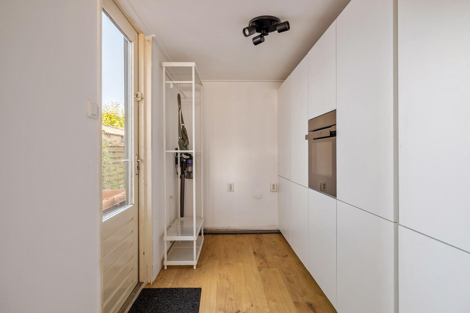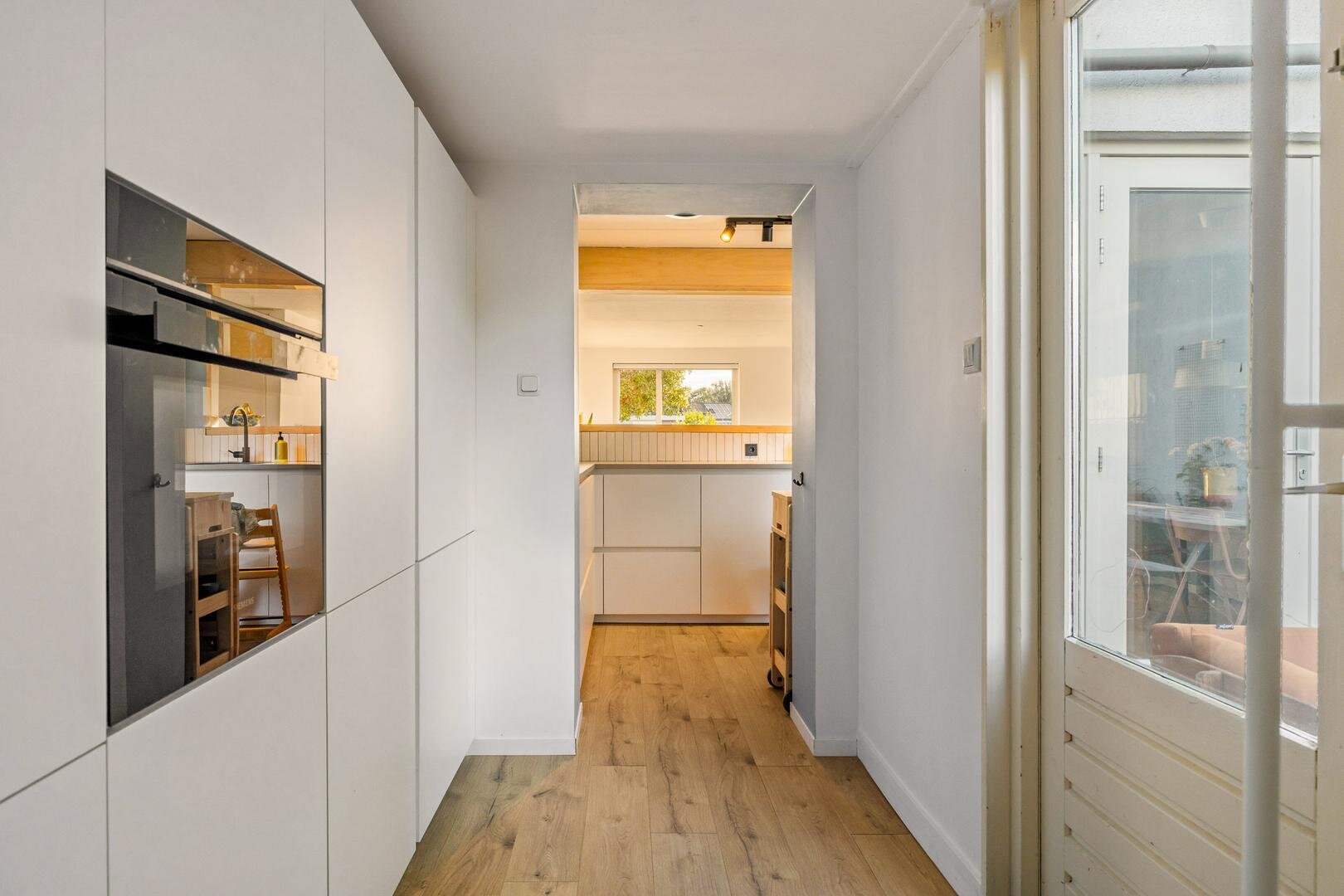 De keuken aan de achterzijde van de woning loopt door in de bijkeuken, kijkt uit over de tuin en is voorzien van de nodige inbouwapparatuur. Zo zijn er een ingebouwde koel-vriescombinatie, vaatwasser maar ook een combi-oven en een inductie kookplaat met geïntegreerde afzuiging. In de bijkeuken is ruimte voor het witgoed en voor opslag. De woonkamer zelf is ruim en sfeervol en op de hele begane grond ligt een strakke laminaatvloer.