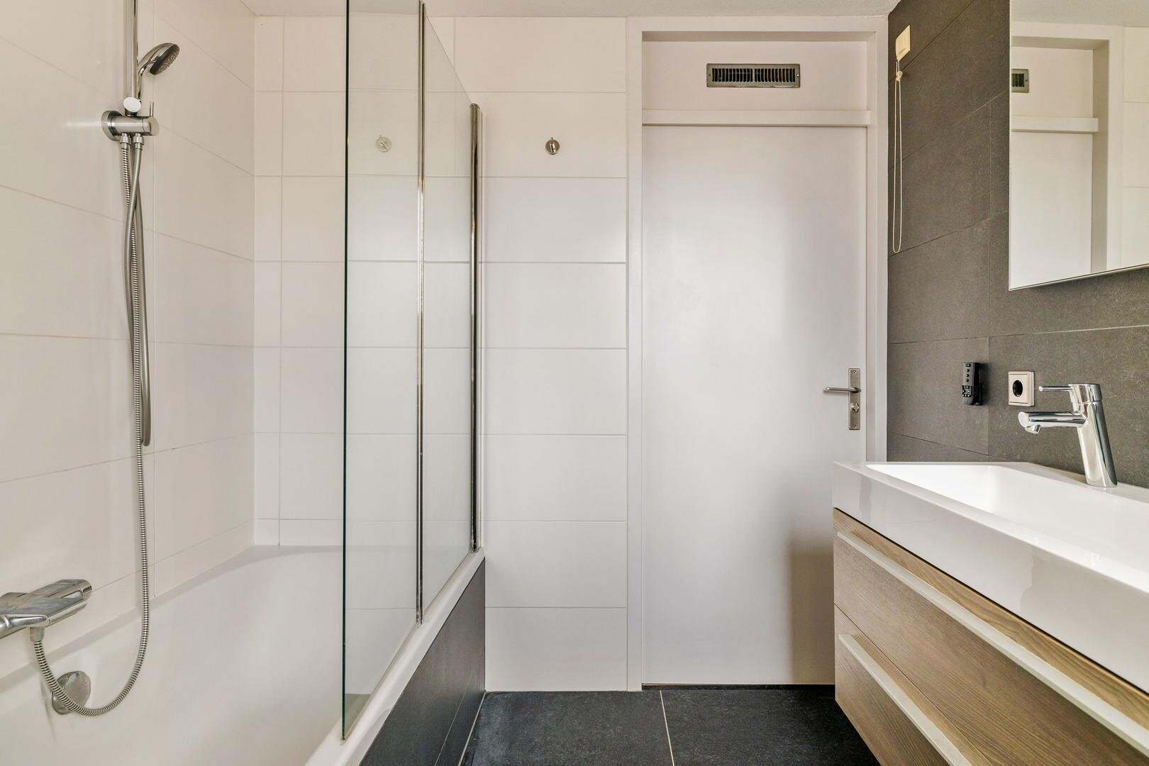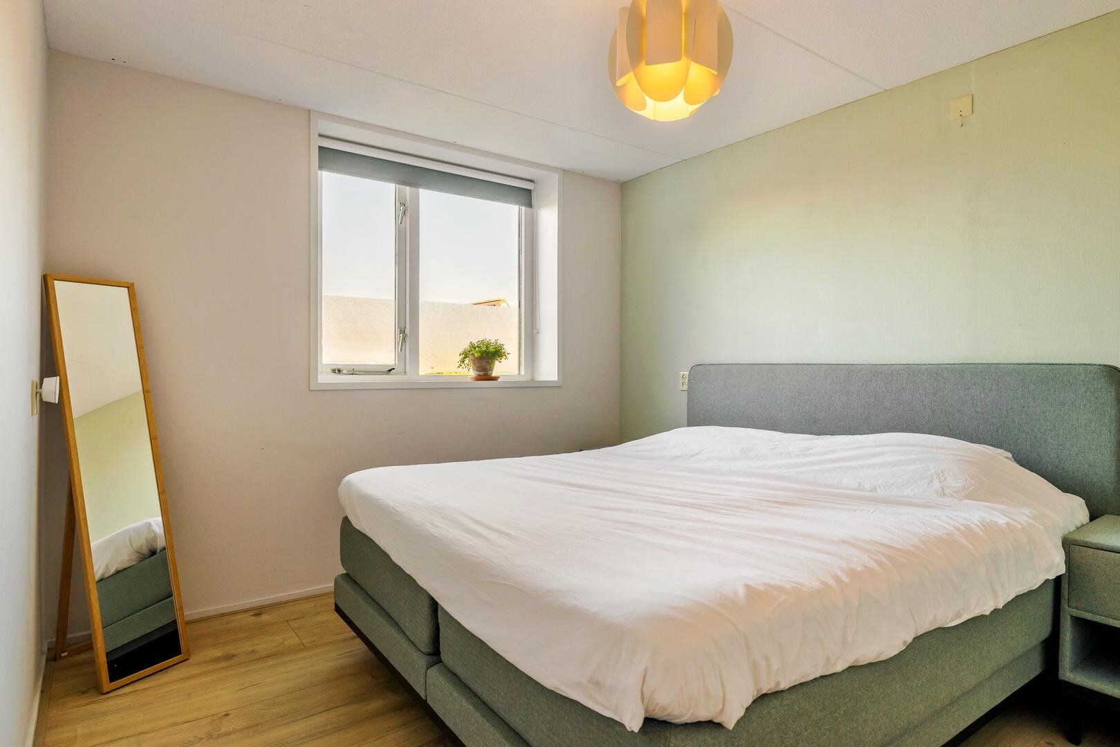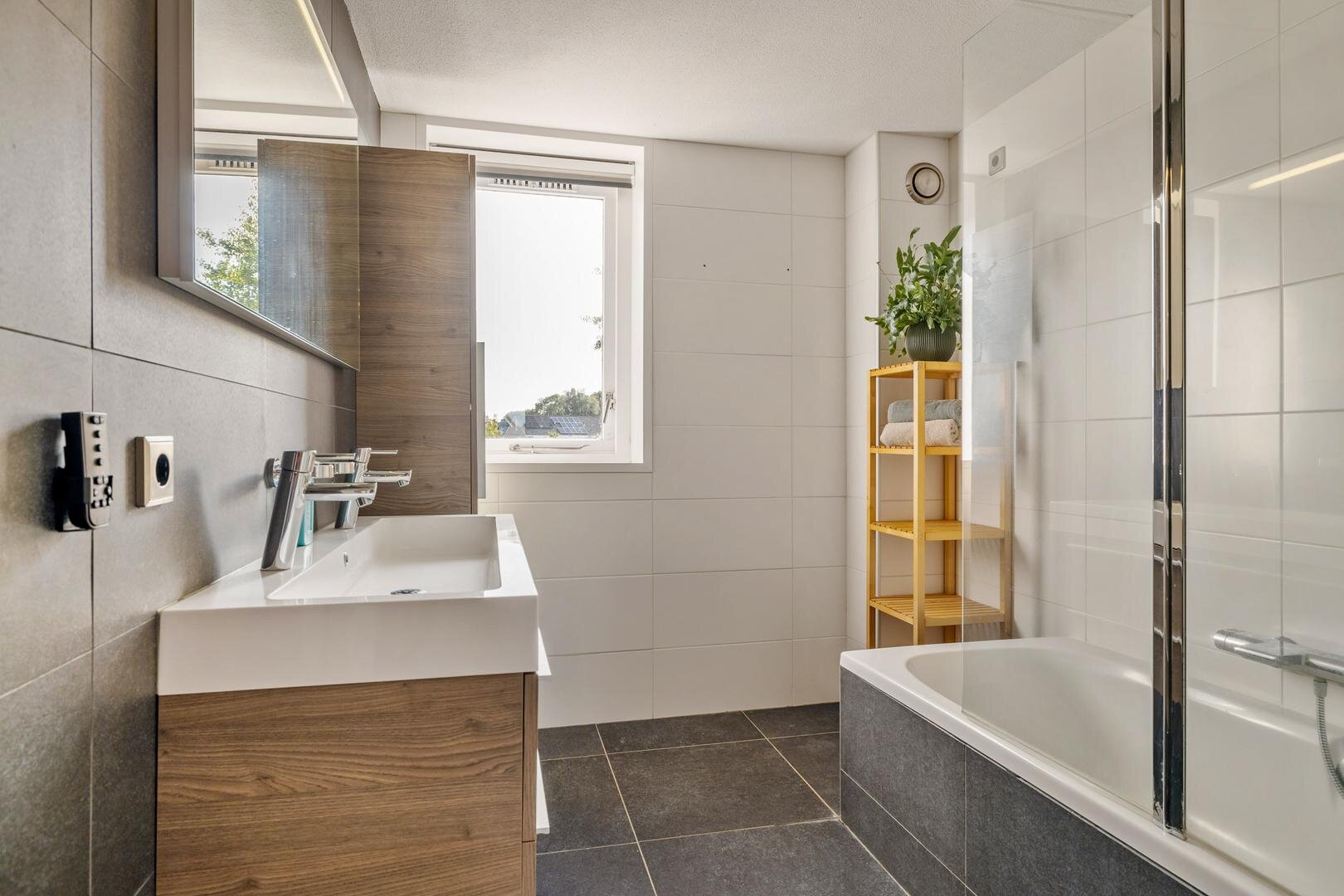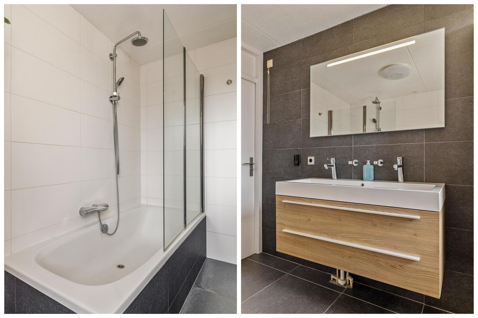 Via een vaste trap gaan we naar de eerste verdieping. Aan de achterzijde vind je twee ruime slaapkamers met een mooie lichtinval. Aan de voorzijde is de master bedroom. Deze is zeer ruim en geeft zicht over de straat. De badkamer is strak en functioneel ingericht. Je vindt hier een ligbad met douche en een dubbele wastafel.