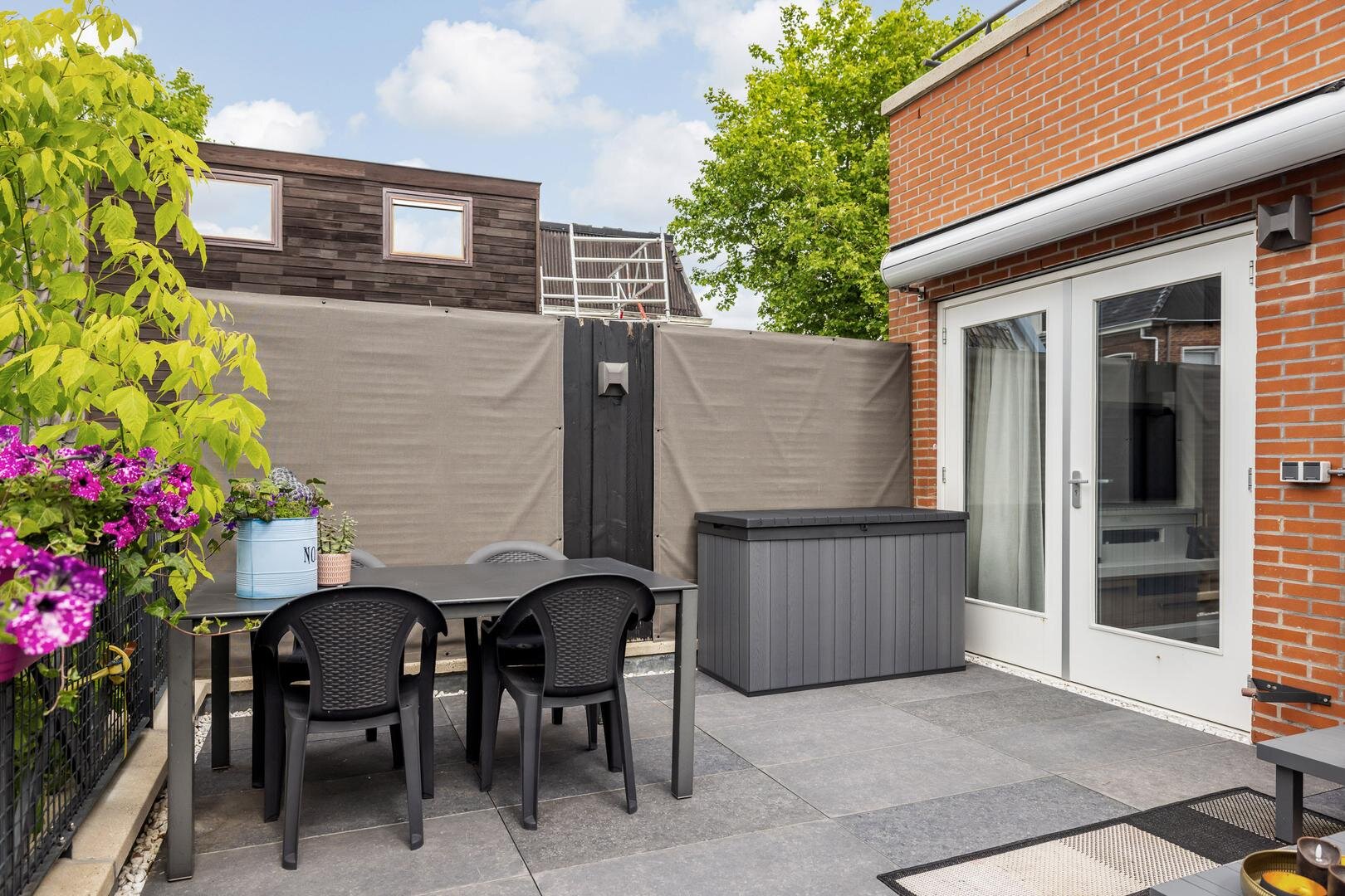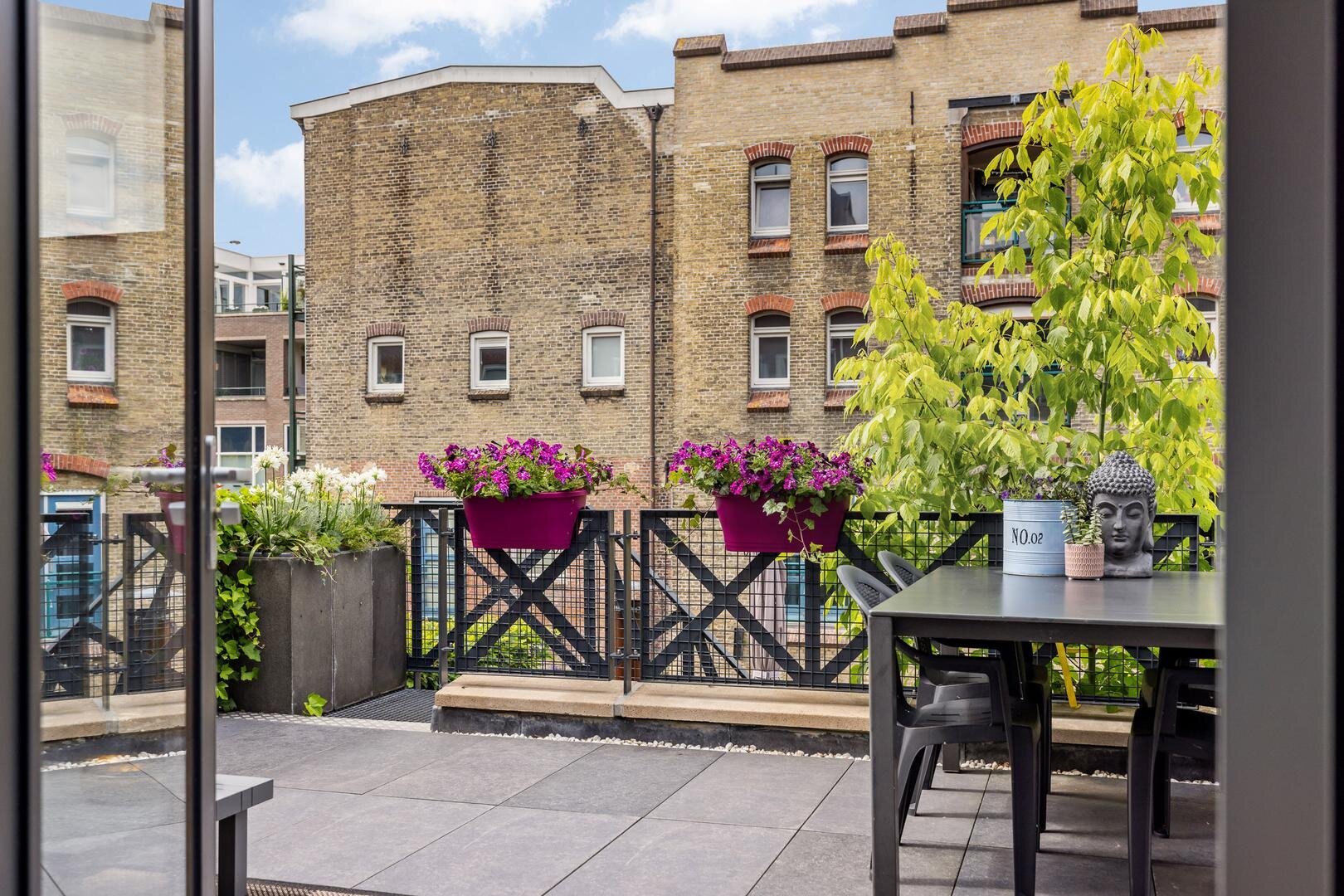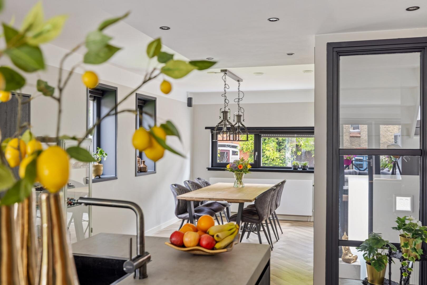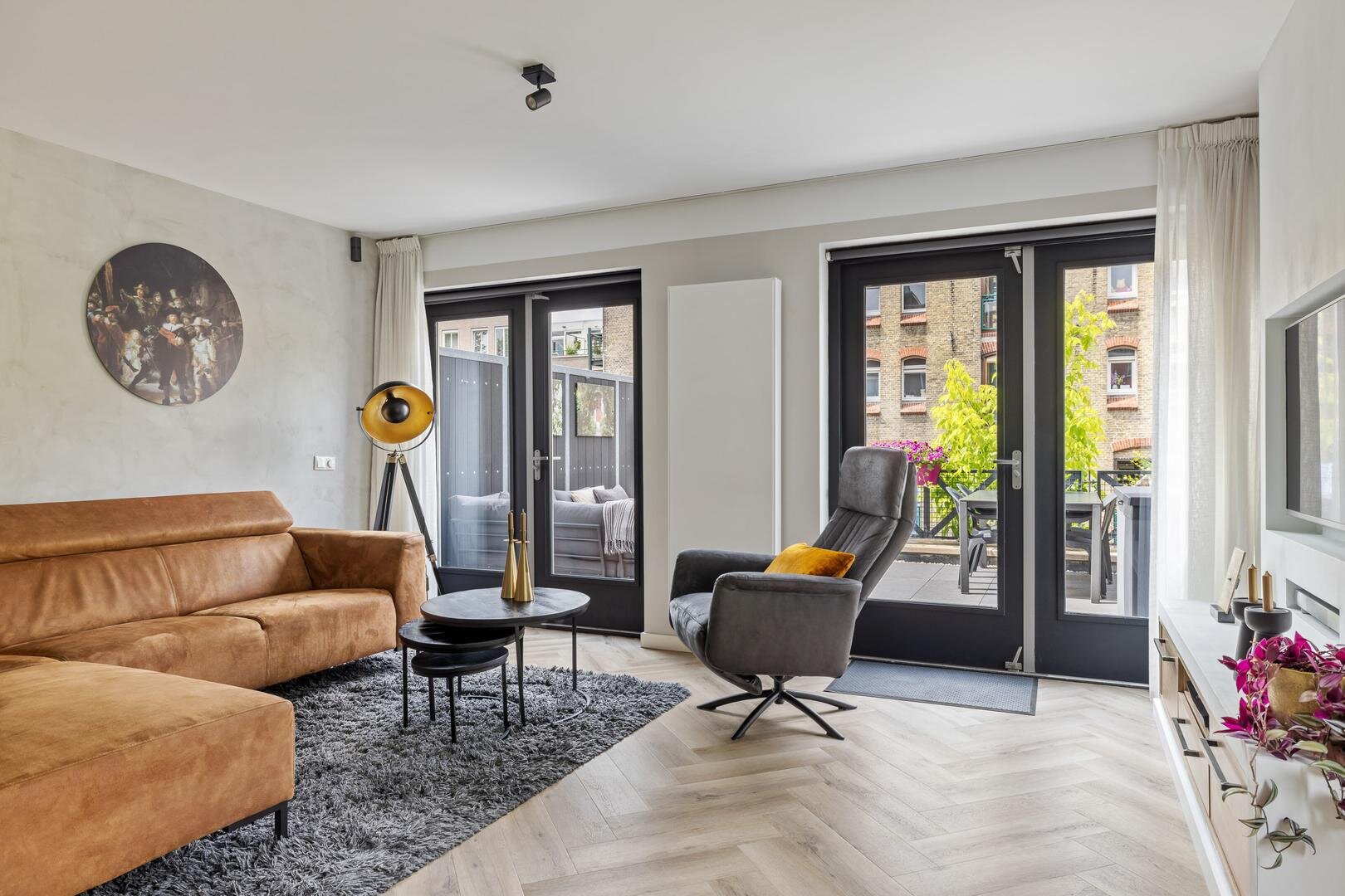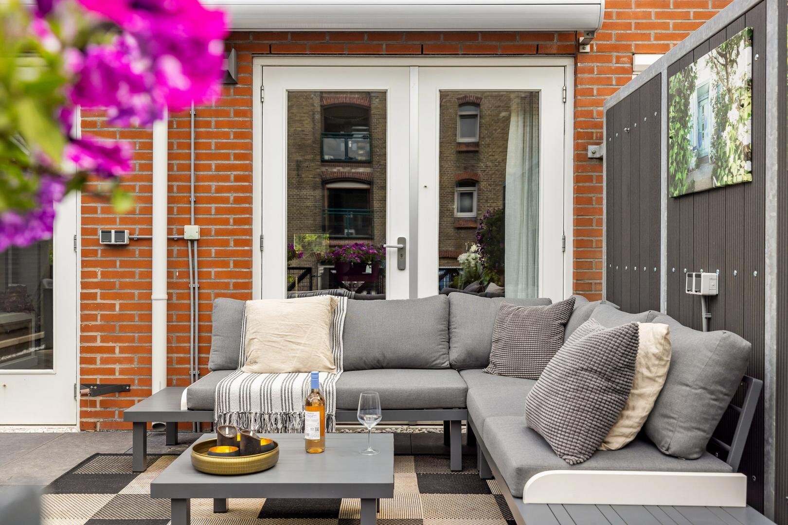 - Tuingerichte woonkamer met dubbele tuindeuren die toegang geven tot de zonnige stadstuin;