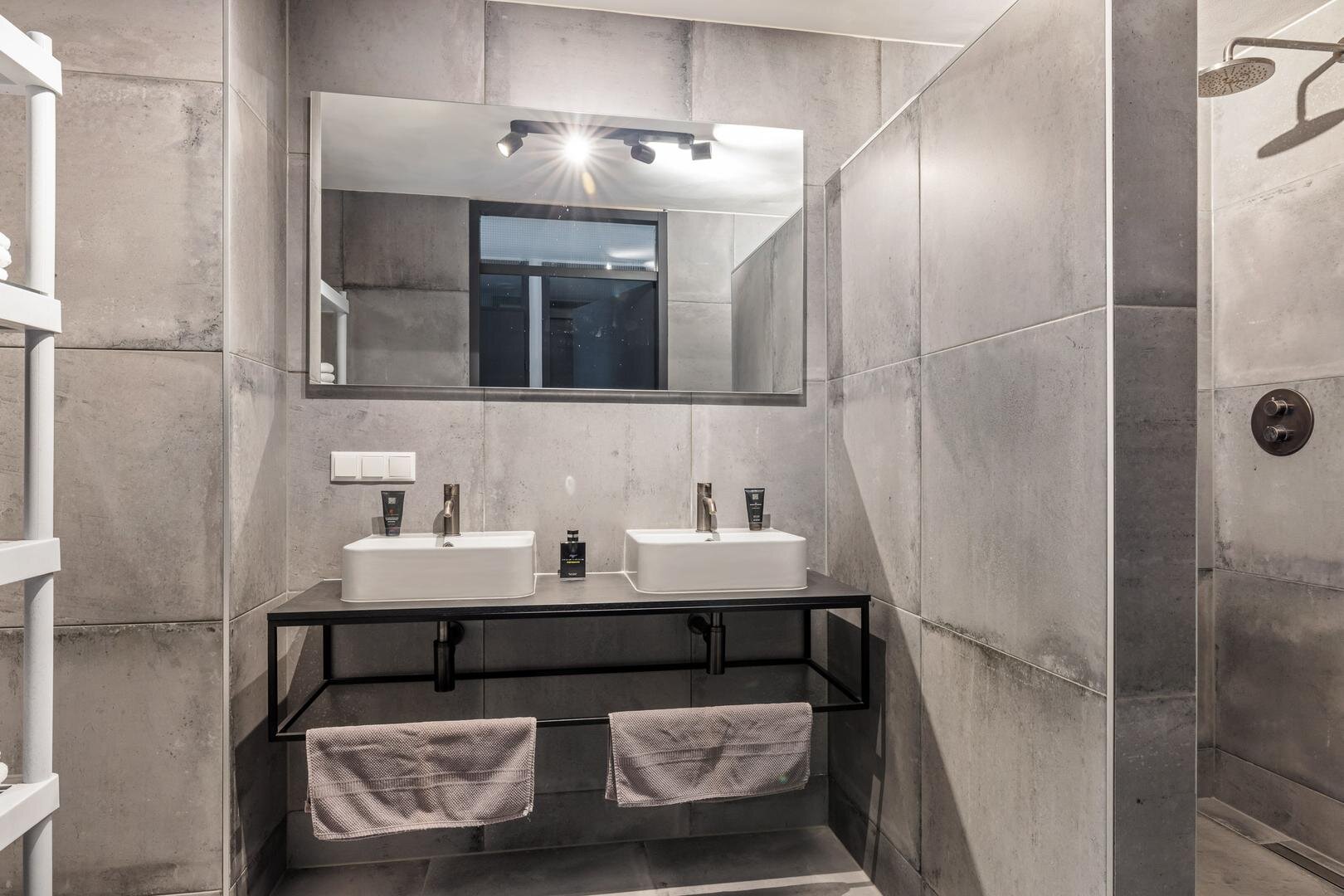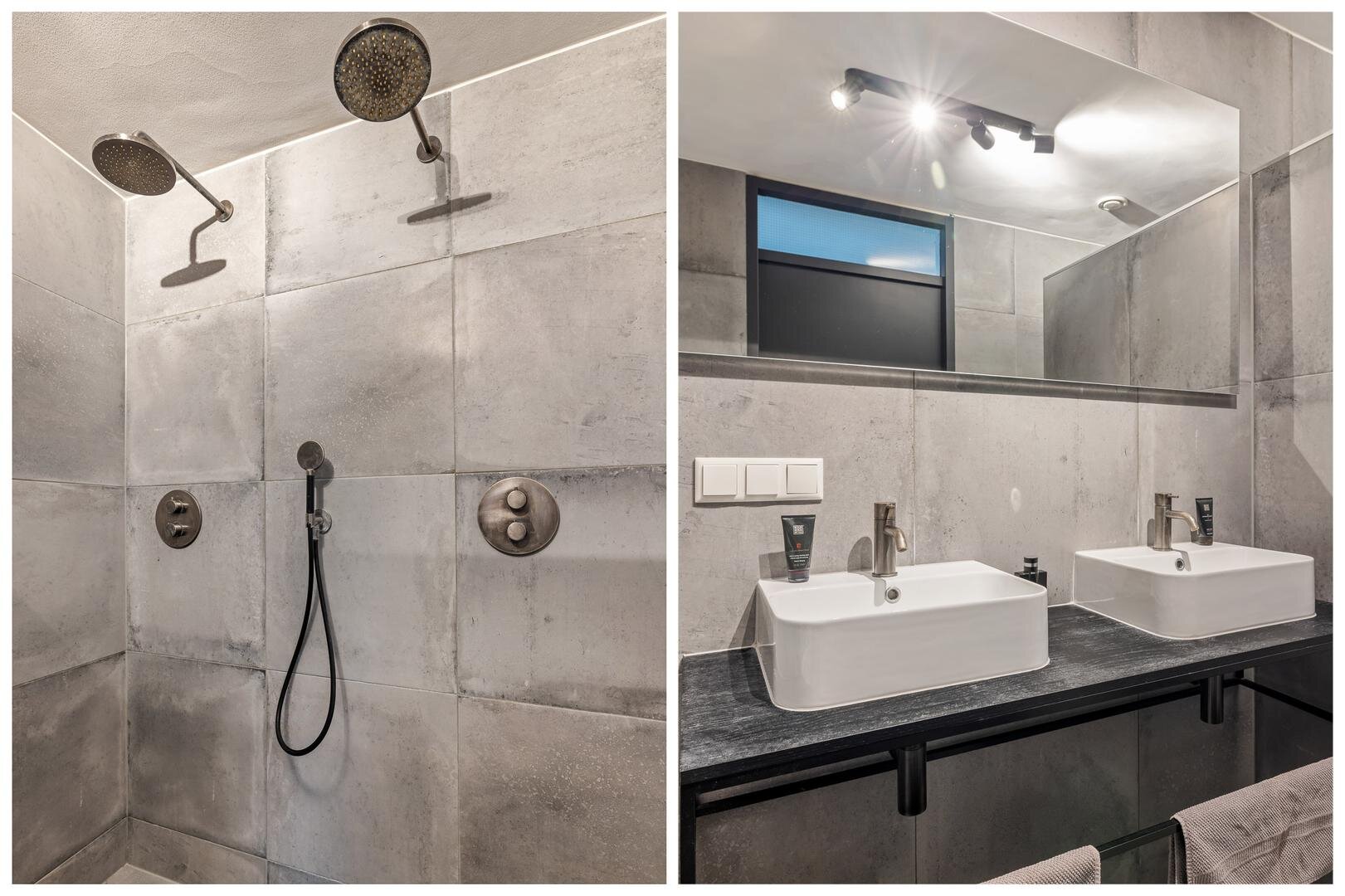 - Badkamer met dubbele wastafel, inloopdouche met dubbele regendouche en handdouche en elektrische vloerverwarming.