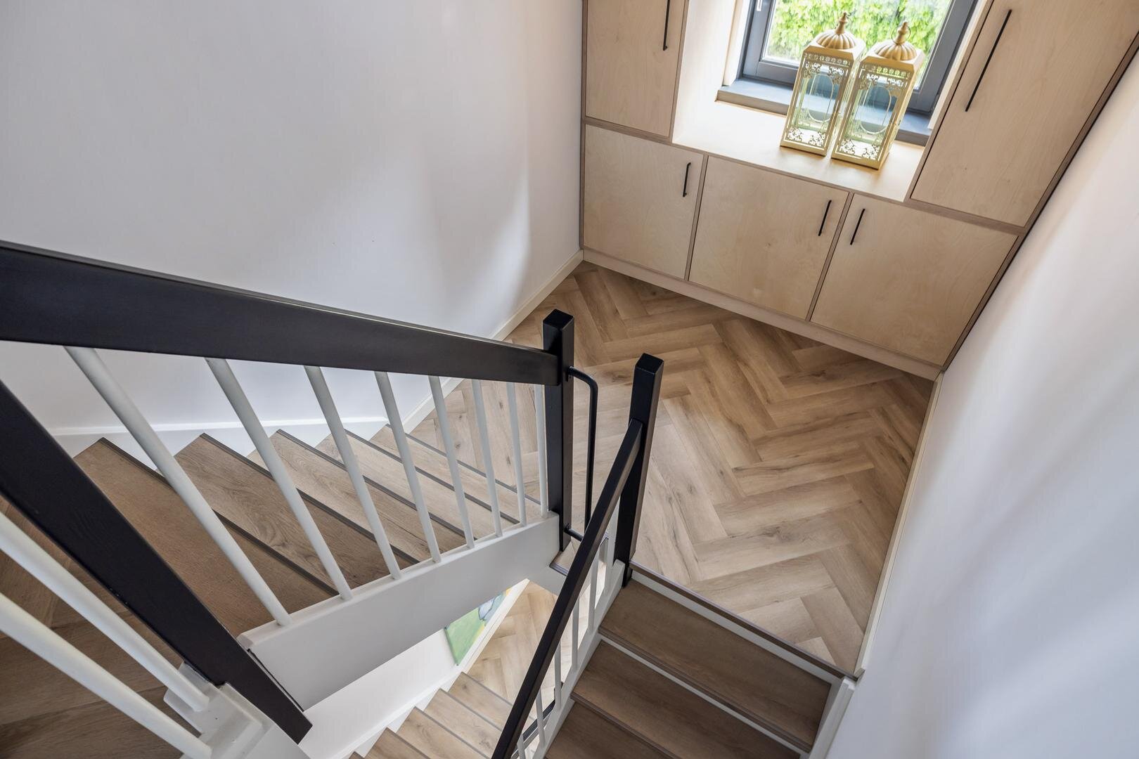 - Trappartij met raam en op maat gemaakte kasten;