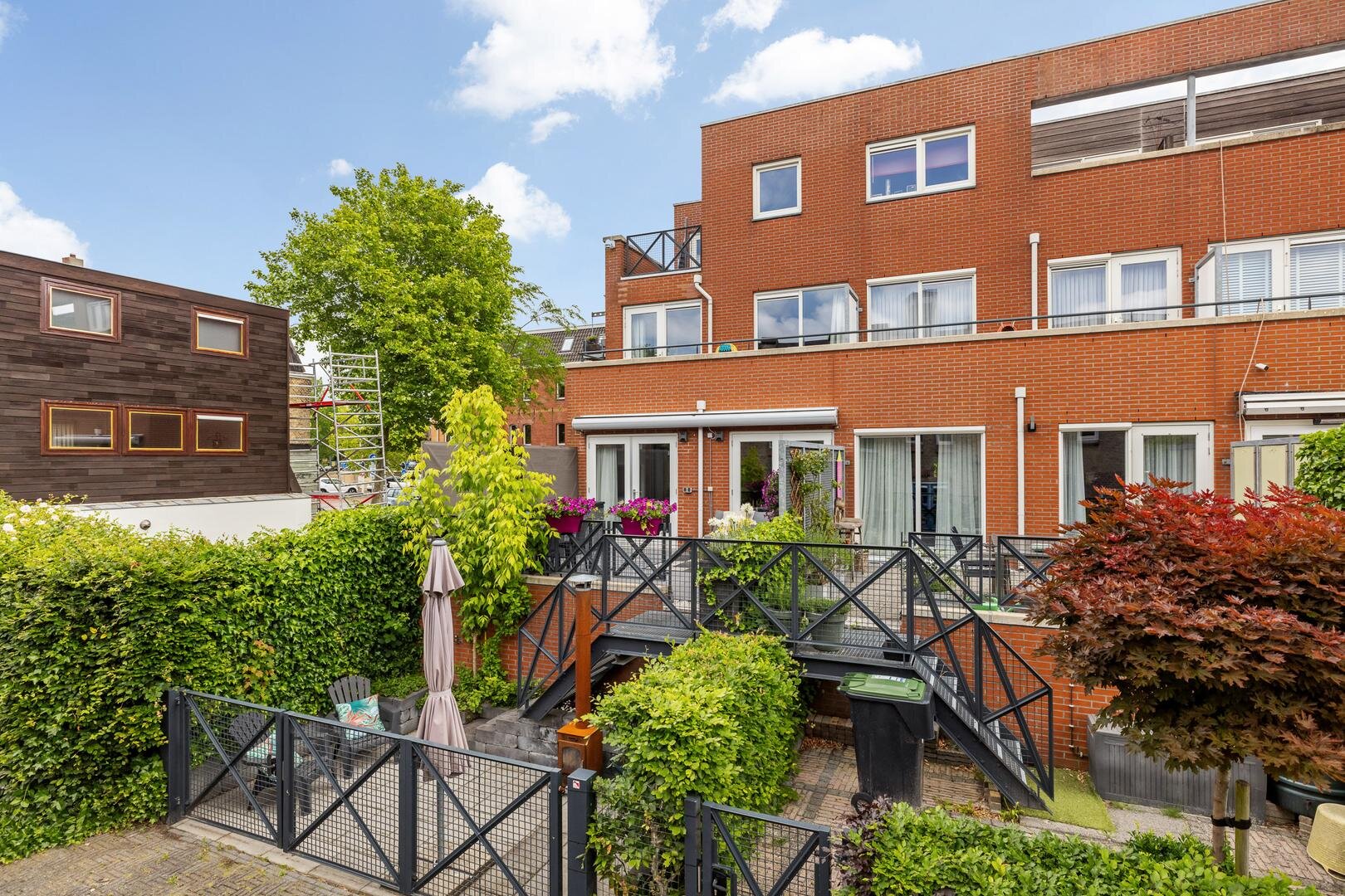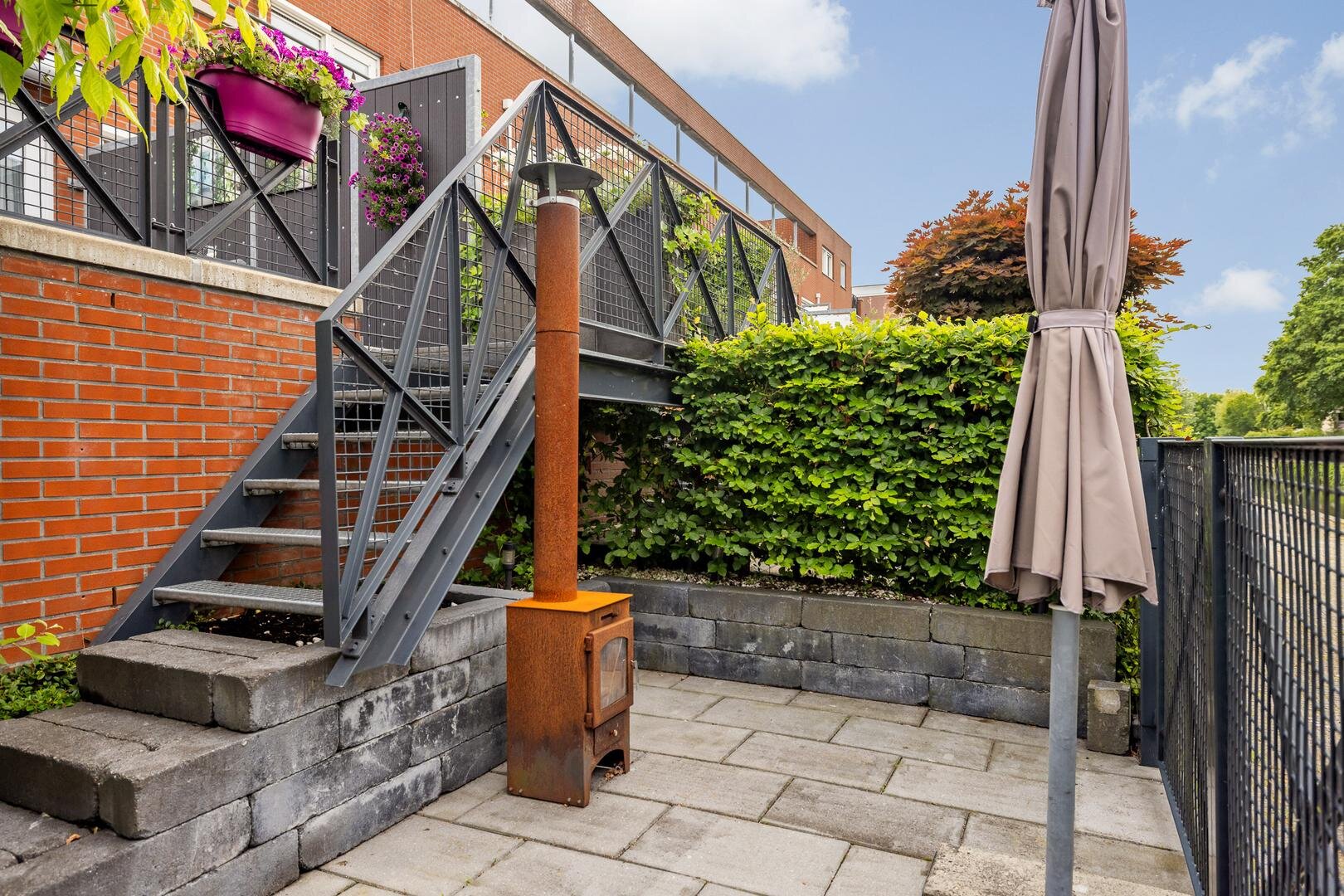 - Stadstuin in twee niveaus, bestaande uit een beschutte tuin v.v. zwevend terras met keramische tegels en een verlaagd deel met tweede terras (afsluitbaar met een hek).