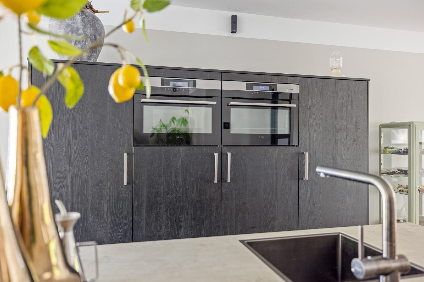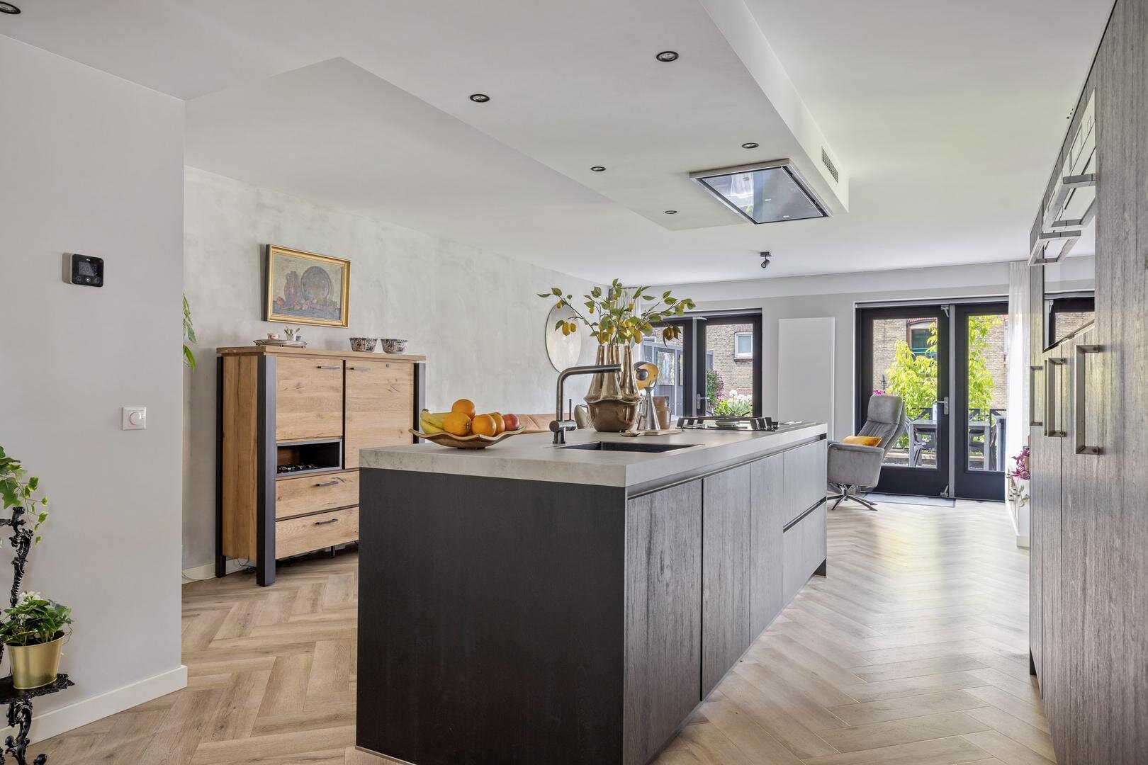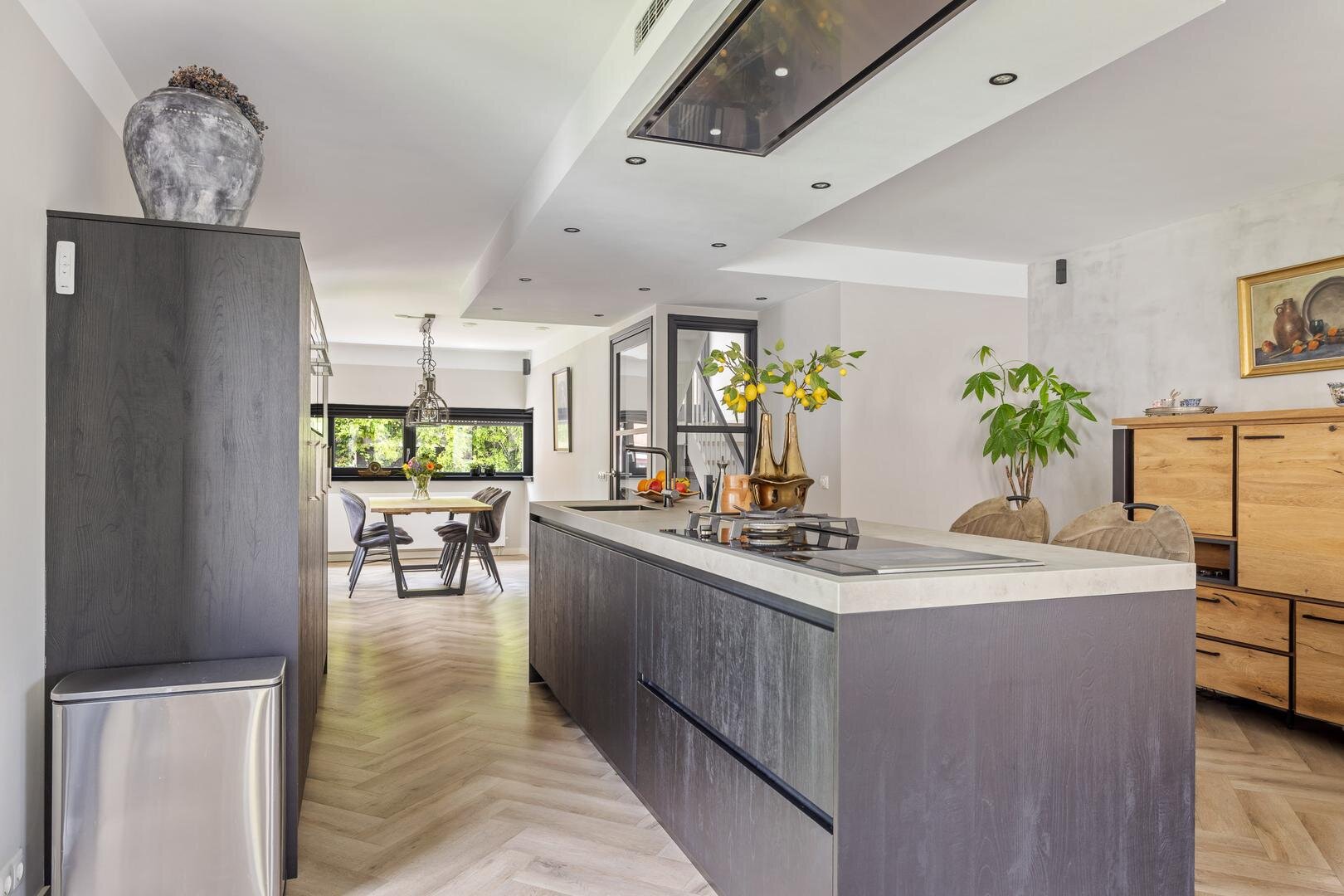- Centraal opgestelde keuken met kook- en spoeleiland v.v. inductie kookplaat, wok-kookpit (gas), teppanyaki-grillplaat, geïntegreerde afzuiger, grote vaatwasser, keukenblok met combi-oven, stoomoven, grote koelkast en vrieskast;