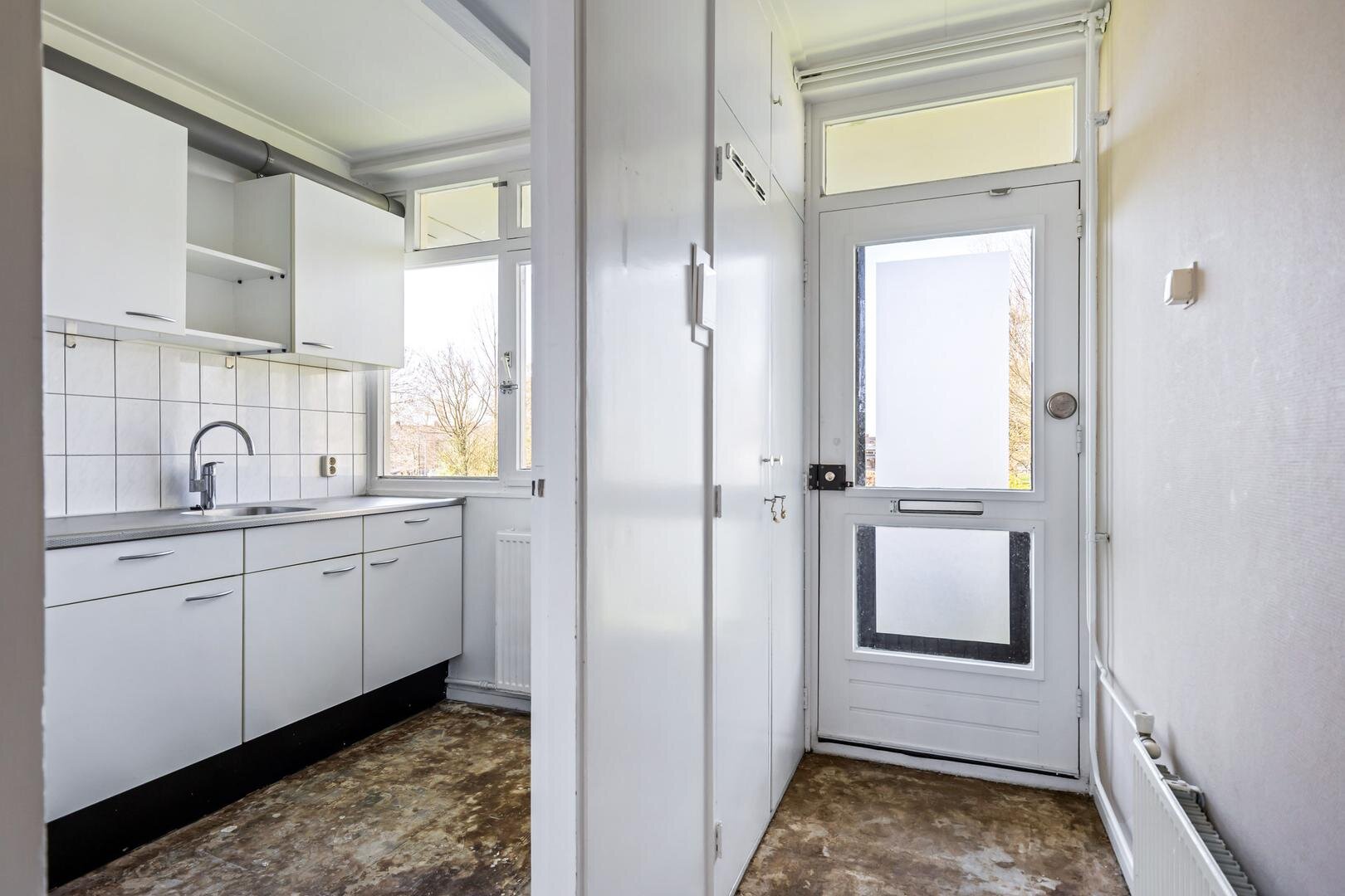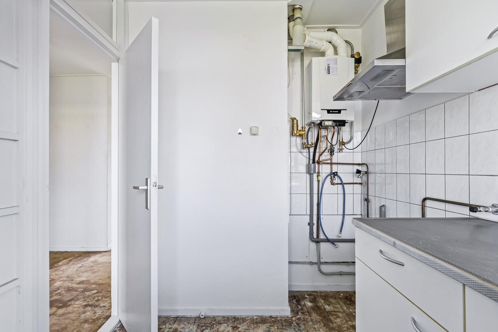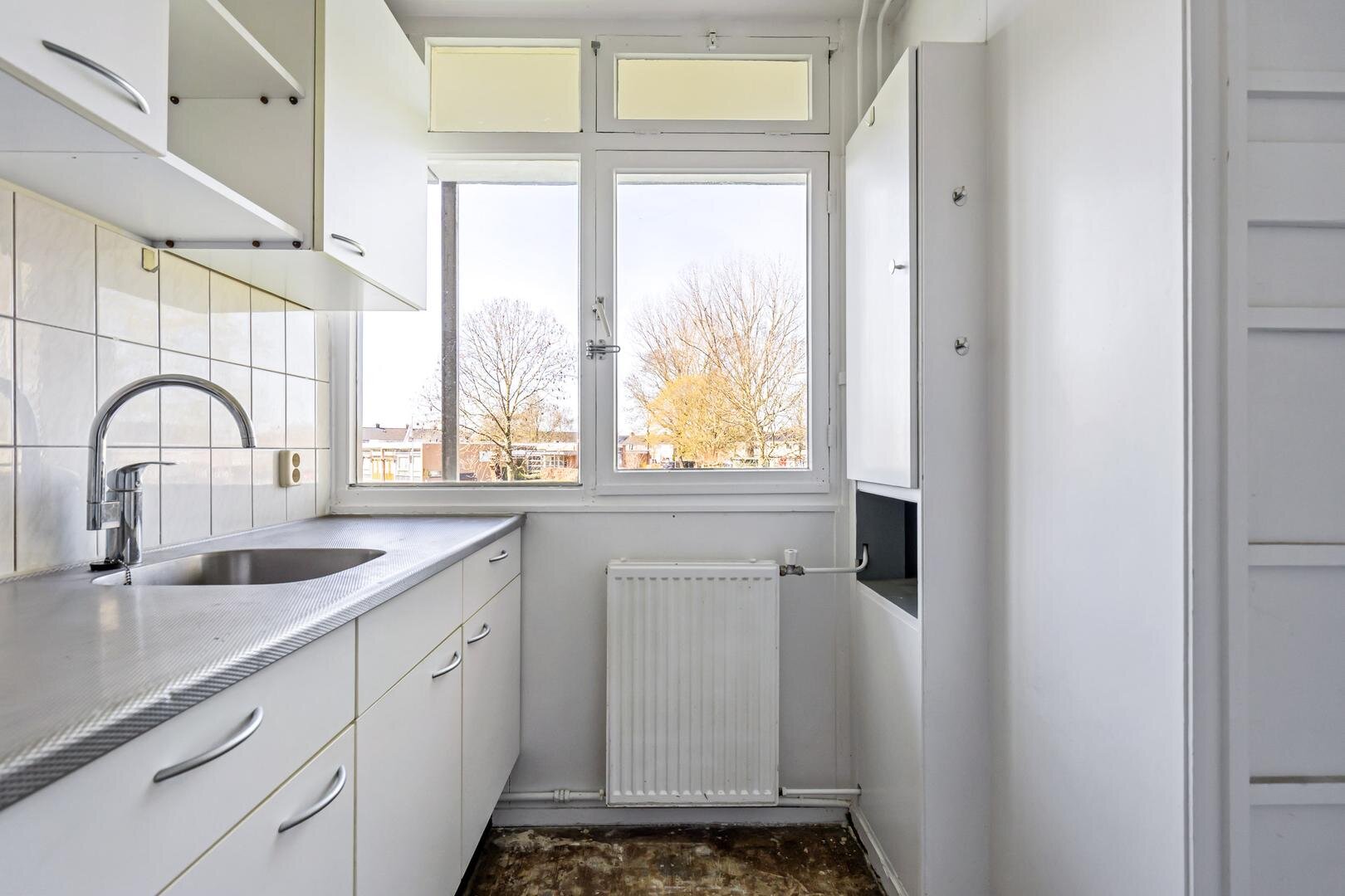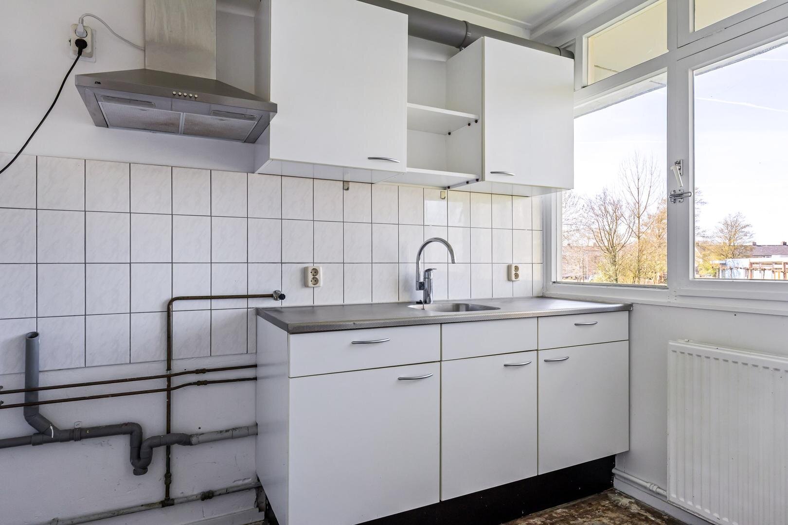 De keuken is praktisch ingericht en vormt een goede basis voor wie deze wil vernieuwen naar eigen smaak.