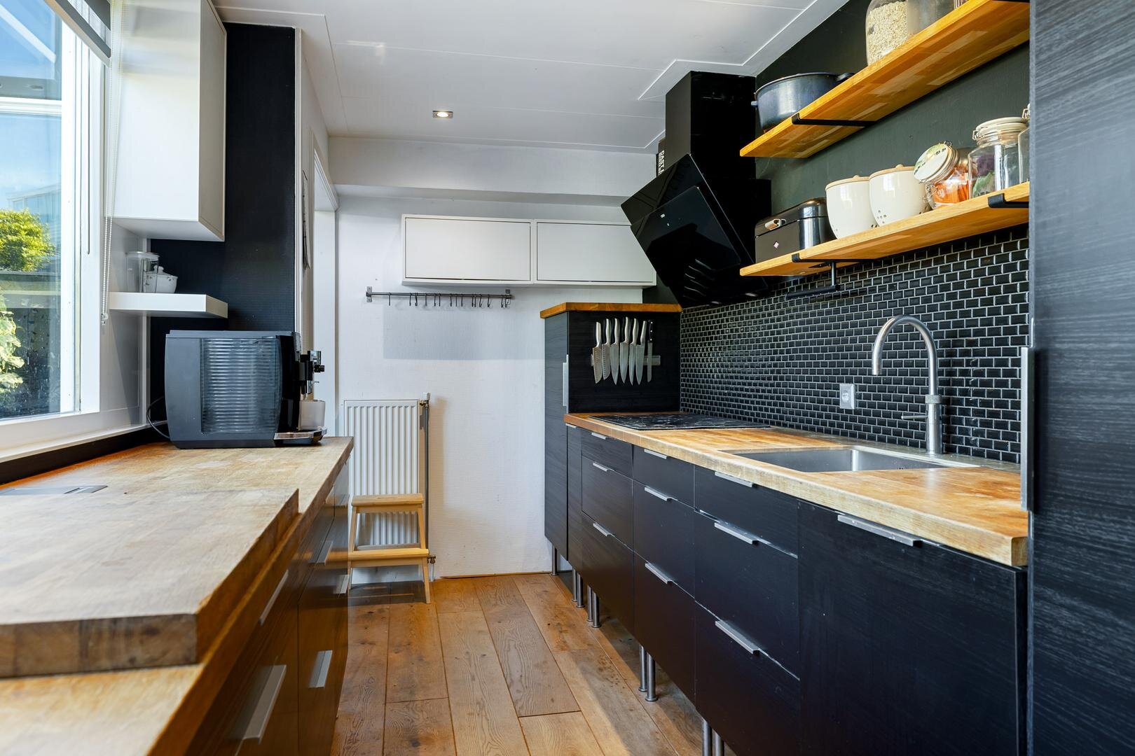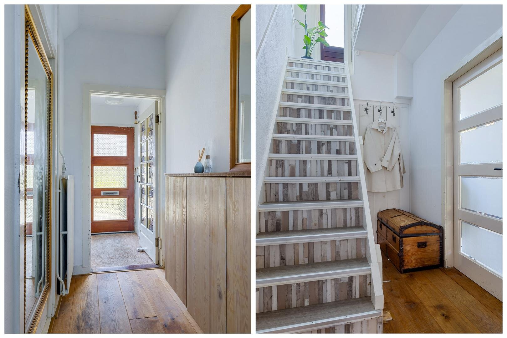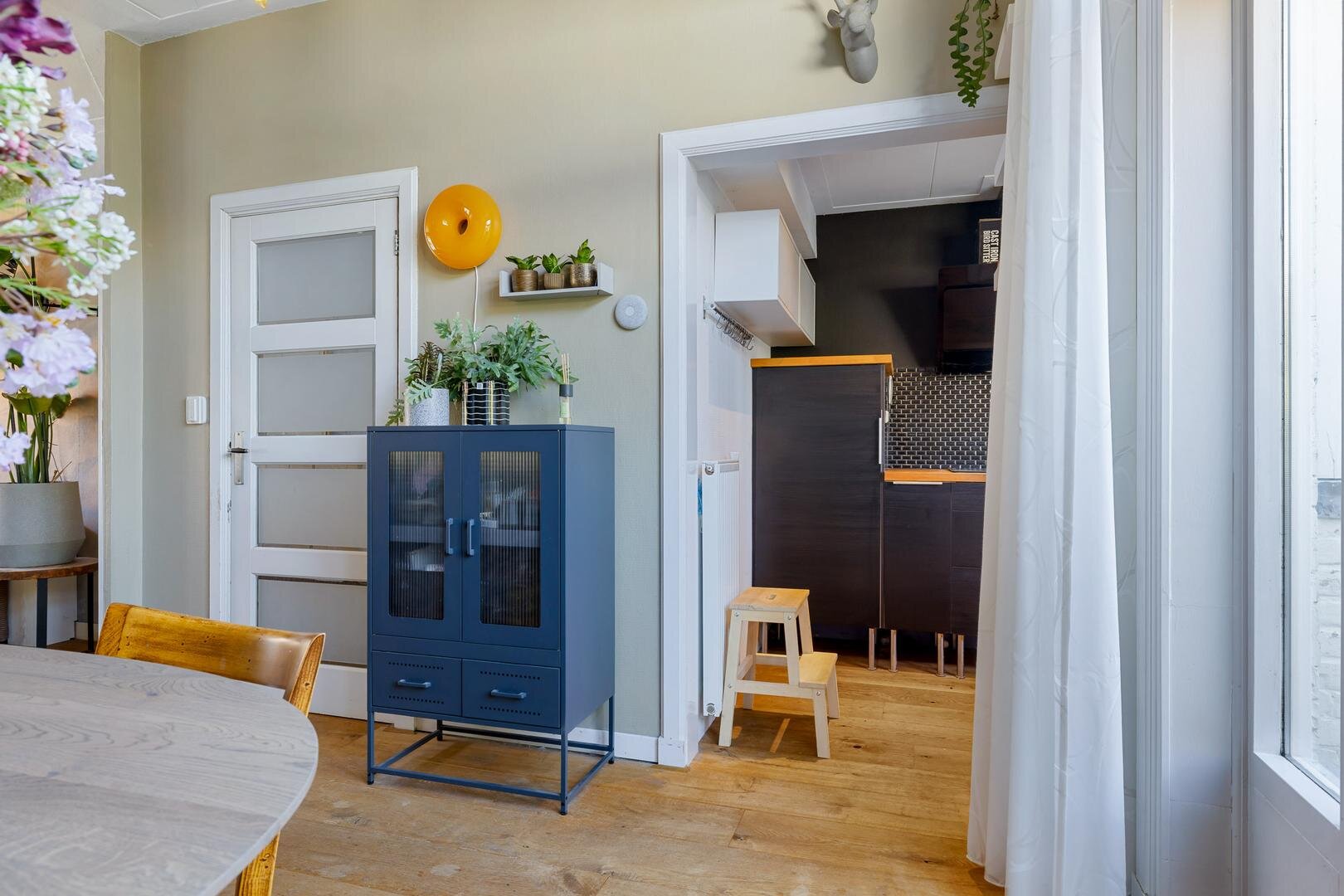 Je komt binnen via de entree met tochtportaal, waar de originele glas-in-looddeuren direct in het oog springen. De woonkamer is licht en sfeervol, met een erker aan de voorzijde en voldoende ruimte voor een gezellige zit- en eethoek. De keuken (2013) is strak uitgevoerd en voorzien van diverse inbouwapparatuur, waaronder vaatwasser, heteluchtoven, combimagnetron, Quooker en koelkast. In 2021 zijn de inductiekookplaat en afzuigkap nieuw geplaatst. Aansluitend bevindt zich de praktische bijkeuken met witgoedaansluitingen en de cv-opstelling.