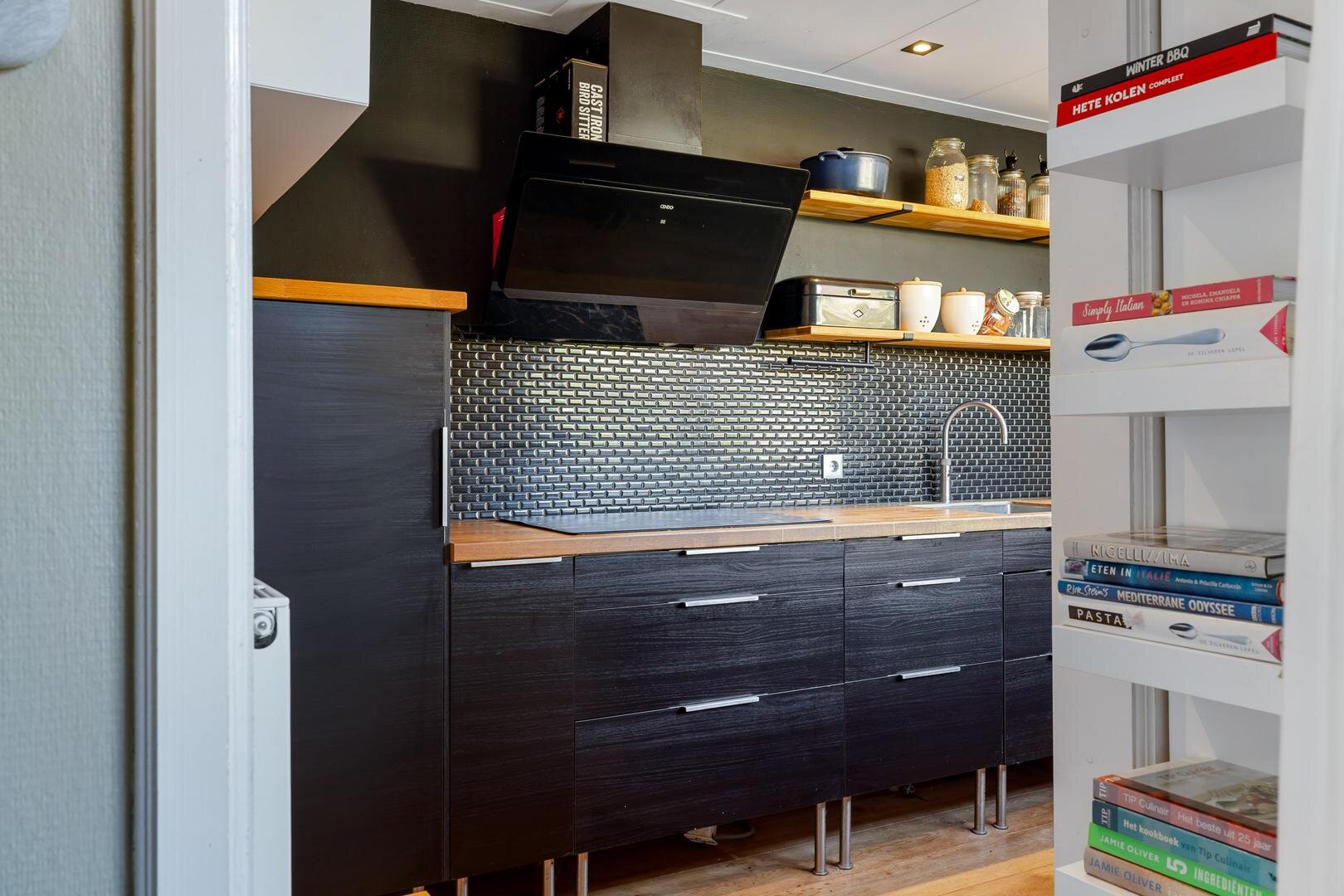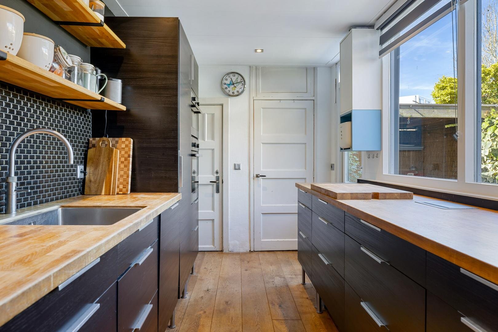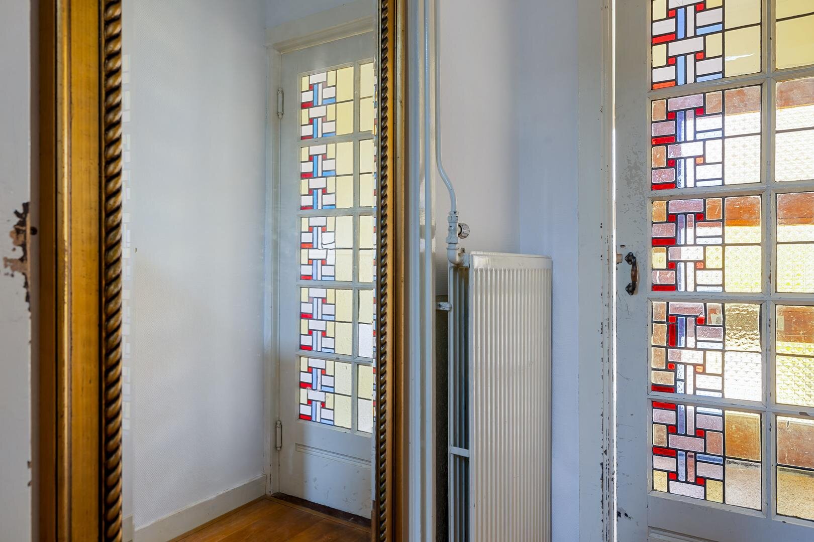 Je komt binnen via de entree met tochtportaal, waar de originele glas-in-looddeuren direct in het oog springen. De woonkamer is licht en sfeervol, met een erker aan de voorzijde en voldoende ruimte voor een gezellige zit- en eethoek. De keuken (2013) is strak uitgevoerd en voorzien van diverse inbouwapparatuur, waaronder vaatwasser, heteluchtoven, combimagnetron, Quooker en koelkast. In 2021 zijn de inductiekookplaat en afzuigkap nieuw geplaatst. Aansluitend bevindt zich de praktische bijkeuken met witgoedaansluitingen en de cv-opstelling.