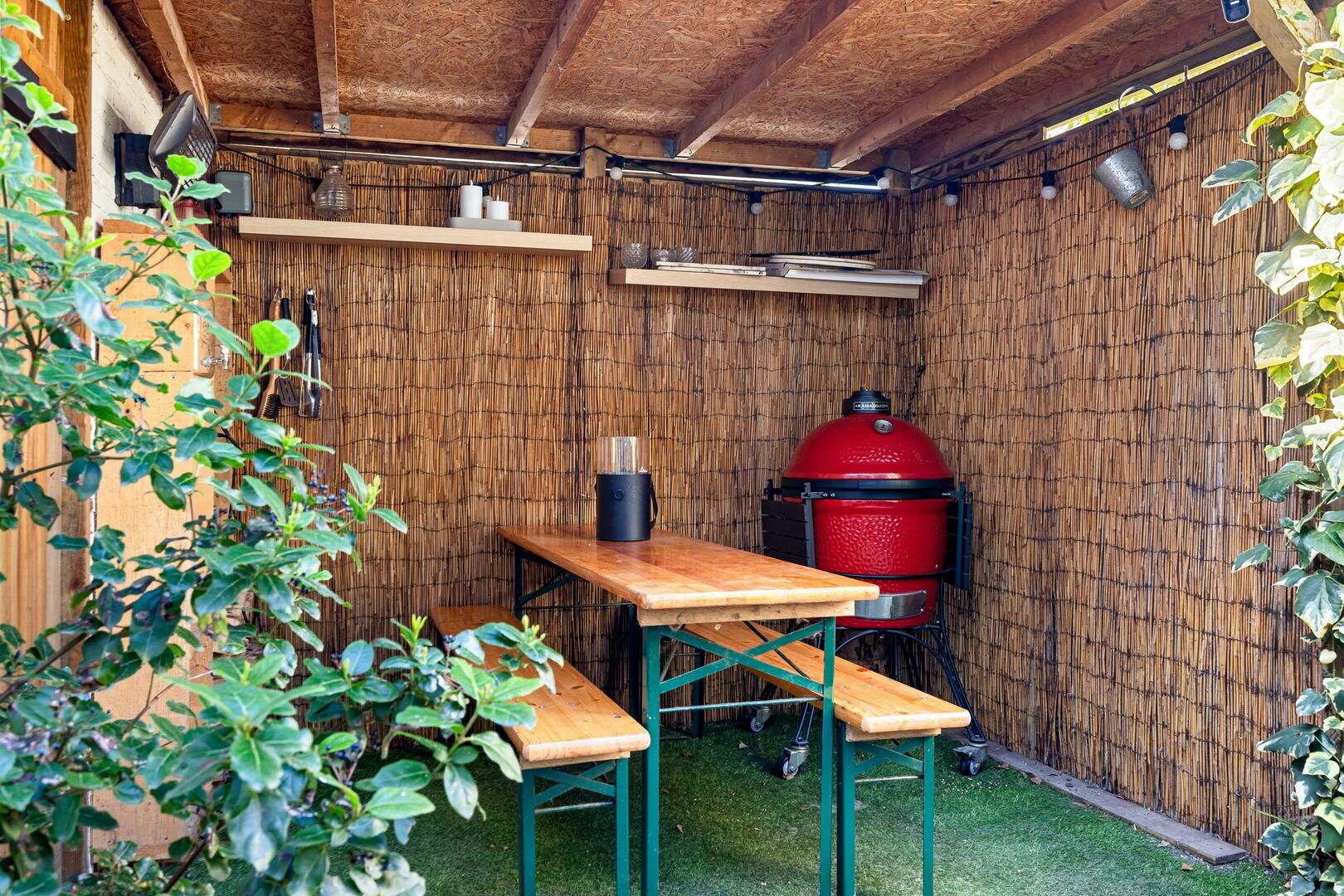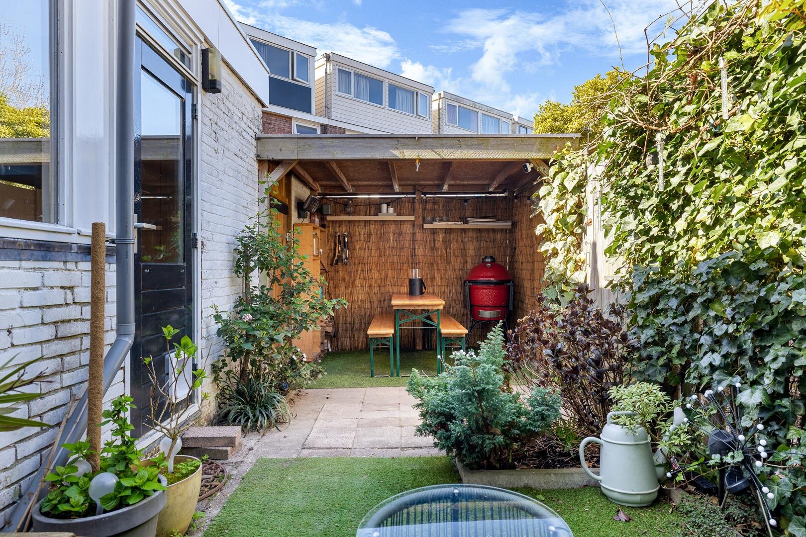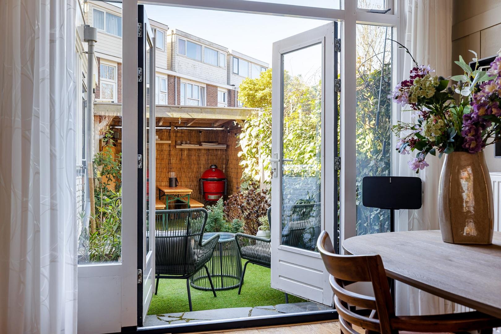 Vanuit de eetkamer stap je zo de achtertuin in door de openslaande deuren. Onder de overkapping is het heerlijk vertoeven, of je nu kiest voor een rustige avond of een gezellige borrel met vrienden.