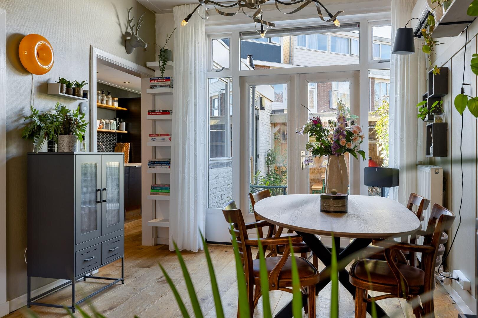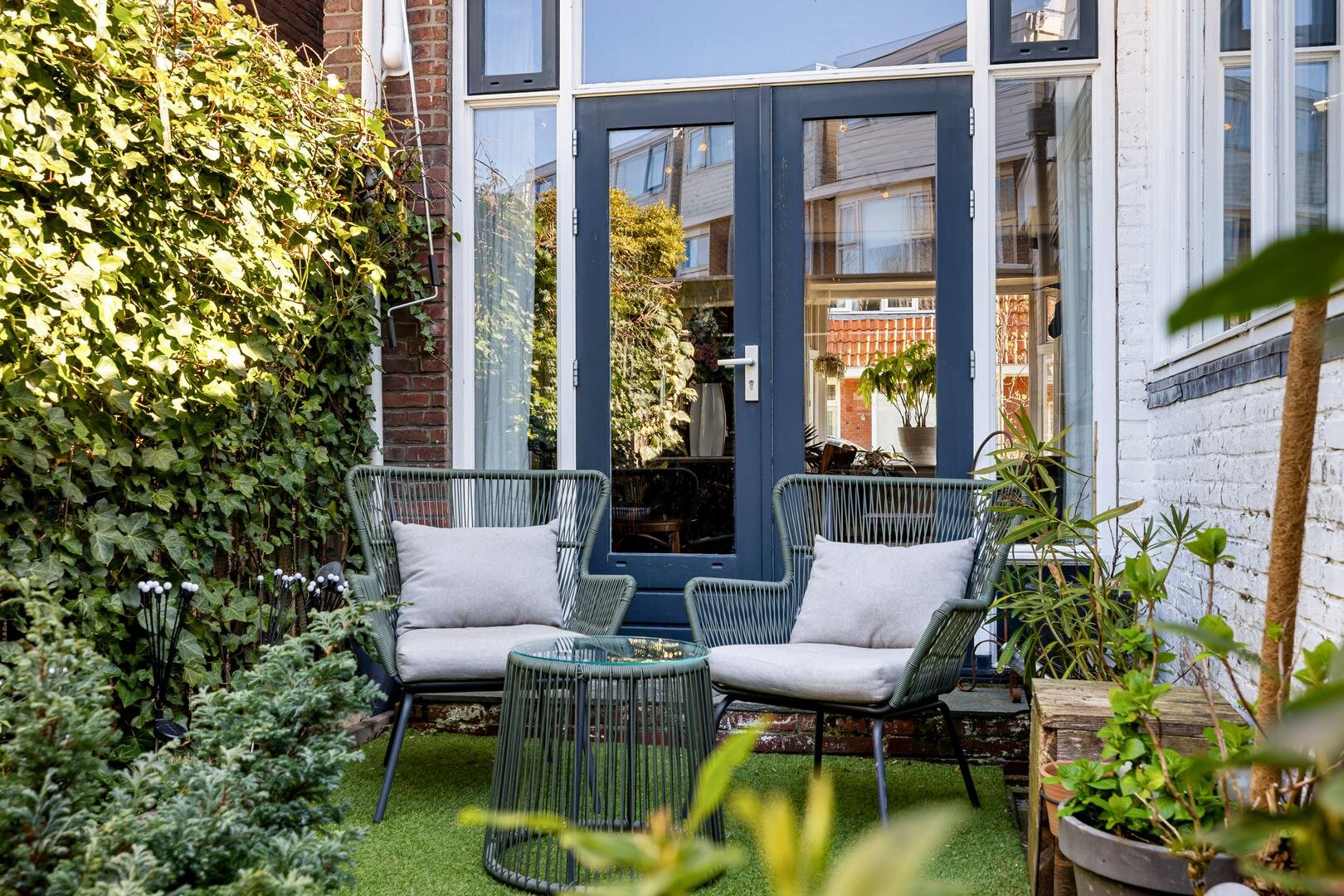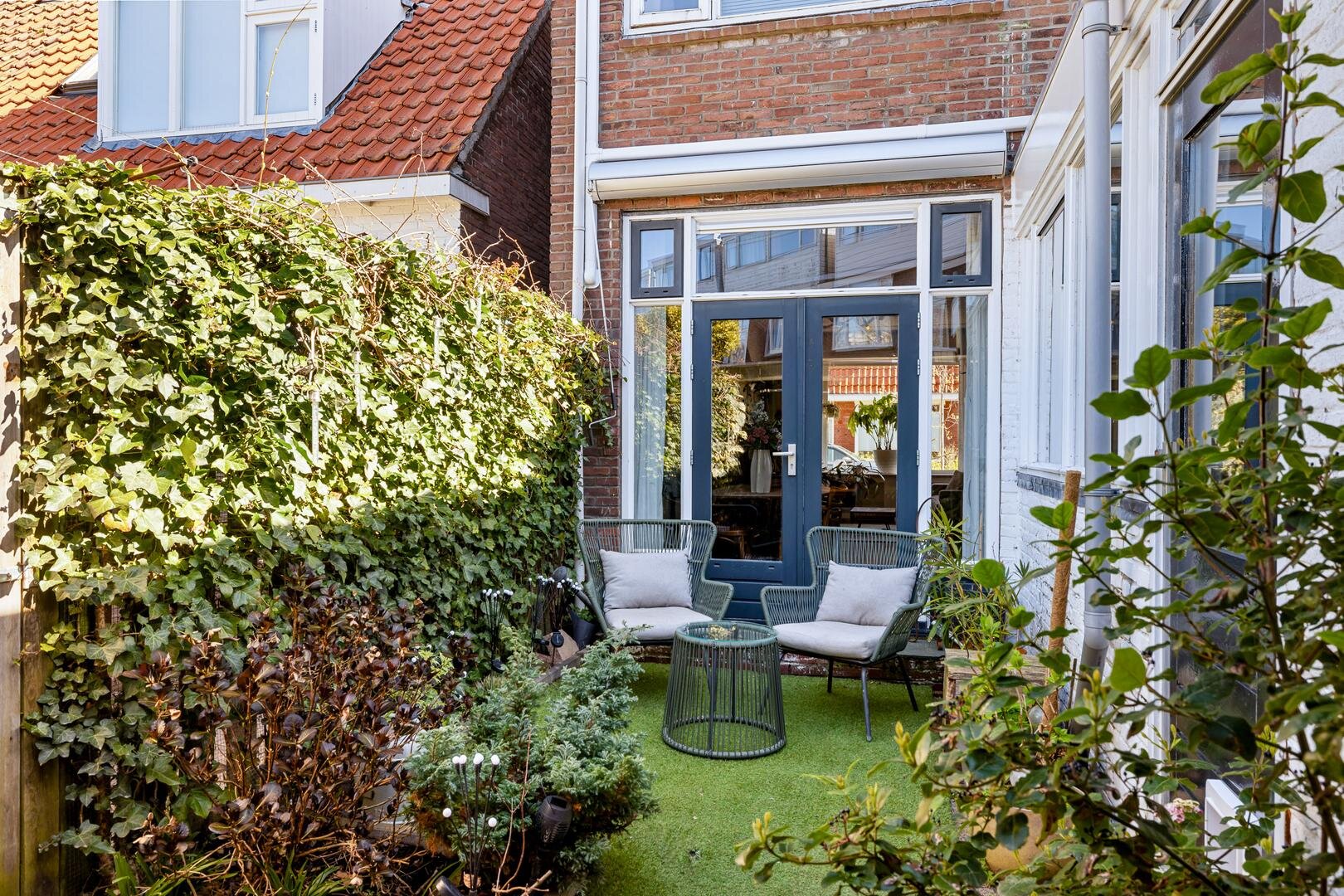 Vanuit de eetkamer stap je zo de achtertuin in door de openslaande deuren. Onder de overkapping is het heerlijk vertoeven, of je nu kiest voor een rustige avond of een gezellige borrel met vrienden.