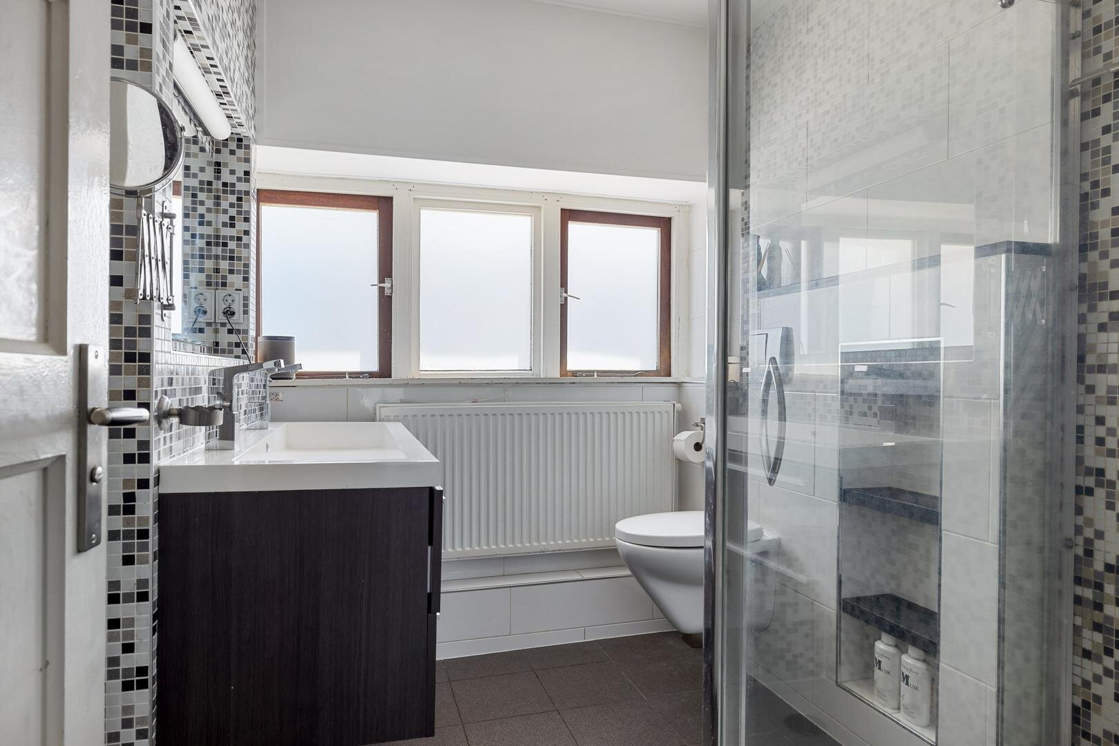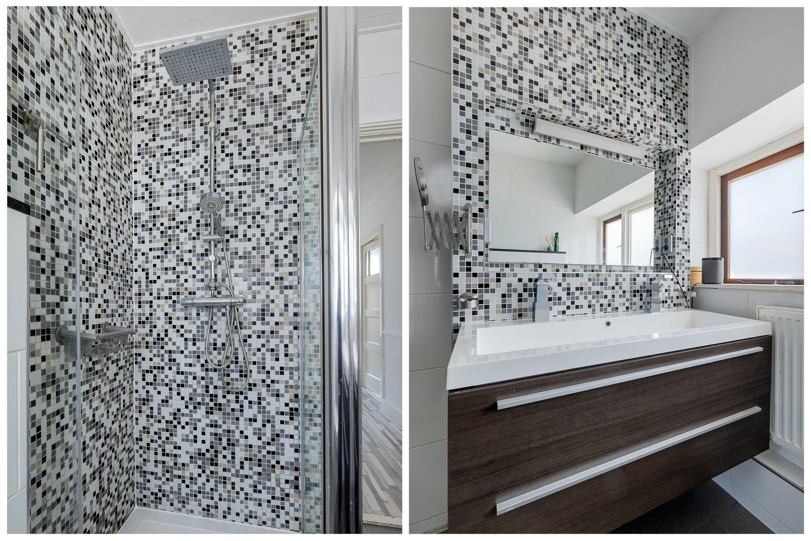Op de eerste verdieping bevinden zich twee ruime slaapkamers en de moderne badkamer. Deze is compleet uitgevoerd met een douche, tweede toilet en een stijlvol wastafelmeubel. Toegang tot het droogplat vanaf de overloop.