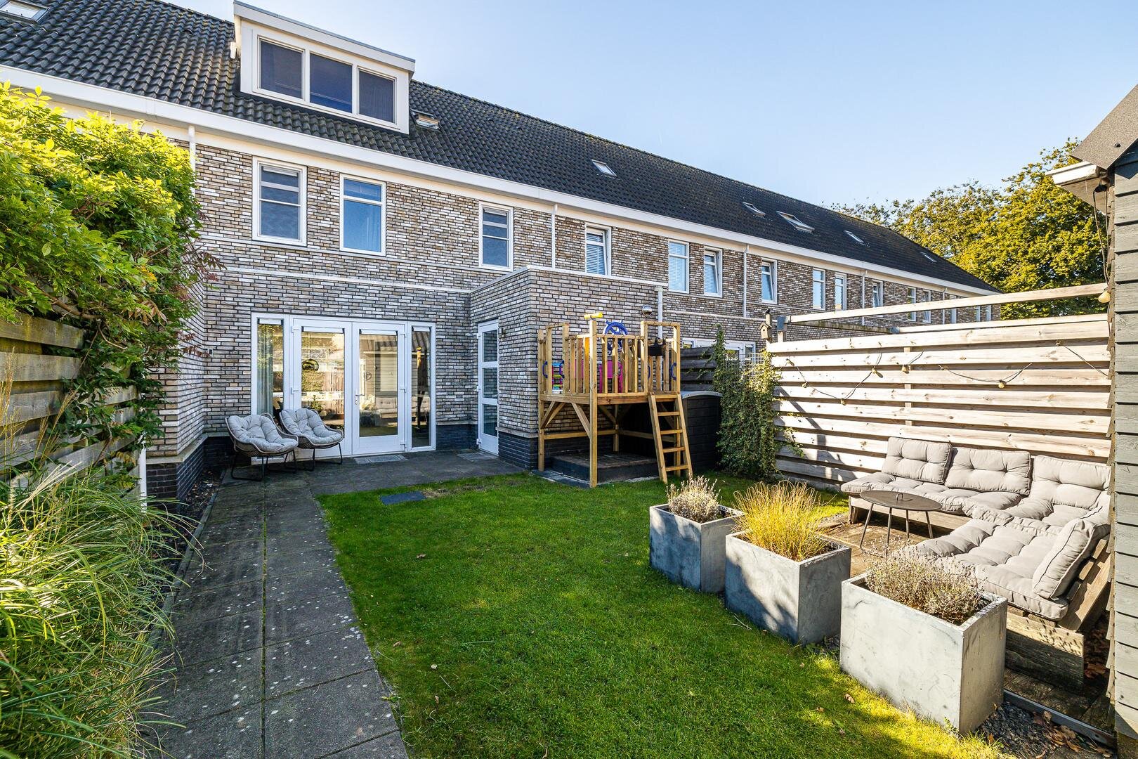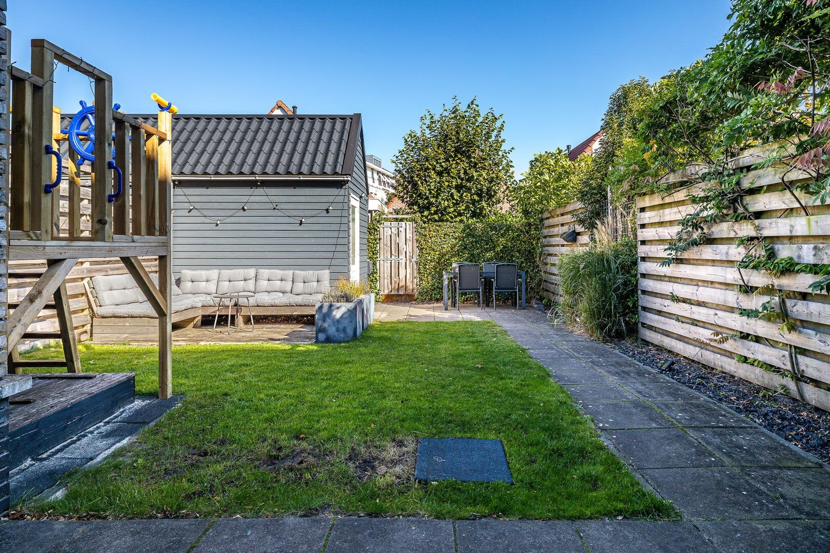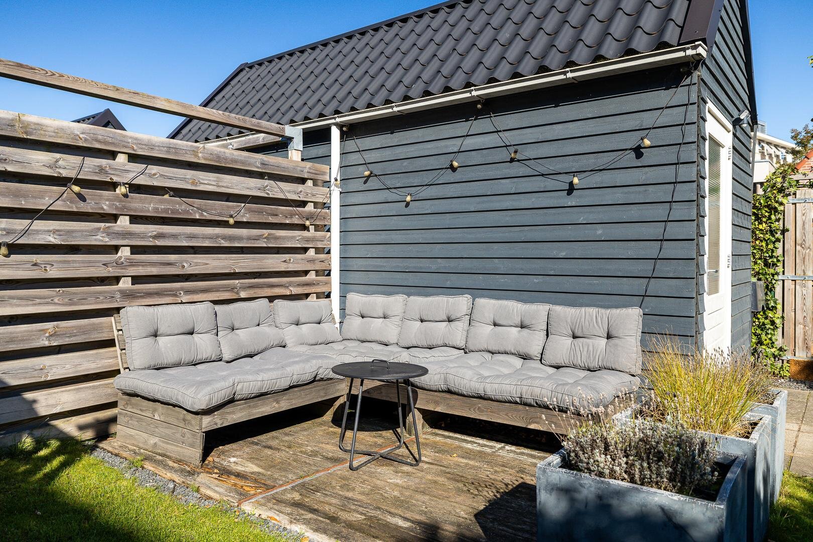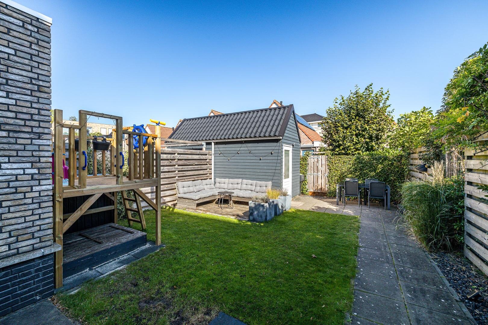 De tuin is verzorgd aangelegd, gelegen op het noorden en beschikt over een ruime achterom. Achter in de tuin staat een houten berging met vliering, handig voor extra opslag.