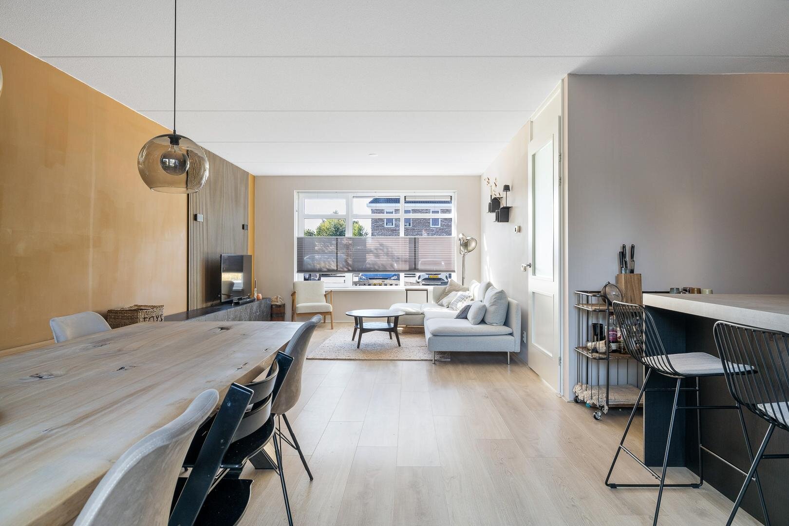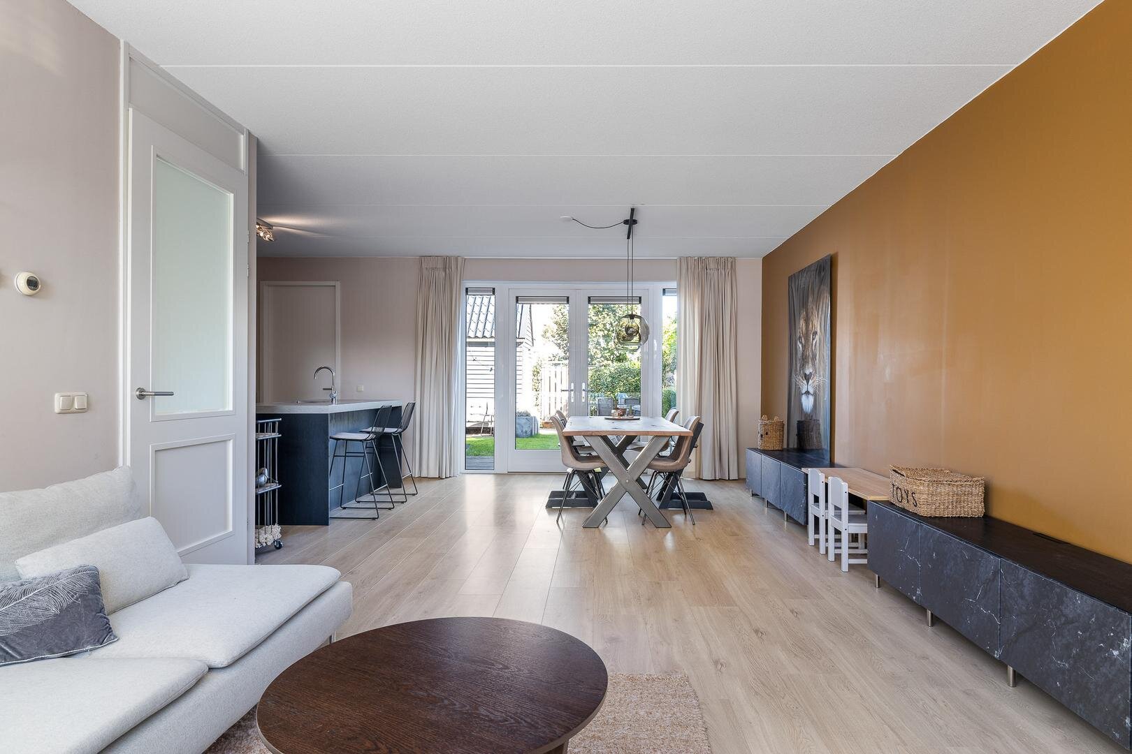 Via de hal, met toilet, meterkast en handige trapkast, kom je in de ruime en lichte woonkamer. Dankzij de uitbouw van 1.20 meter is er extra leefruimte gecreëerd en door de openslaande deuren stroomt het licht naar binnen. De gehele begane grond is voorzien van een nette laminaatvloer met vloerverwarming.