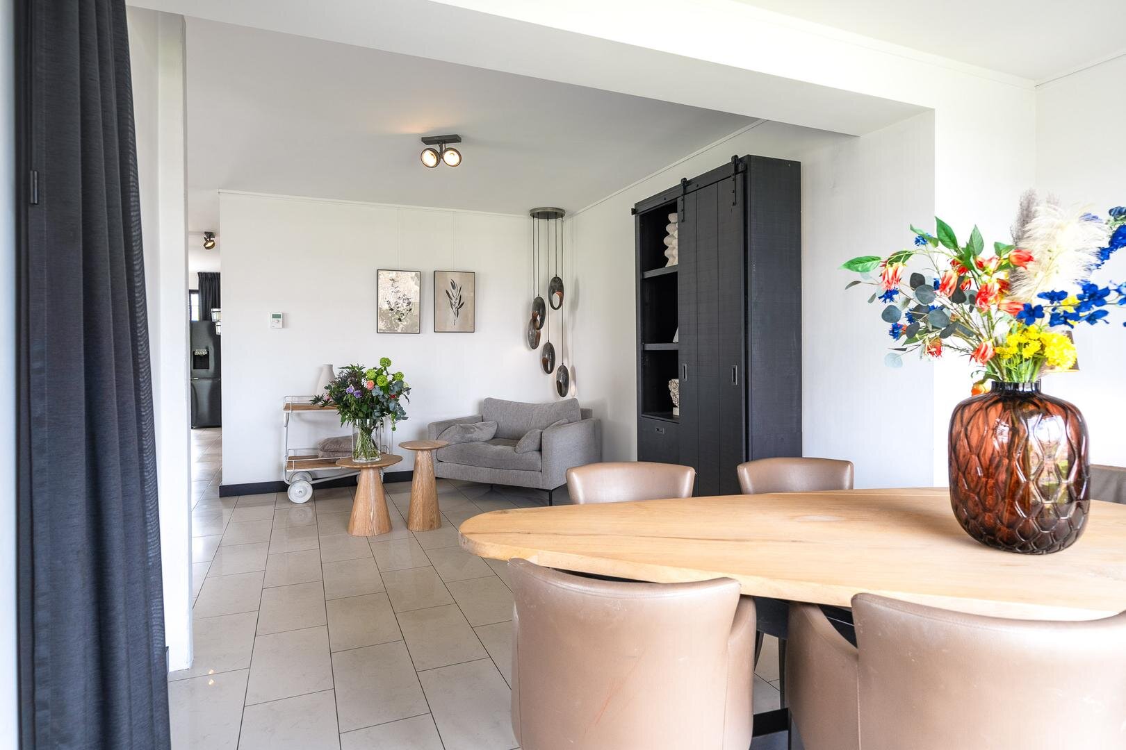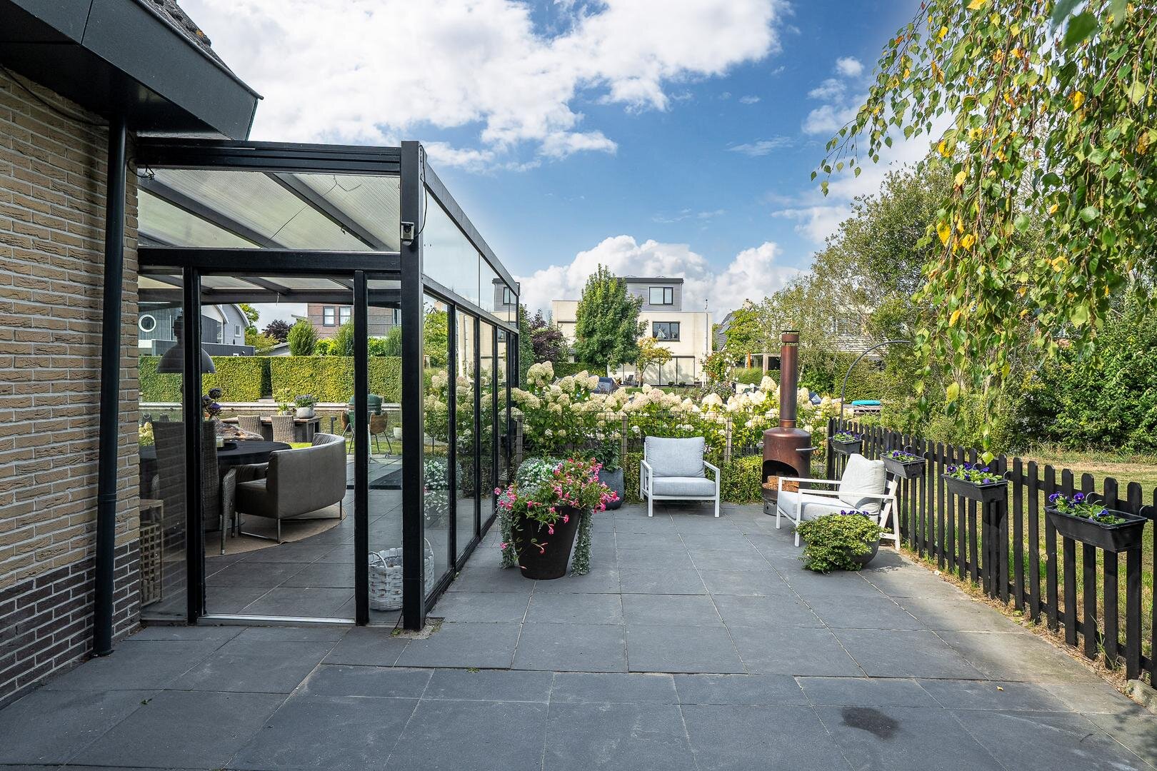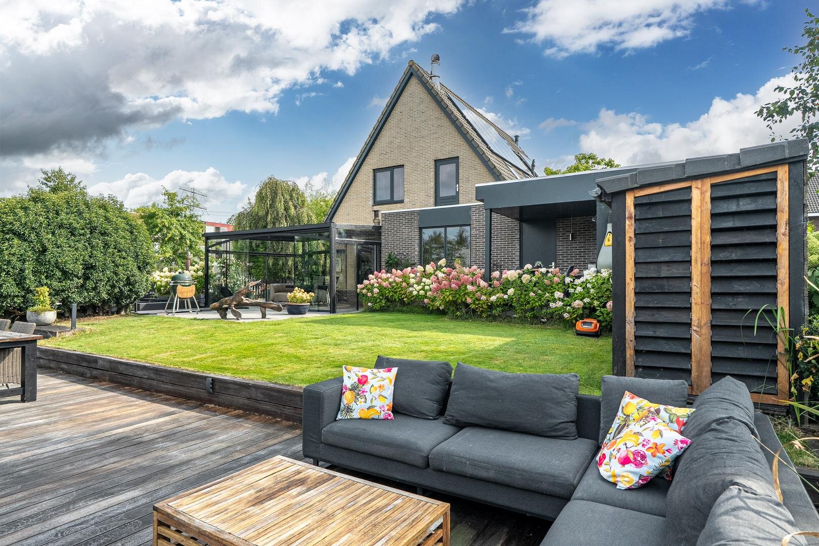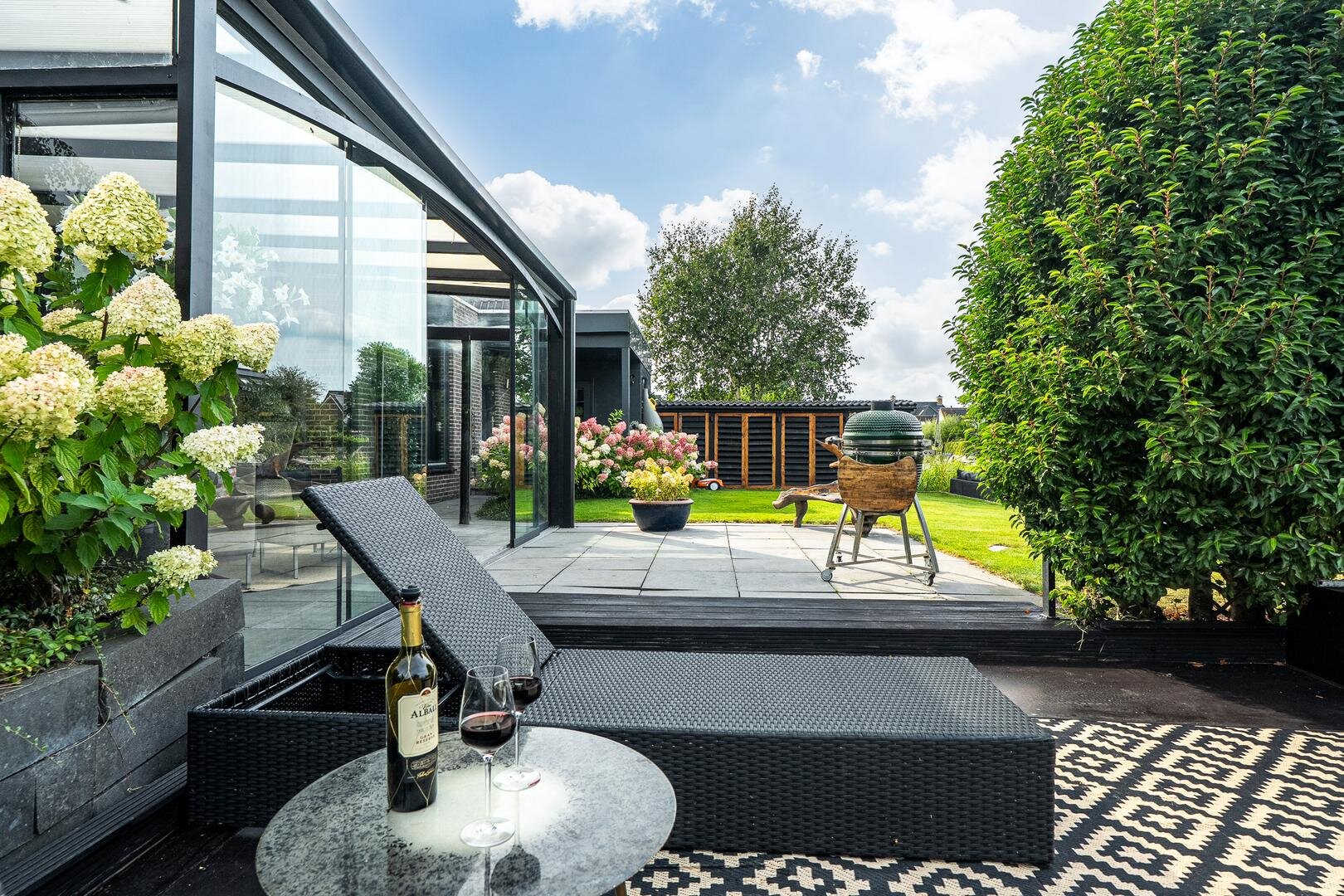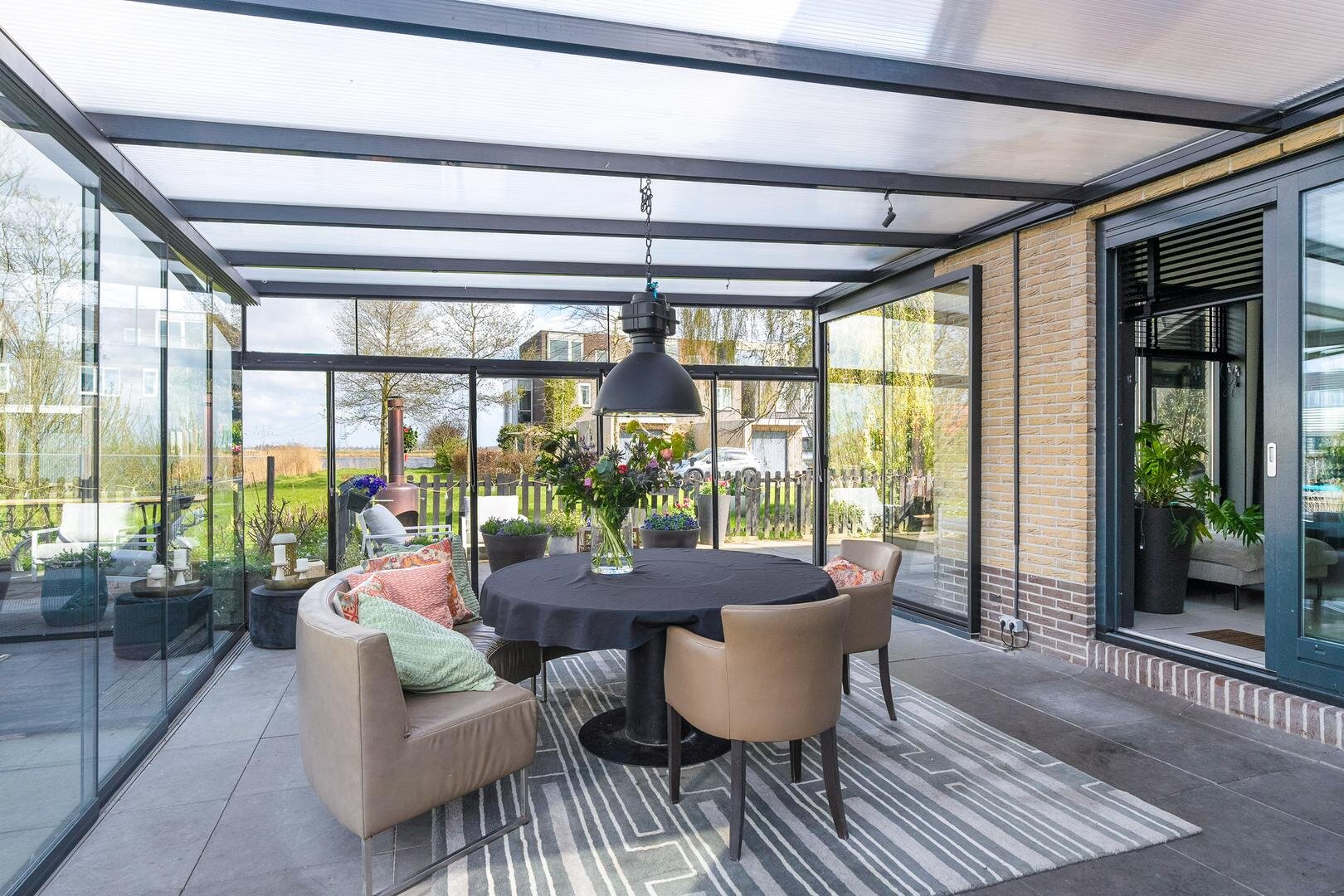Via de schuifpui bereik je de sfeervolle serre, een heerlijke plek waar je al vroeg in het voorjaar en tot laat in het najaar comfortabel kunt genieten van het buitenleven. De serre vormt een prachtig verlengstuk van de woonkamer en biedt een beschutte plek met veel lichtinval.