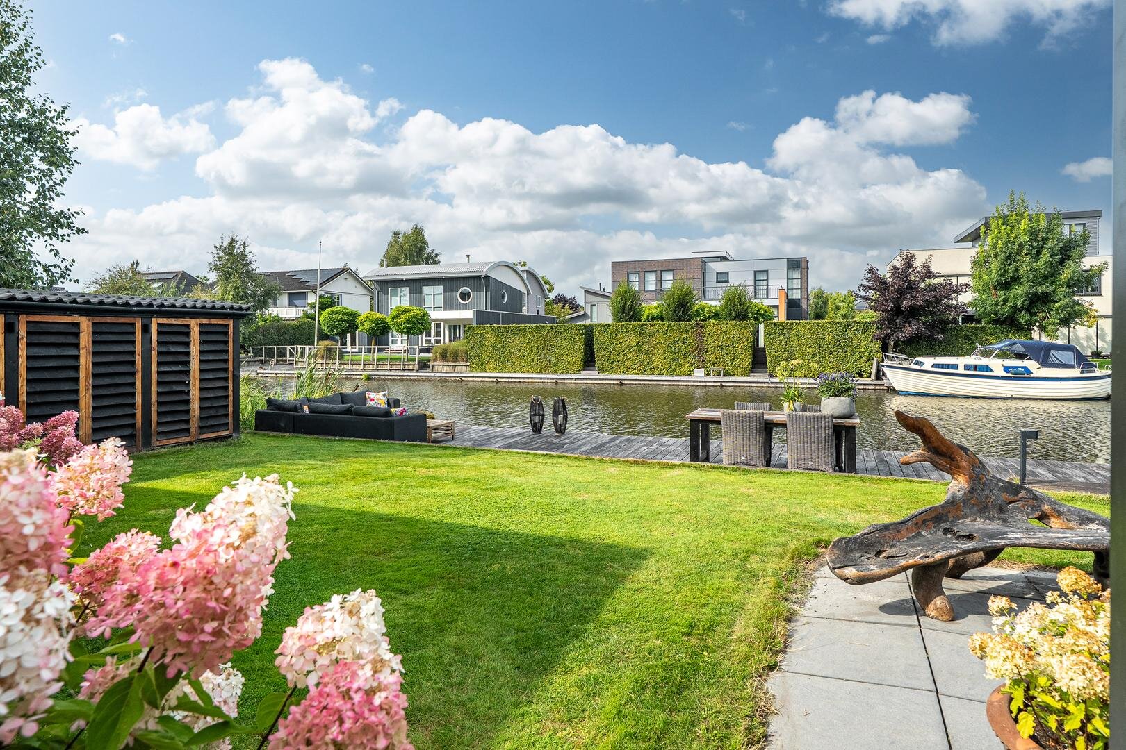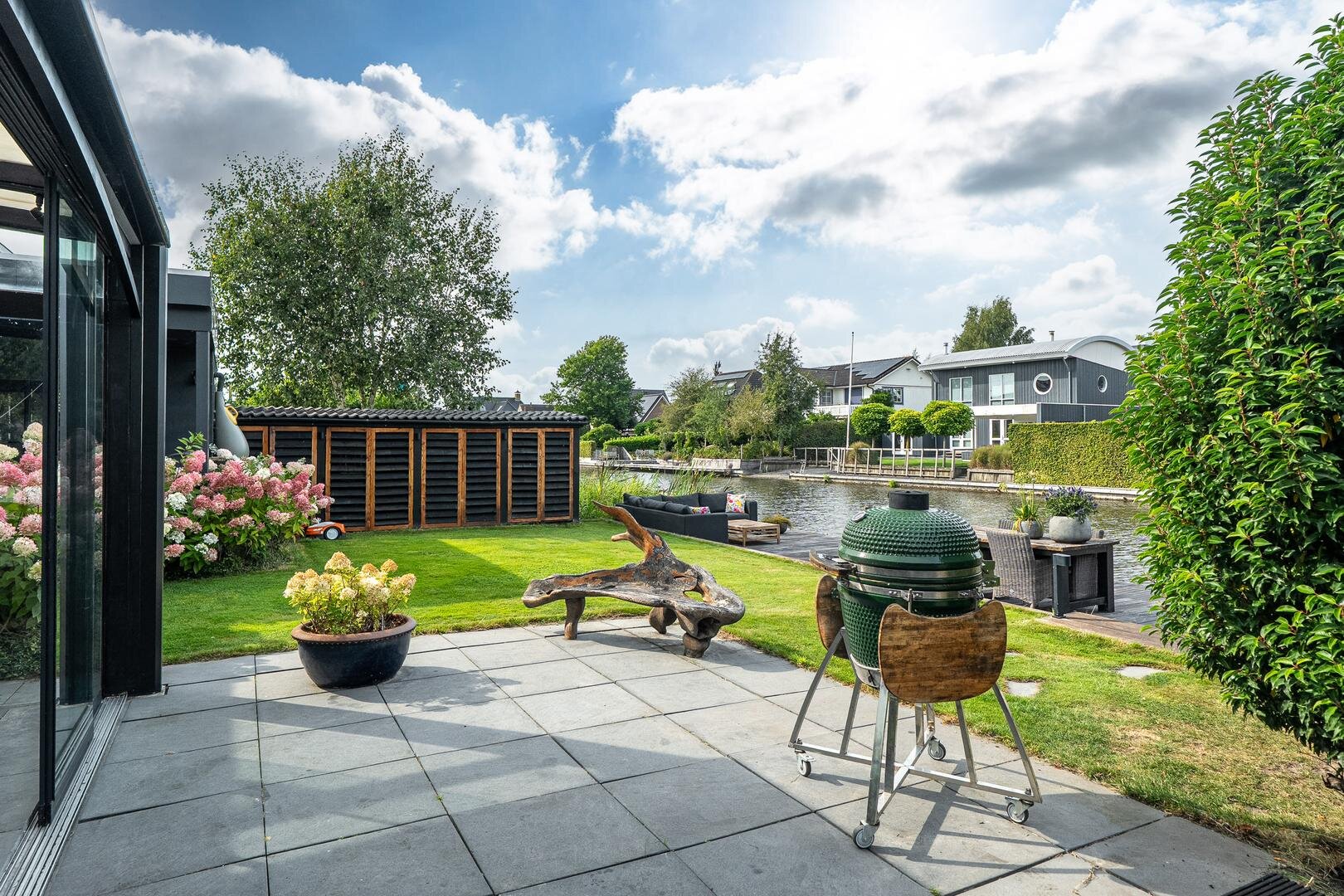 De royale, fraai aangelegde tuin ligt direct aan het vaarwater en biedt veel privacy. Hier geniet je dagelijks van rust, groen en vrijheid. Vanuit de tuin heb je bovendien vrij uitzicht over een aangrenzend weidevogelgebied, waar je kunt genieten van een rijk vogelleven en een prachtig, weids landschap. De speelse indeling, diverse zitplekken en het directe contact met het water maken dit een unieke buitenruimte.