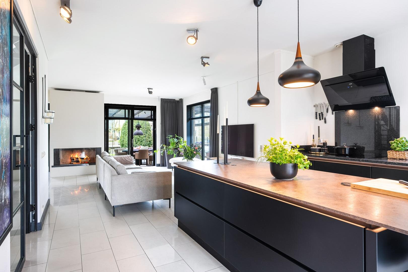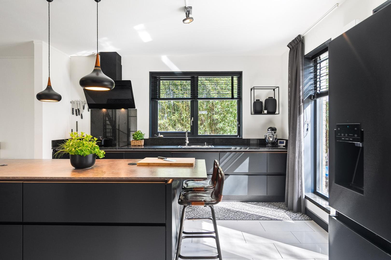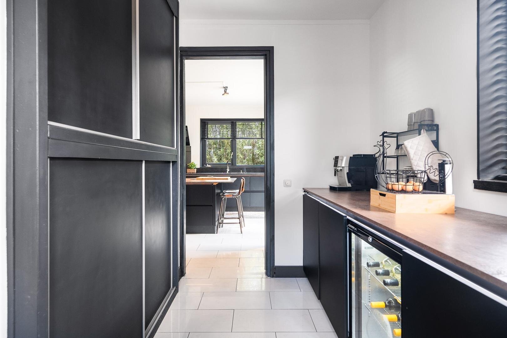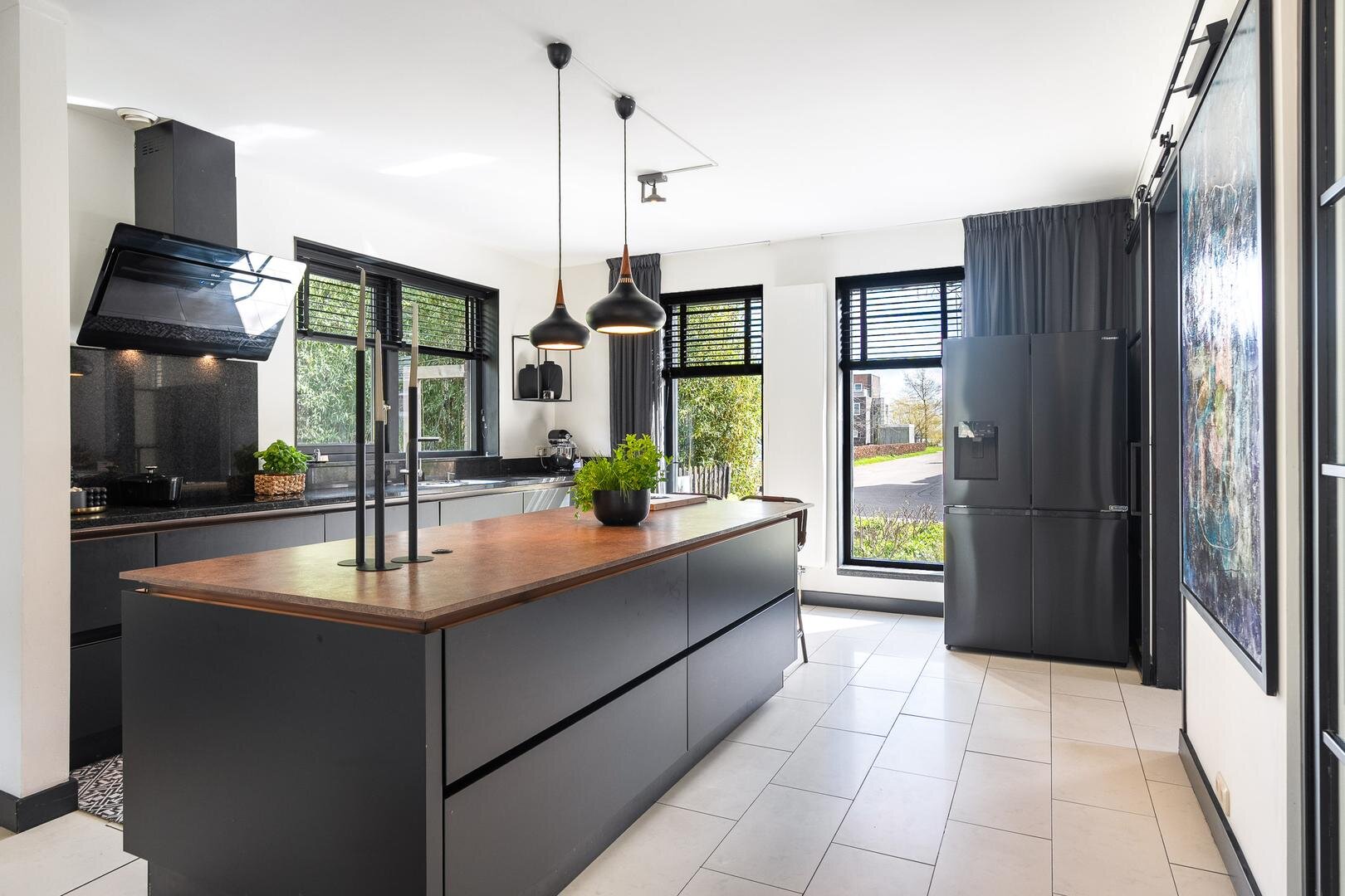 De luxe open keuken vormt het hart van het huis en is uitgevoerd met een royaal kookeiland en hoogwaardige inbouwapparatuur. Hier kook en leef je tegelijk. Perfect voor gezellige avonden met familie en vrienden. Aansluitend vind je een praktische bijkeuken met extra bergruimte en toegang naar buiten.