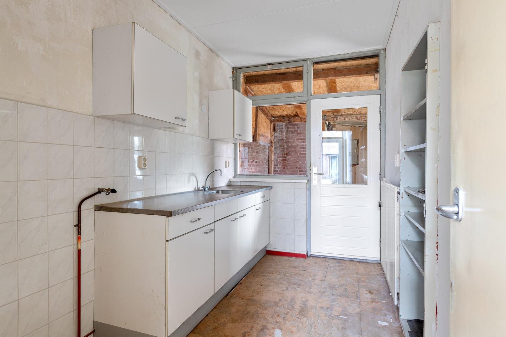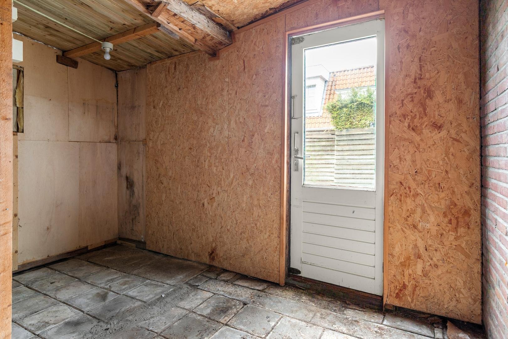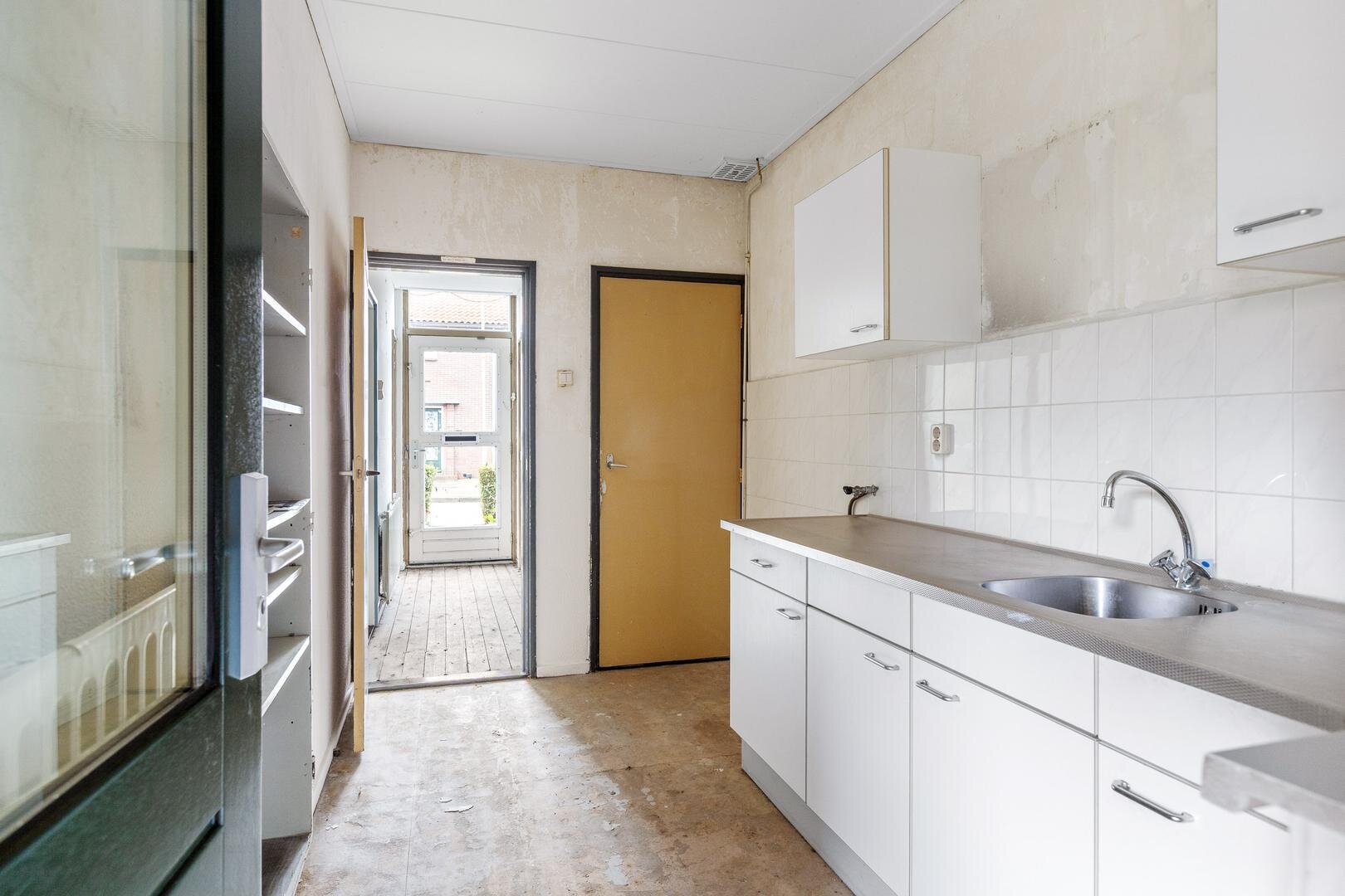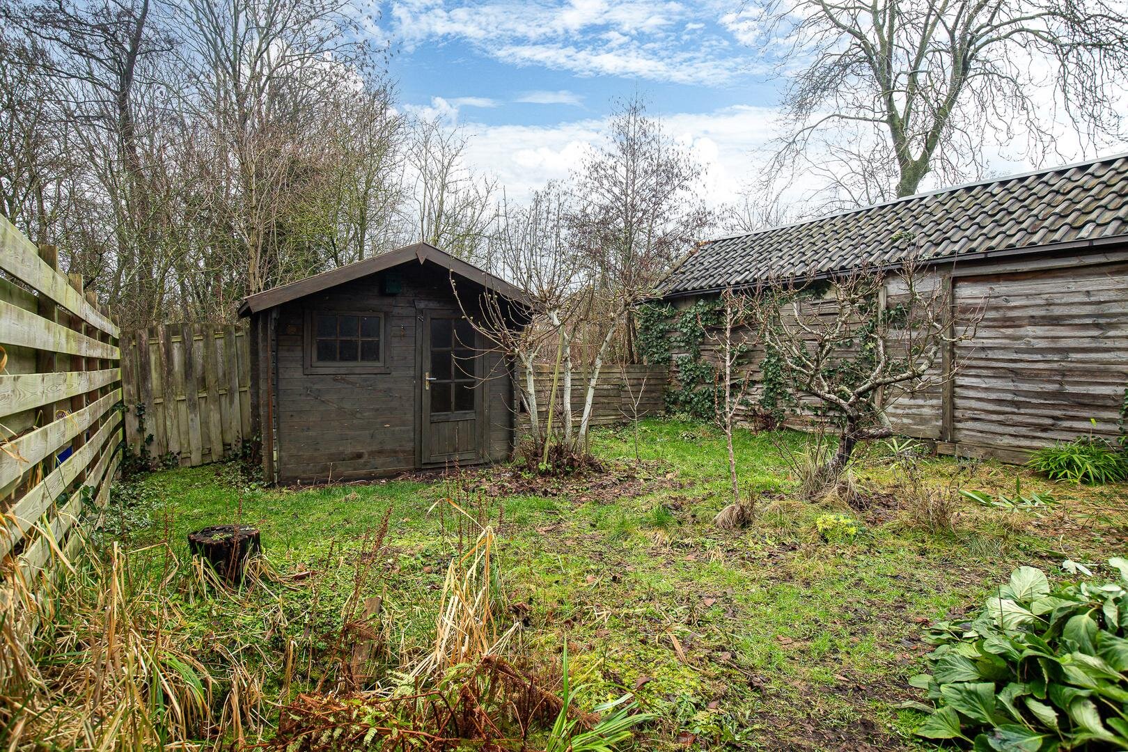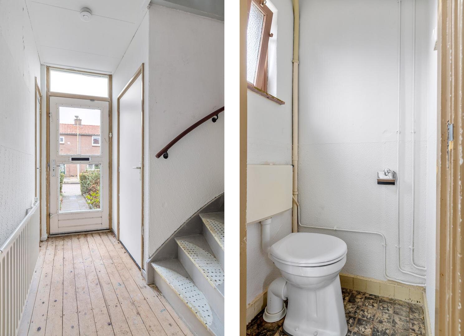 Bij binnenkomst tref je de entree met trapopgang en een toilet. De lichte woonkamer biedt voldoende ruimte voor een zithoek en een eettafel. De aangrenzende keuken is voorzien van een eenvoudig keukenblok en geeft toegang tot een aangebouwde stenen berging, handig voor extra opslag of als klusruimte.