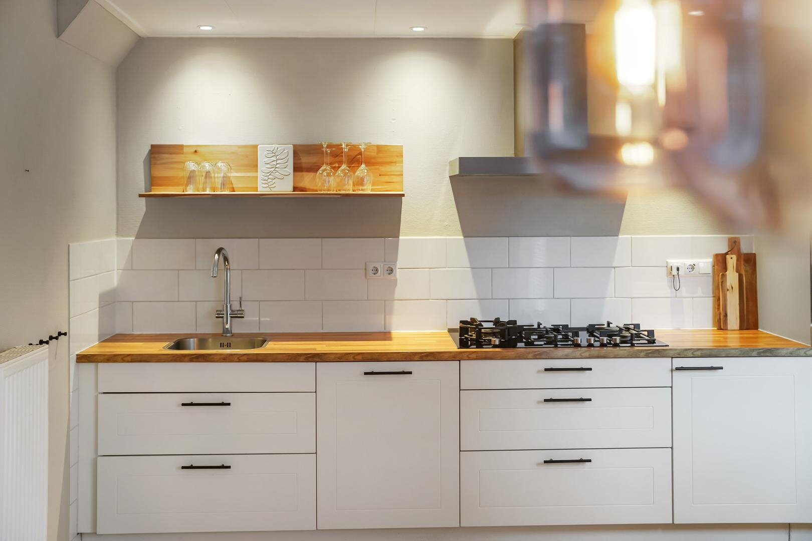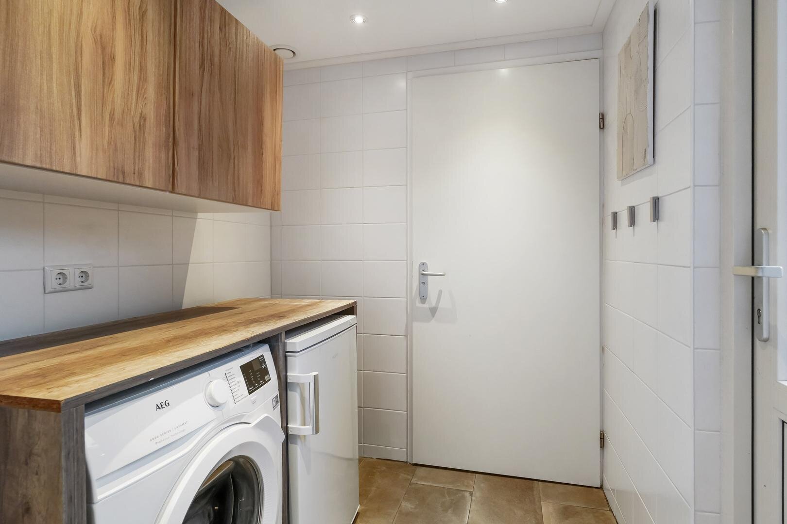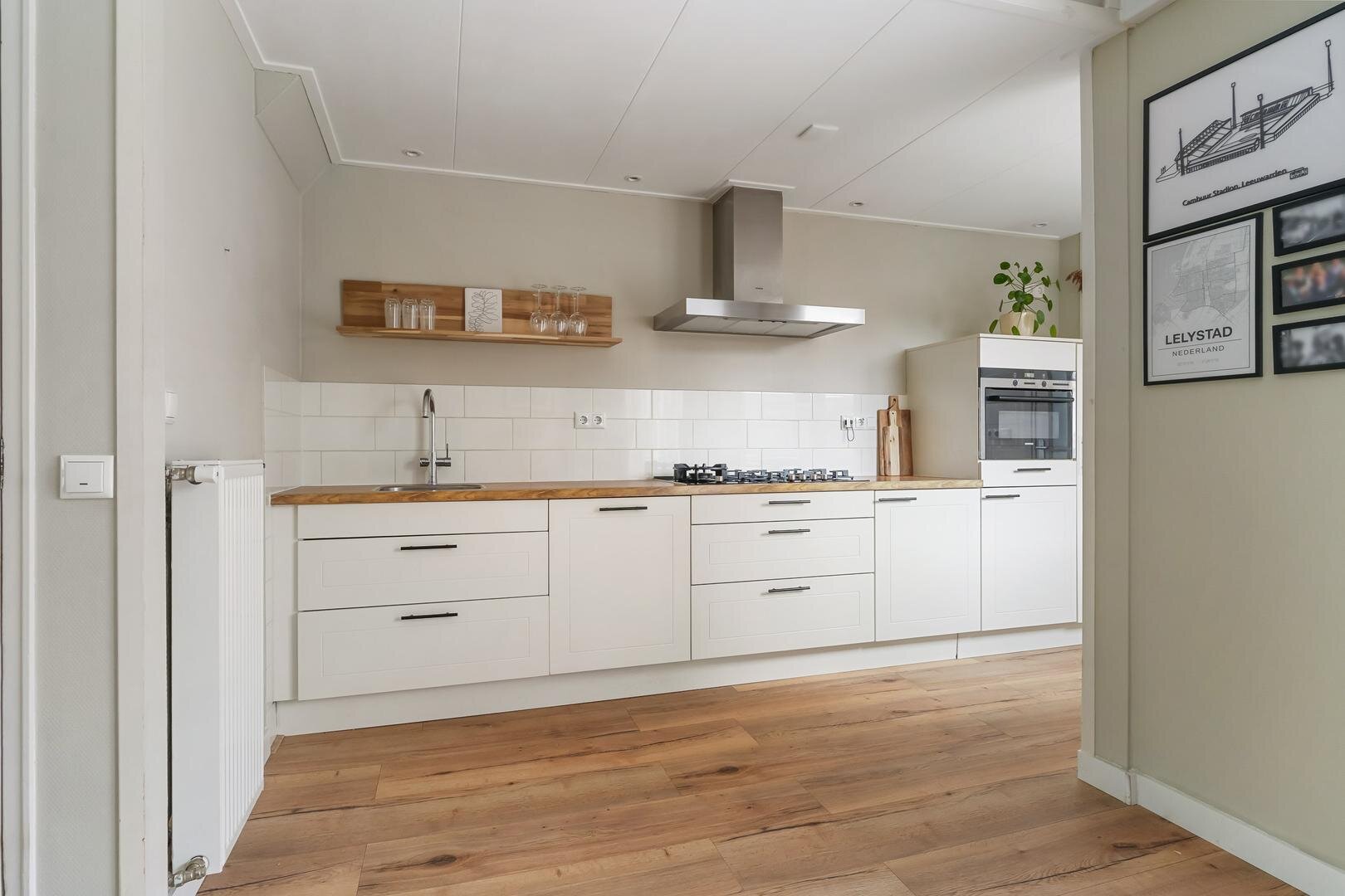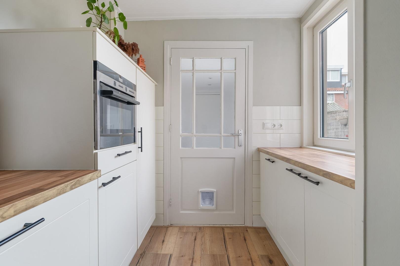 De open keuken is praktisch opgesteld en voorzien van diverse inbouwapparatuur, waaronder o.a. gasfornuis, afzuigkap, koelkast en combi-oven. Aansluitend vind je de bijkeuken met wasmachineaansluiting, cv-opstelling en het toilet. Extra handig: via de bijkeuken loop je ook direct de achtertuin in, ideaal voor dagelijkse routines én tuin-/klusspullen.