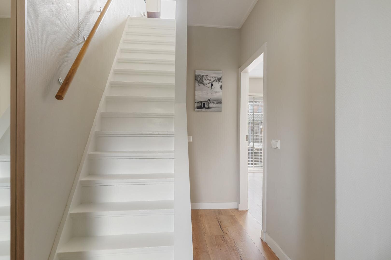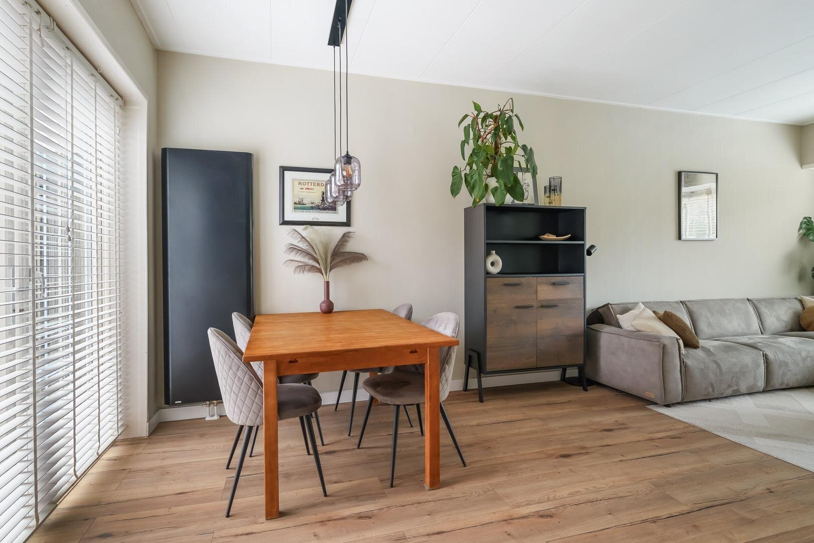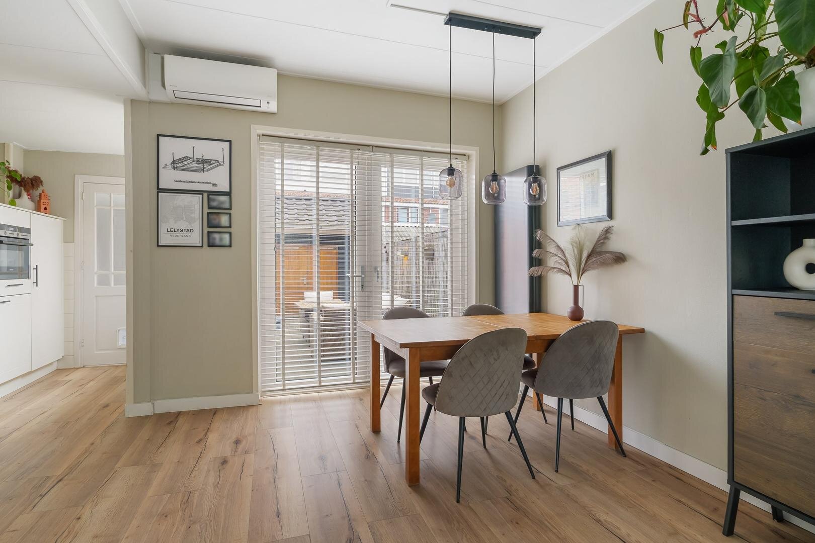 Je komt binnen in de hal met trapopgang. Direct valt op hoe licht het huis is: de doorzonwoonkamer voelt ruim en uitnodigend. Aan de voorzijde zorgt de erker voor extra sfeer en een fijne plek voor een zitje met uitzicht op het park. Aan de achterzijde geven de grote raampartijen en de openslaande deuren een open, moderne woonbeleving. Op zonnige dagen zet je de deuren open en betrek je de tuin moeiteloos bij je woonkamer. Wordt het je te warm? De airco zorgt op warme dagen voor de nodige verkoeling.