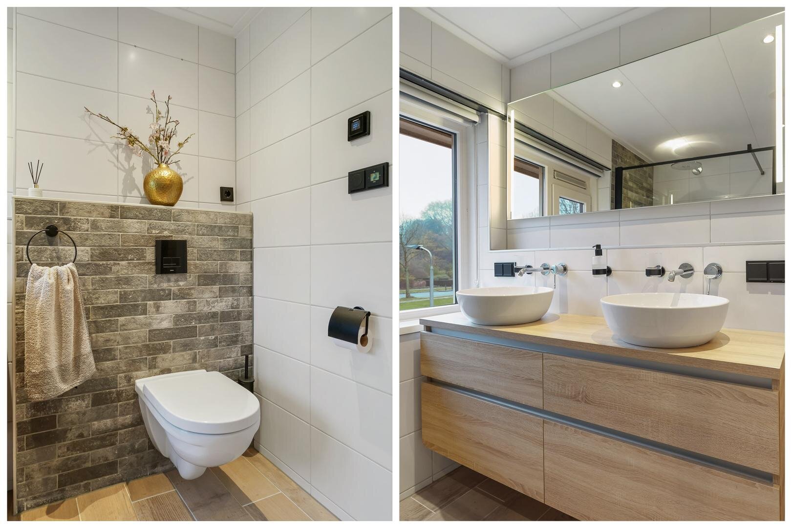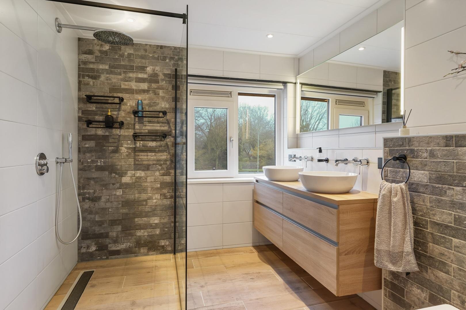 De badkamer is volledig betegeld en verrassend compleet ingericht met een ruime doucheruimte, dubbele wastafel, hangtoilet en als luxe detail: elektrische vloerverwarming. Een fijne, nette ruimte waar je de dag comfortabel begint en eindigt.