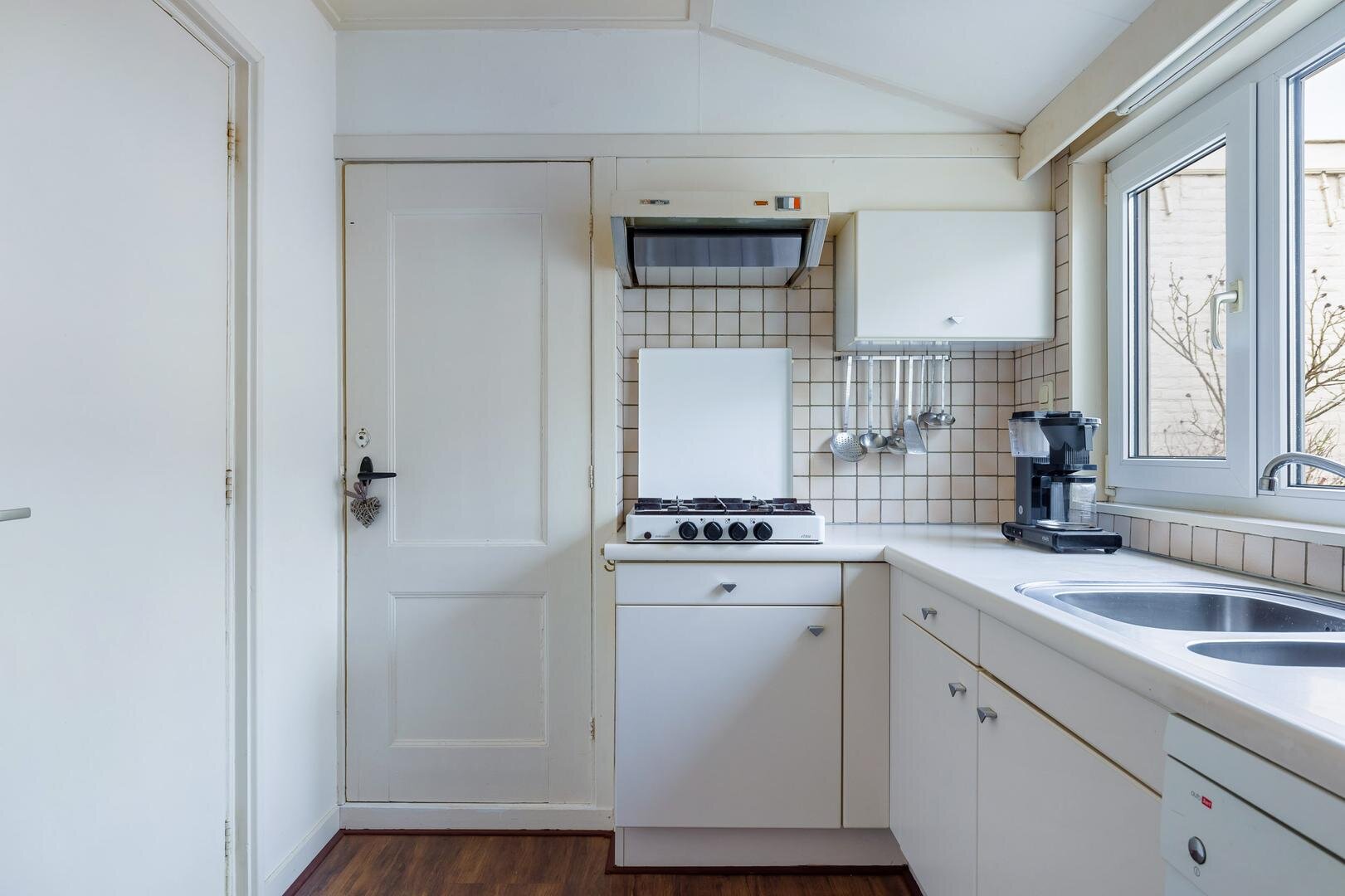 Via de entree komt u in de hal met trapopgang en toegang tot een hobbyruimte. De ruime en sfeervolle L-vormige eet-/woonkamer beschikt over een laminaat-/parketvloer, vaste kasten, een rookkanaal en een gaskachel. De keuken is uitgevoerd in een lichte kleurstelling (1989) met deels rvs werkblad in hoekopstelling en voorzien van gaskooktoestel, afzuigkap en vaatwasser. Vanuit de keuken is er toegang tot een praktische kelderkast.