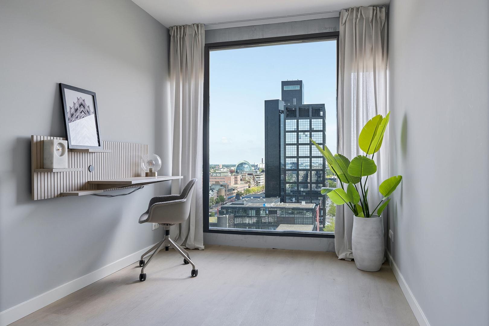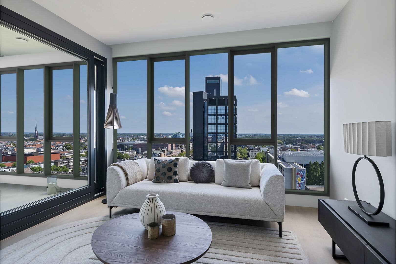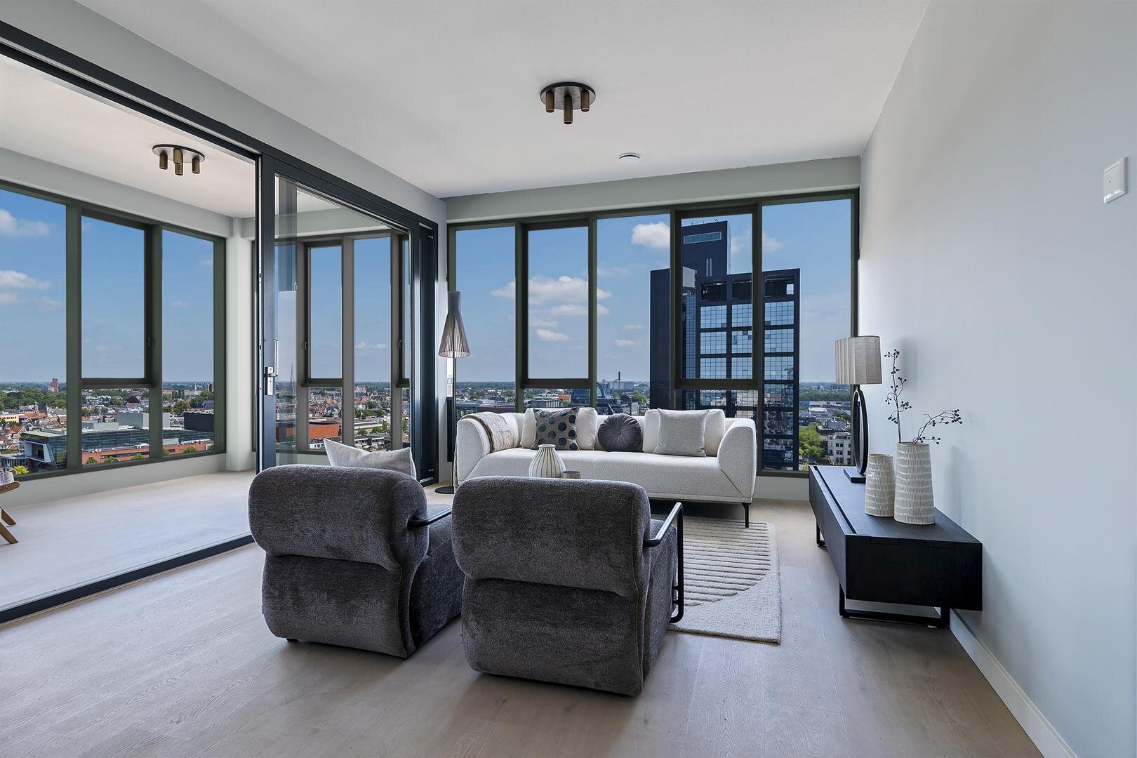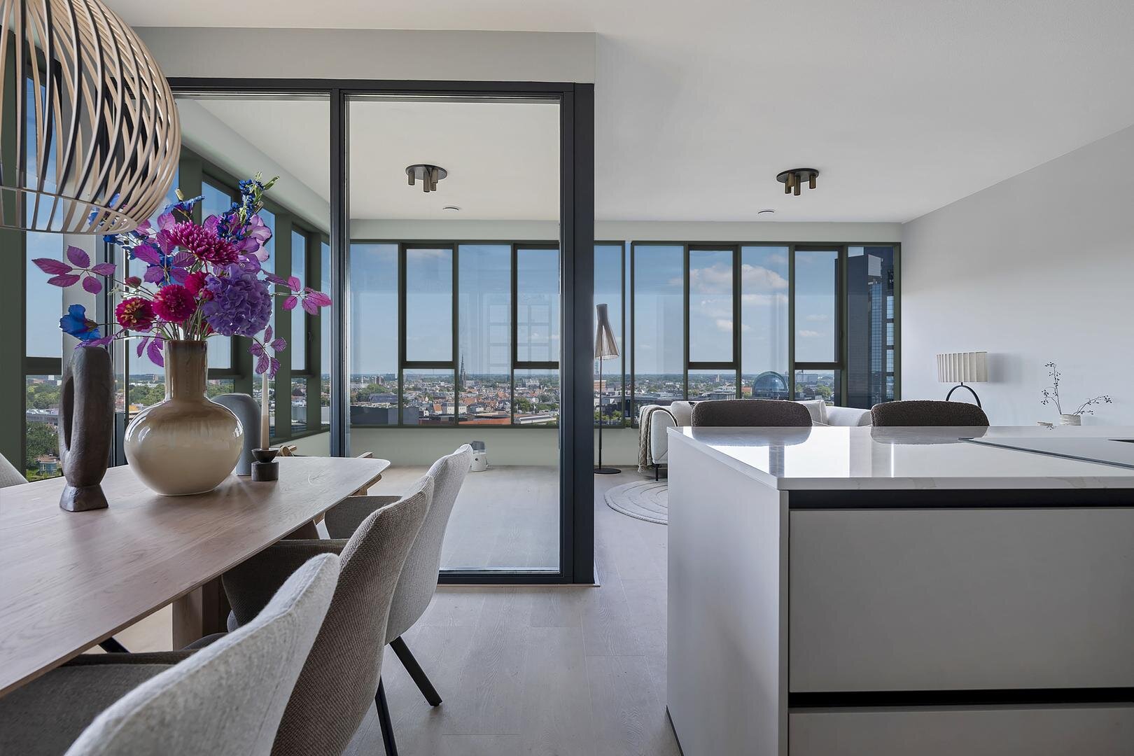 Dit lichte hoekappartement met grote raampartijen ligt op de derde verdieping aan de zuidoostkant van het gebouw met een fantastisch uitzicht over het water en de stad. Het appartement heeft een oppervlakte van circa 99 m² met een royale woonkamer met open keuken, twee slaapkamers, een bijkeuken/berging en een aparte berging op de verdieping,