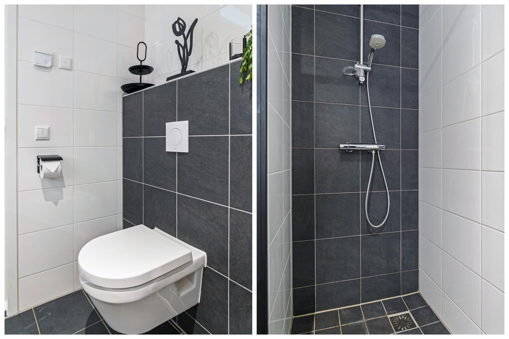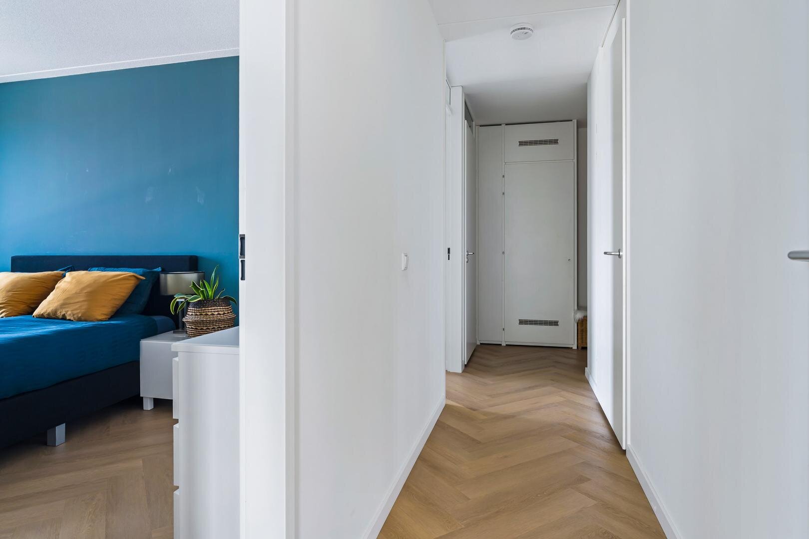 U komt binnen in een ruime hal met meterkast en een separaat (gasten)toilet met fonteintje. Aan de linkerzijde vindt u de technische ruimte met installaties en witgoedaansluiting, gevolgd door de badkamer, die is voorzien van een inloopdouche, toilet en wastafelmeubel. Aan de rechterzijde bevinden zich de slaapkamers. De eerste slaapkamer heeft een oppervlakte van ca. 11 m² en is ideaal als logeer- of werkkamer. De master bedroom van ca. 15 m² biedt volop ruimte en comfort, met voldoende plek voor een groot bed en kasten.