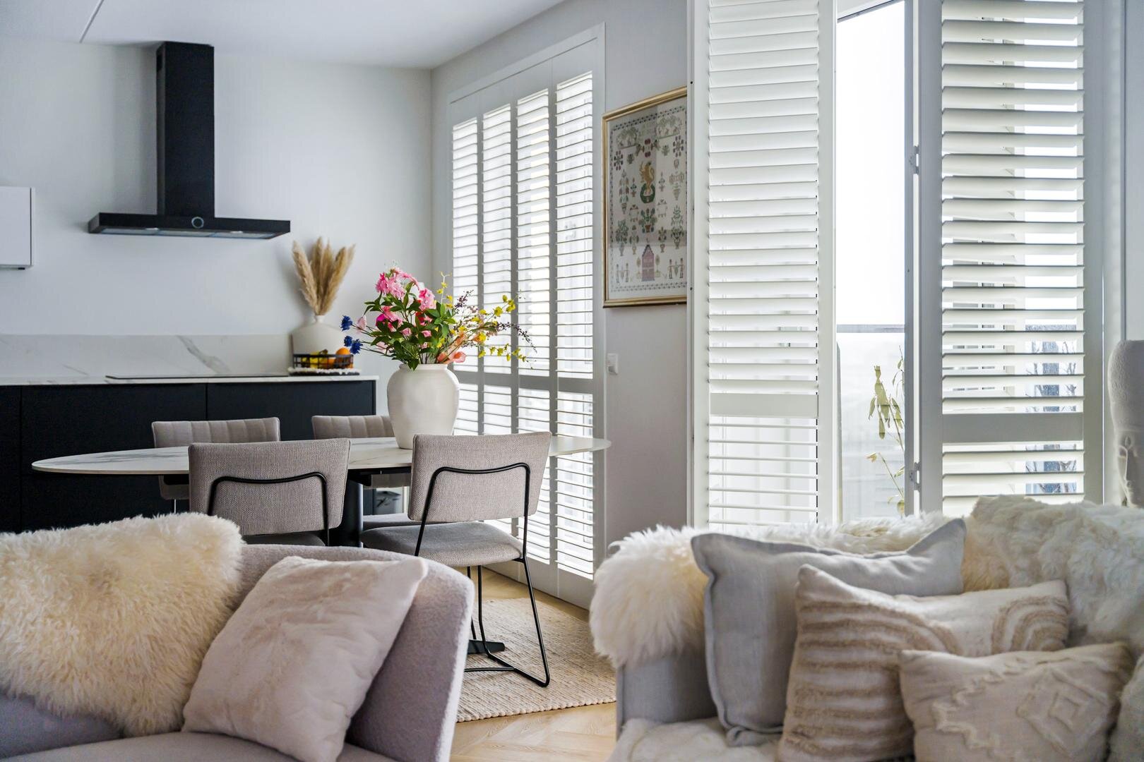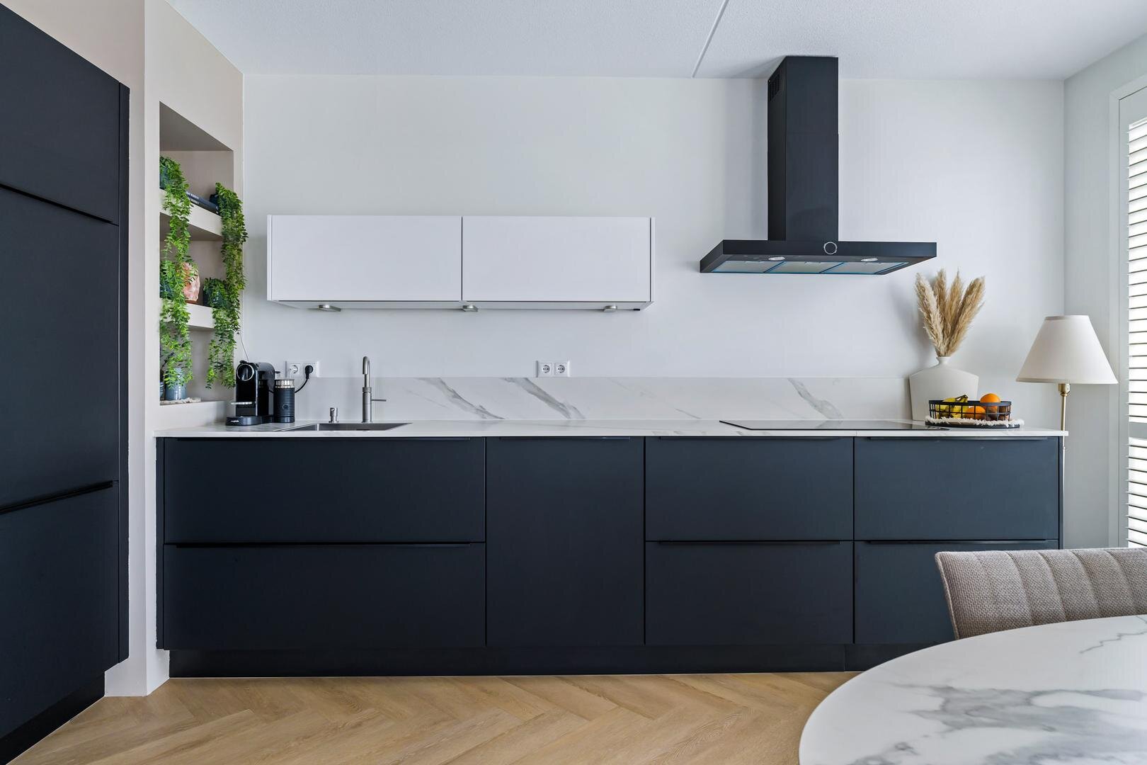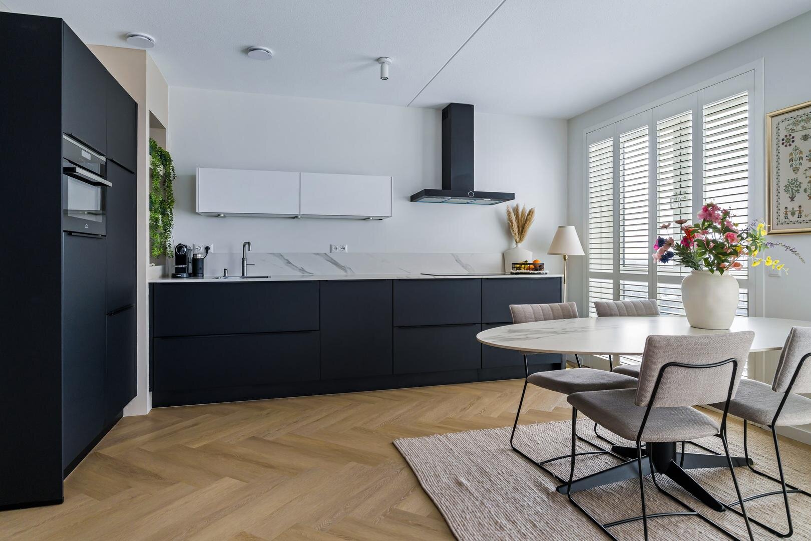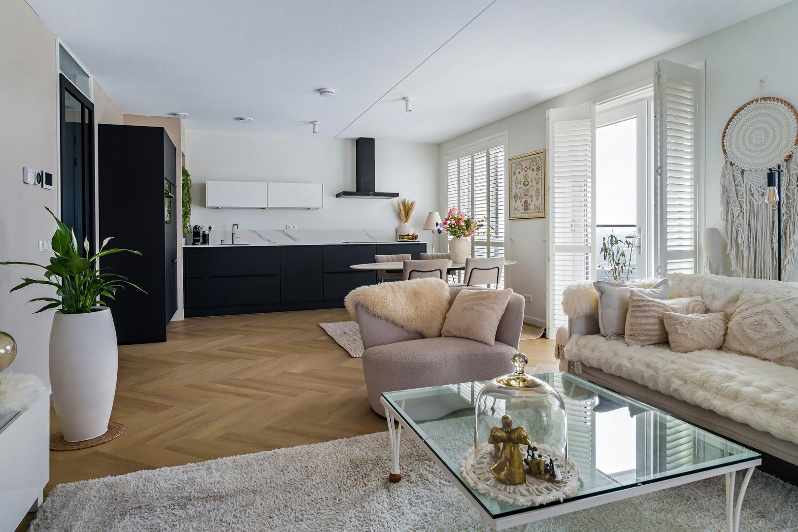De woonkamer, eethoek en open keuken vormen samen een royale, lichtdoorlatende ruimte, afgewerkt met een pvc-vloer. De moderne open keuken is uitgevoerd met inbouwapparatuur, waaronder een inductiekookplaat, afzuigkap, koelkast, vriezer en combimagnetron en afgewerkt met een stijlvol aanrechtblad. Vanuit de woonkamer heeft u direct toegang tot het royale balkon, een fijne plek om in de zon een boek te lezen of te genieten van het uitzicht.
