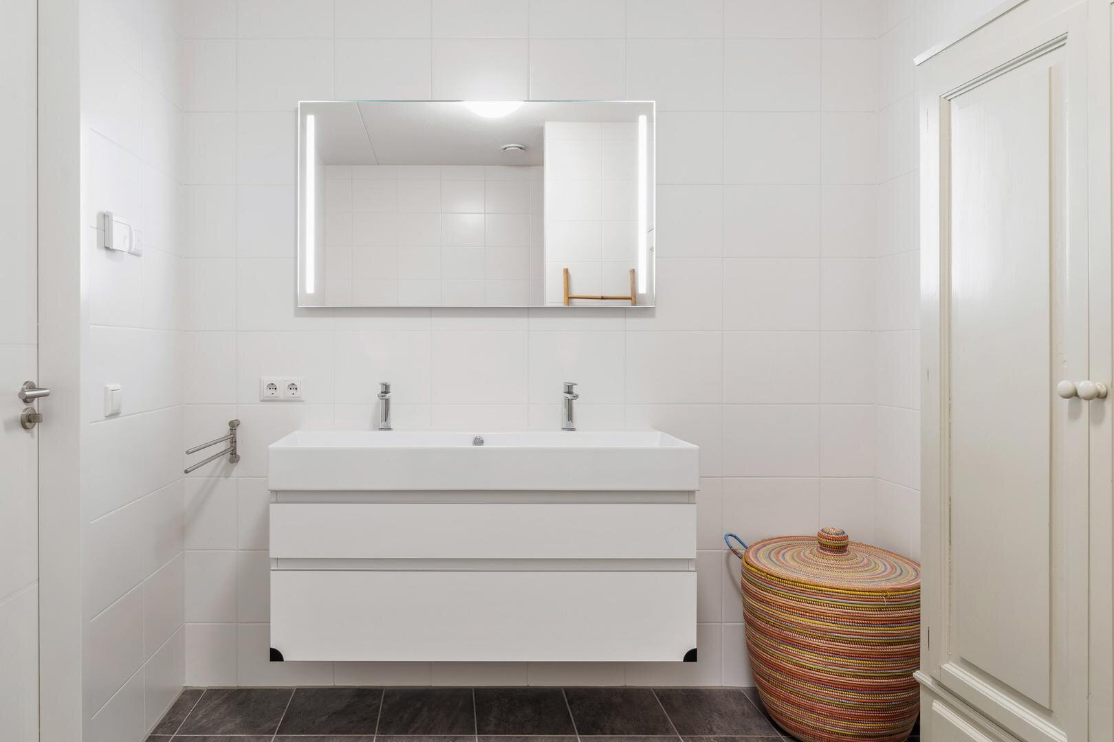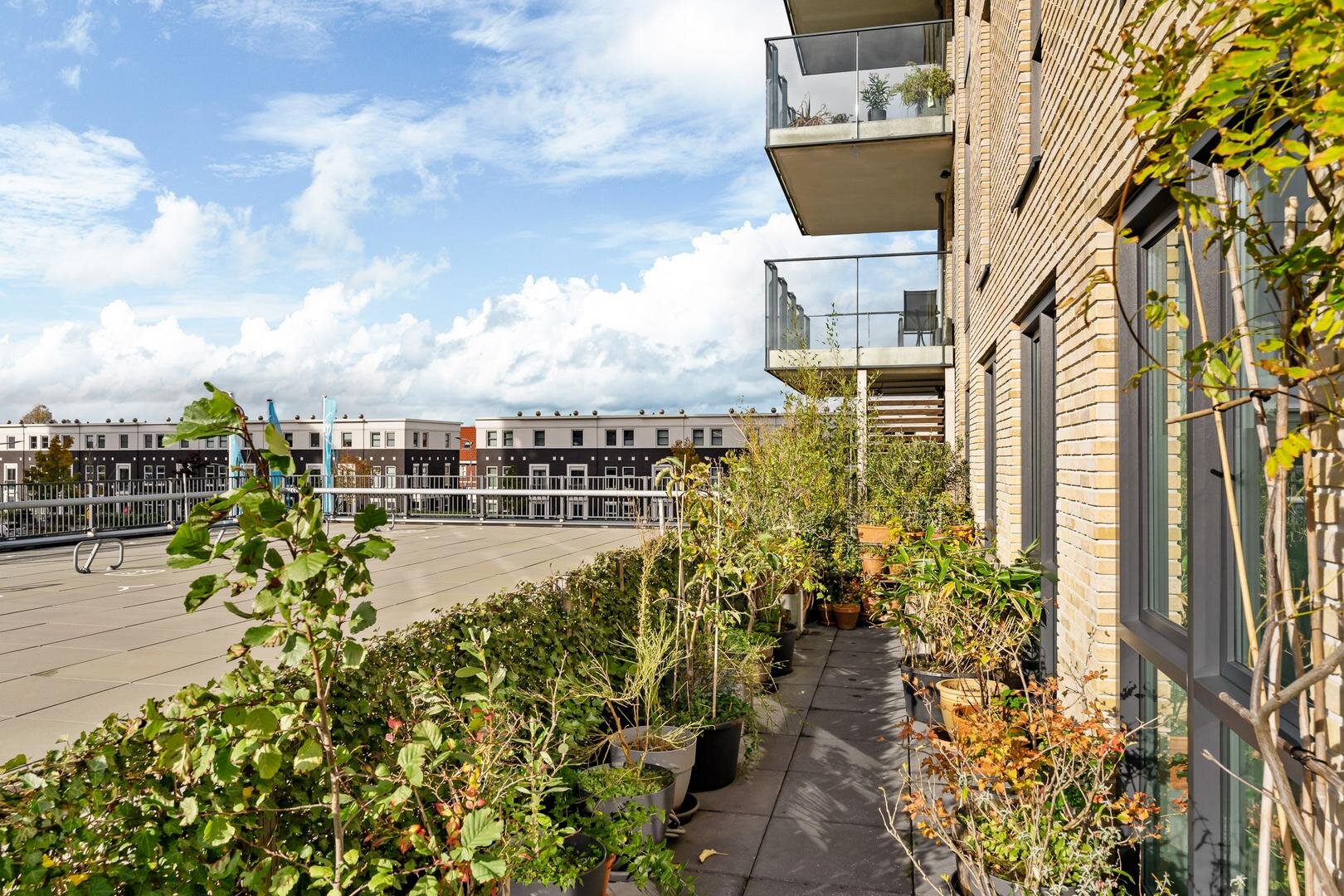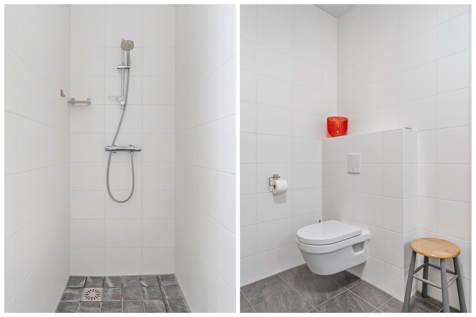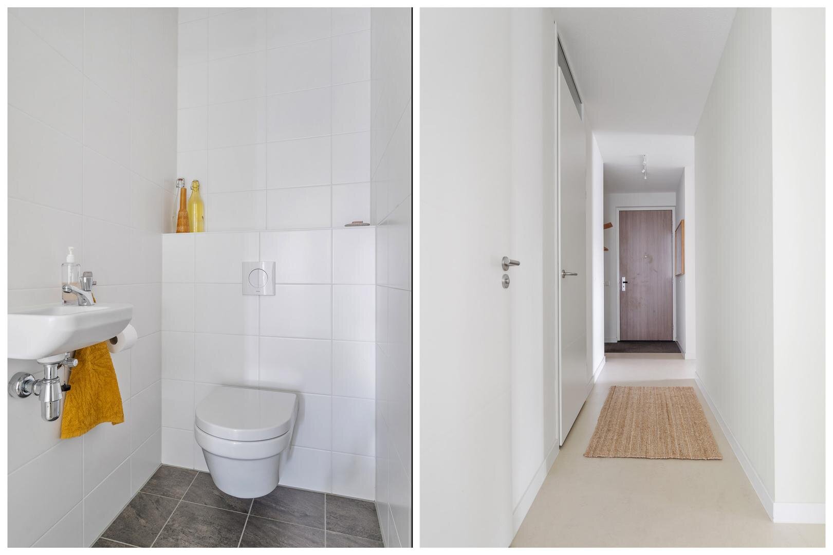 U komt binnen in een lichte hal met aan de linkerzijde de badkamer, voorzien van een inloopdouche, toilet en dubbel wastafelmeubel. Verder bevindt zich hier de master bedroom met directe toegang tot het royale terras. Terug naar de hal, hier bevindt zich de technische ruimte met de installaties en witgoed, en vervolgens vindt u een apart toilet met hangend closet en fontein. Verderop vindt u twee ruime slaapkamers en een handige opslagruimte. De woonkamer is ruim opgezet en afgewerkt met een marmoleum vloer voorzien van geluidsisolatie. De open keuken is uitgerust met een composiet werkblad, inductiekookplaat, afzuigkap, Quooker, vaatwasser, oven en koel-vriescombinatie. Een praktische en stijlvolle ruimte die uitnodigt tot koken en samenzijn. Via de woonkamer bereikt u het royale dakterras dat het appartement rondom omarmt: een heerlijke plek voor zon, groen en rust.
