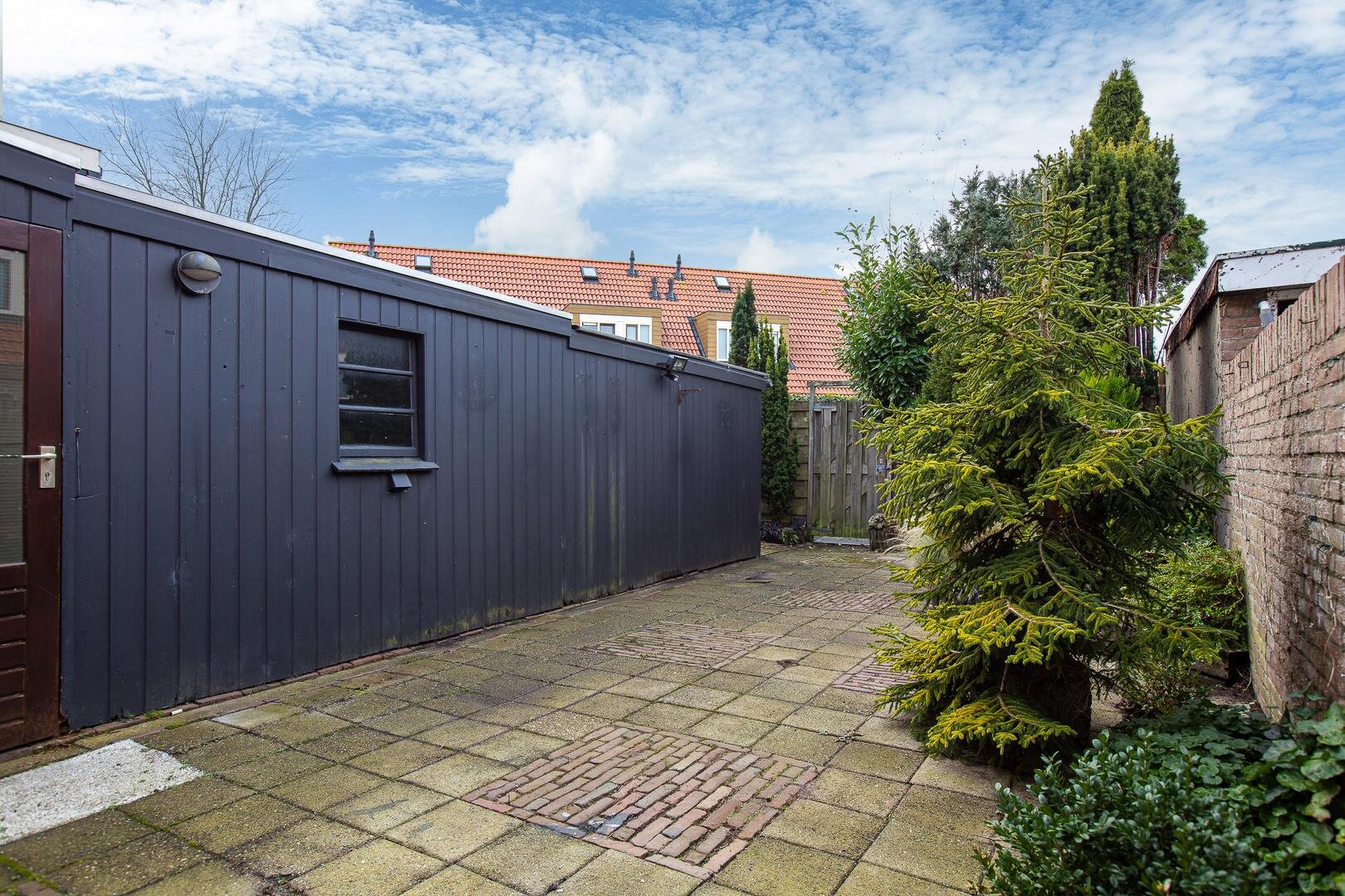 Entree, hal, toilet met fontein, trapkast, voormalig woonkamer ensuite met openslaande deuren en balkenplafond, dichte keuken in rechte opstelling, berging. Fijne achtertuin op het westen met achterom en berging.