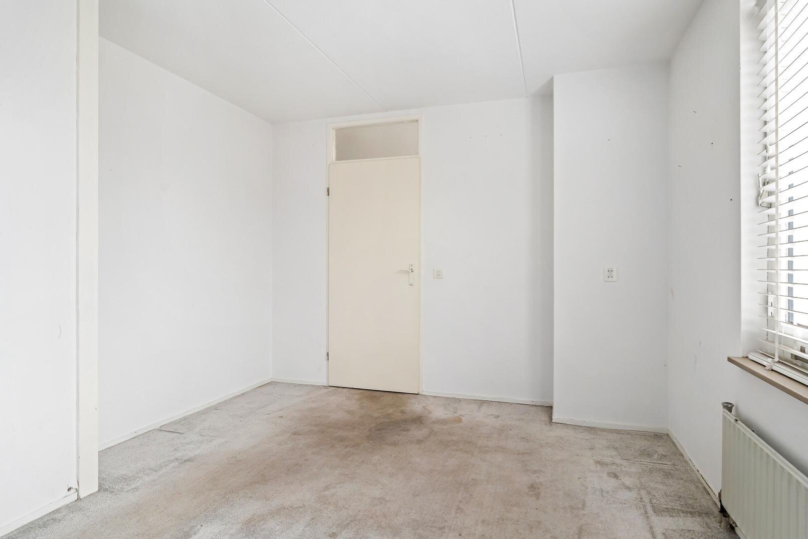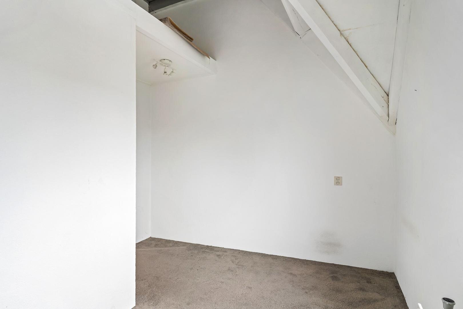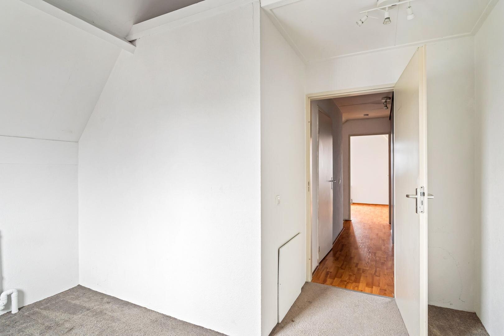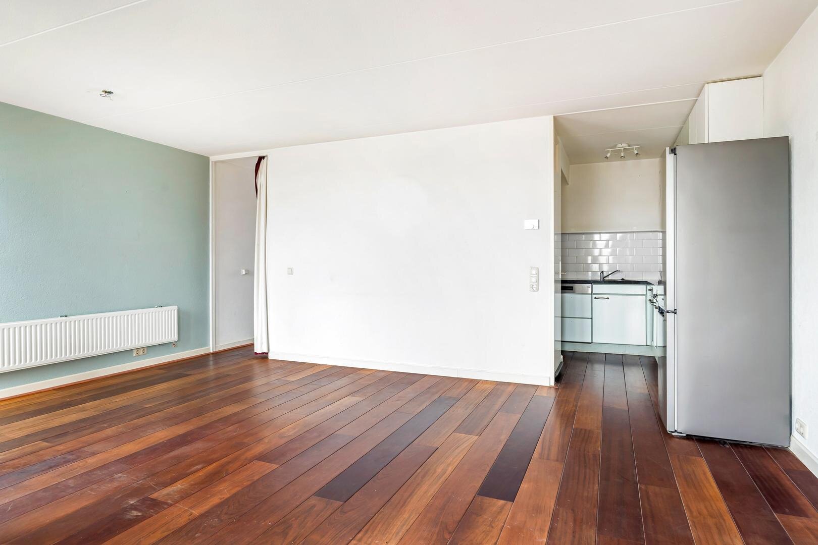 Bij binnenkomst vindt u een ruime entree met direct links een slaapkamer, ideaal als werk-, logeer- of hobbykamer. Verder in de gang liggen het toilet met fonteintje en de meterkast, en via de trap bereikt u de woonkamer met open keuken. De woonkamer is straatgericht en lekker licht, met een warme massief houten vloer en een deur naar het balkon.