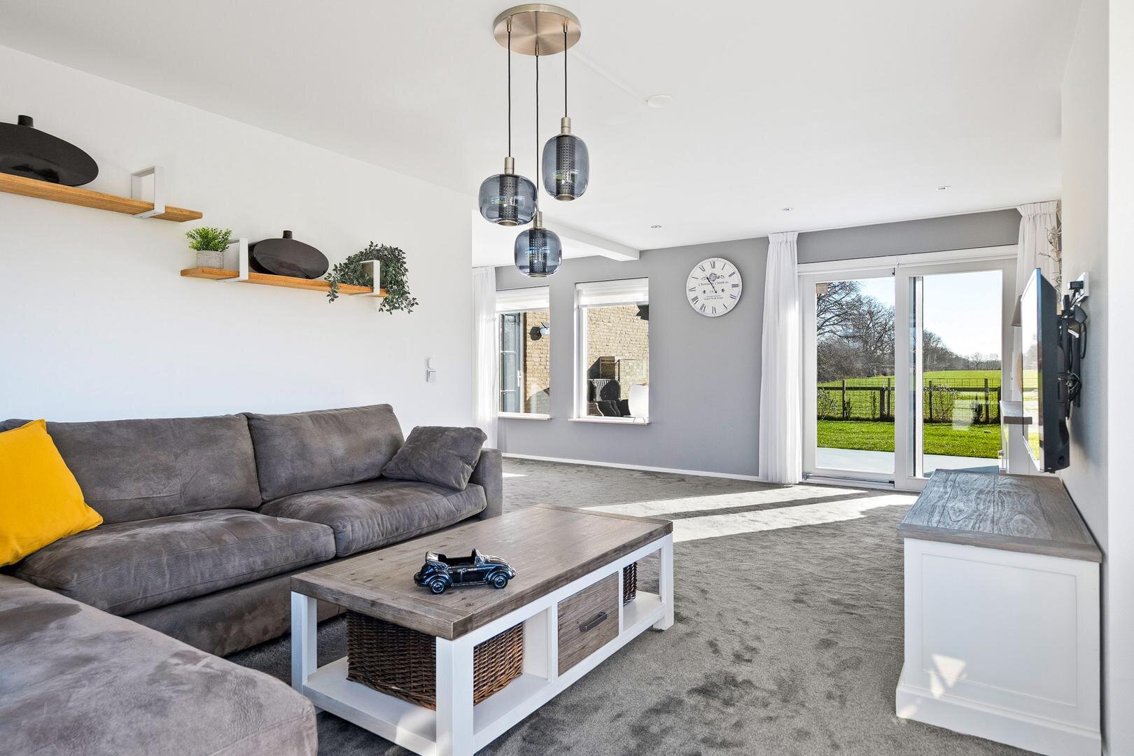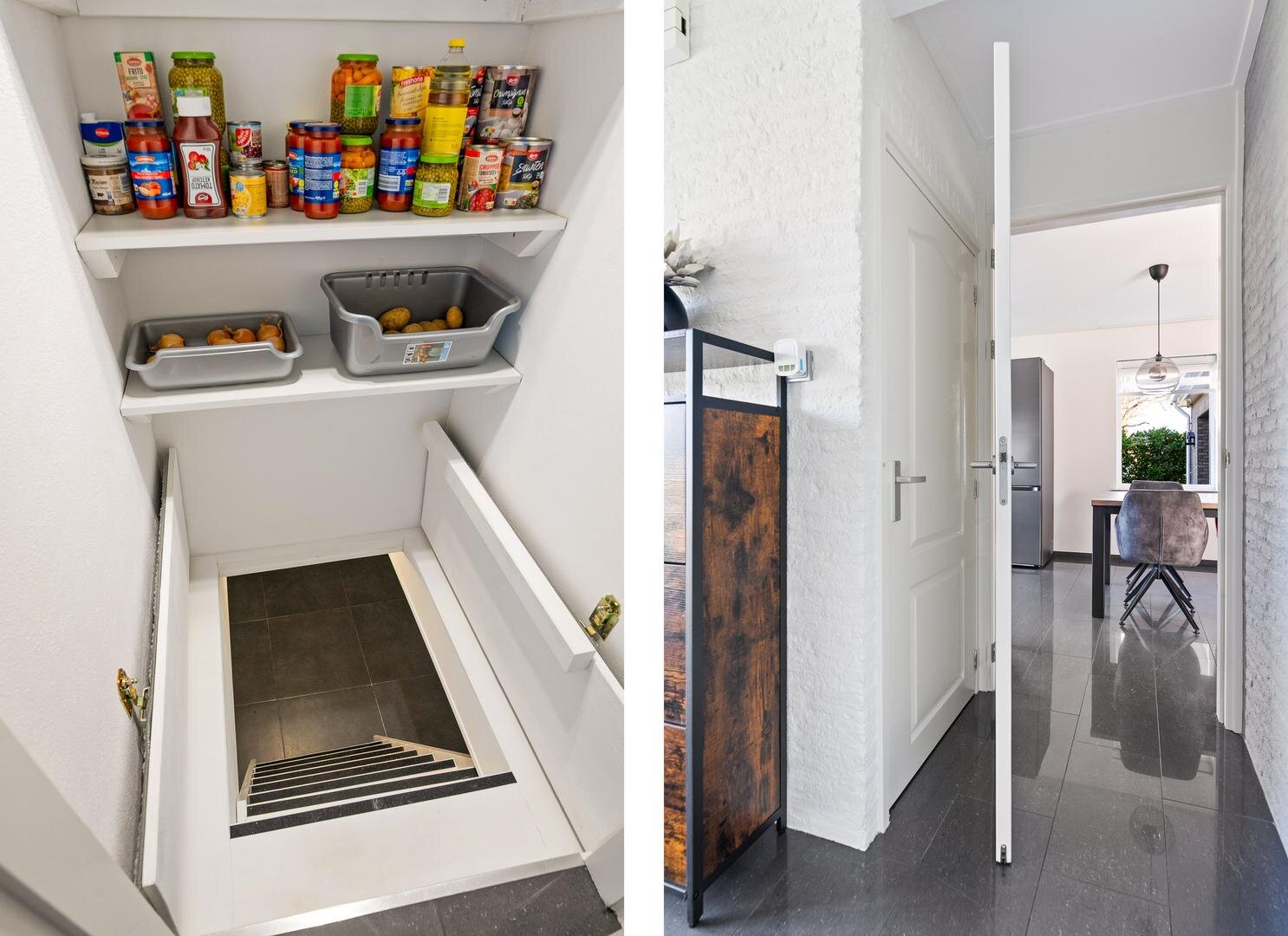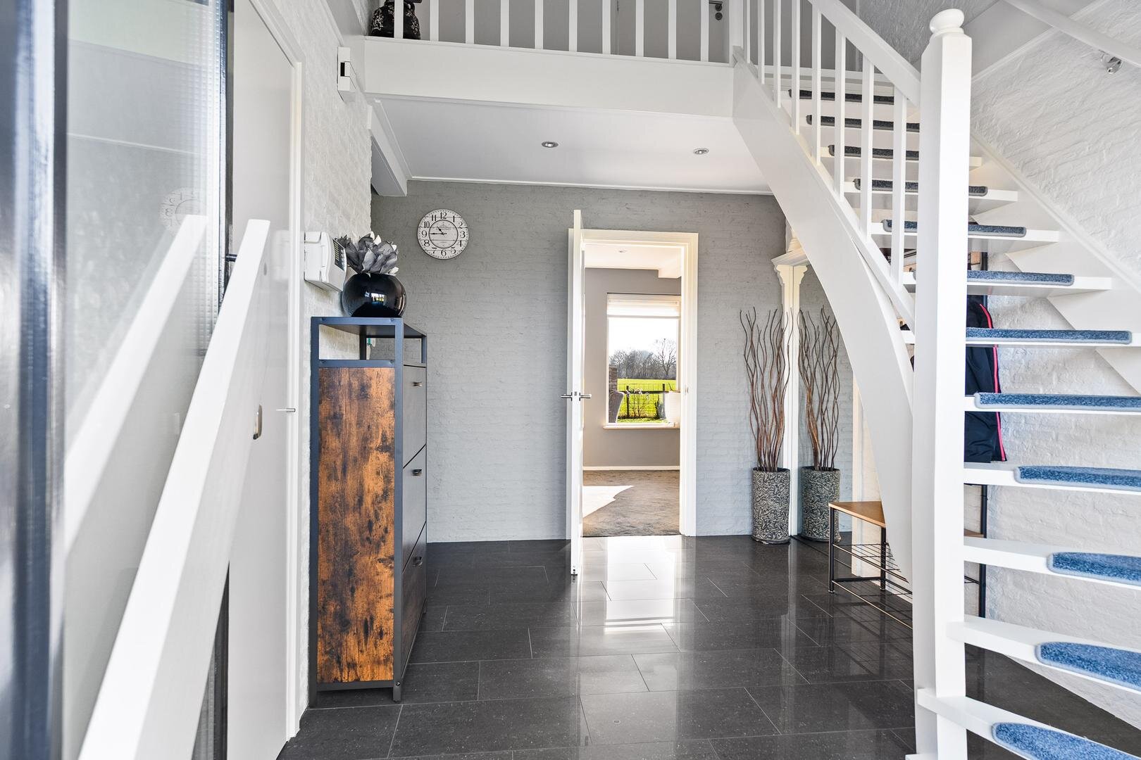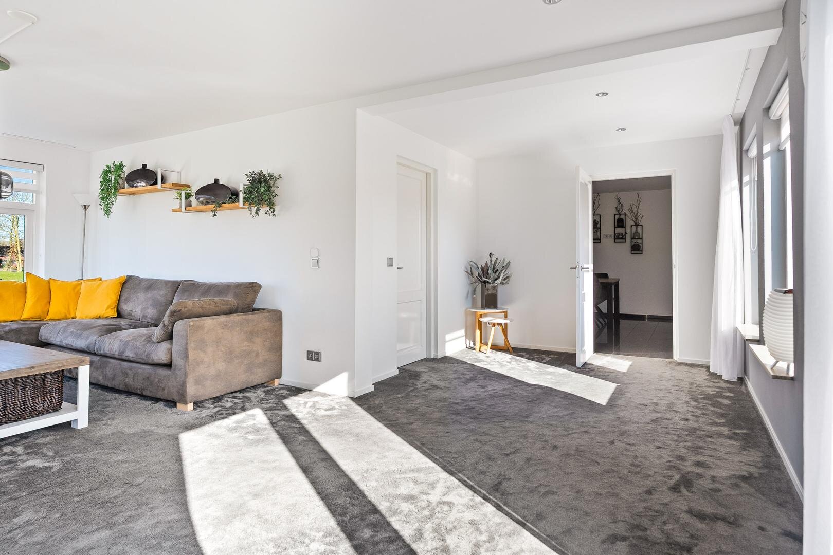 Via de ruime entree kom je binnen in de hal met trapopgang naar de eerste verdieping, het toilet, de meterkast en toegang tot de kelder. Vanuit de hal bereik je de lichte L-vormige woonkamer. Dankzij de grote raampartijen valt hier veel natuurlijk licht naar binnen en heb je een prachtig uitzicht over de omliggende weilanden én je stapt vanuit de woonkamer moeiteloos door de schuifpui de tuin in en geniet direct van het groen, de ruimte en de rust van je eigen tuinweelde. De woonkamer staat in verbinding met de dichte eetkeuken, die is uitgevoerd in een praktische L-opstelling. Vanuit de keuken bereik je de bijkeuken met vaste kasten en een loopdeur naar buiten. Deze hal biedt tevens toegang tot de garage en tot de badkamer, welke is voorzien van een inloopdouche en een dubbele wastafel.