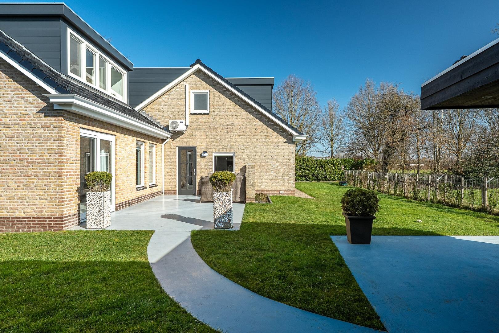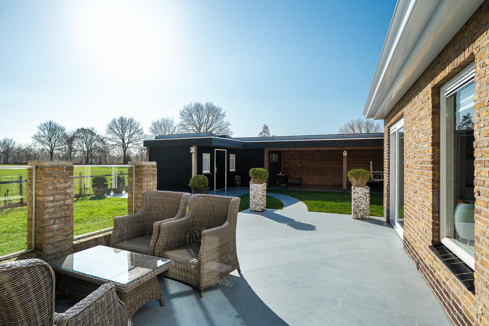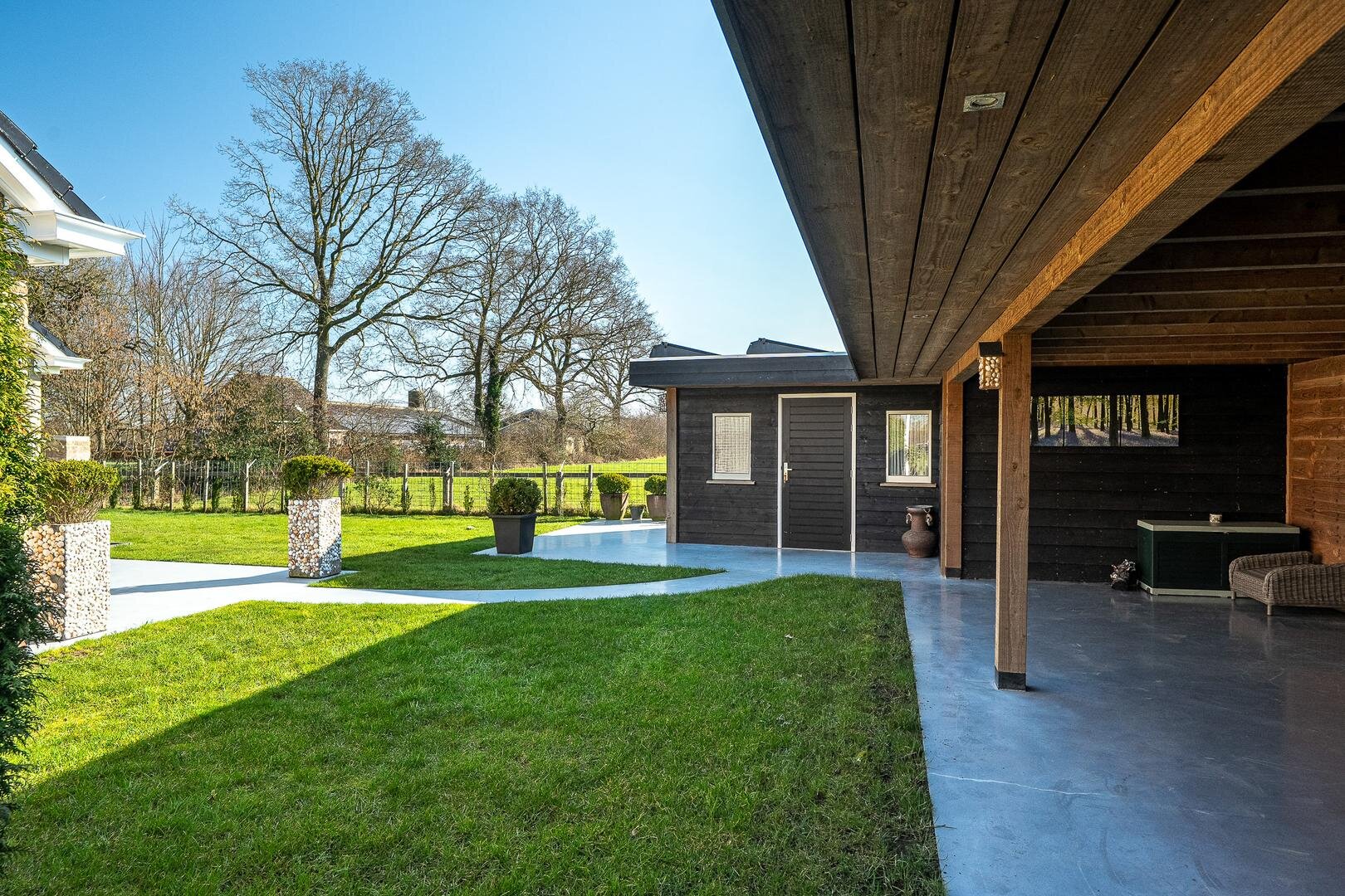 Het houten tuinhuis met overkapping biedt een fijne plek voor de loungeset of stalling. Op de overkapping van het tuinhuis zijn maar liefst 25 zonnepanelen geplaatst. Het vaste schuurgedeelte is ideaal voor het opbergen van gereedschap of voor hobby’s, zodat alles netjes uit het zicht blijft. Daarnaast is er een fijn zonneterras met glasafscheiding, perfect om rustig van het uitzicht en de zon te genieten. De strakke betonvloer loopt door in een sierlijk pad richting het tuinhuis, wat de tuin niet alleen stijlvol maar ook praktisch maakt.