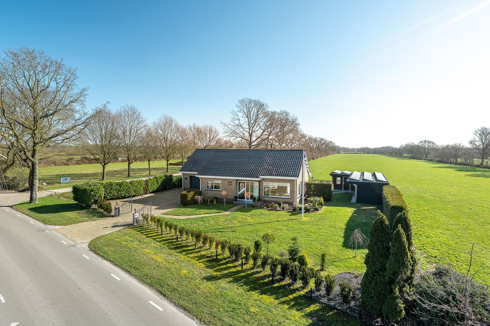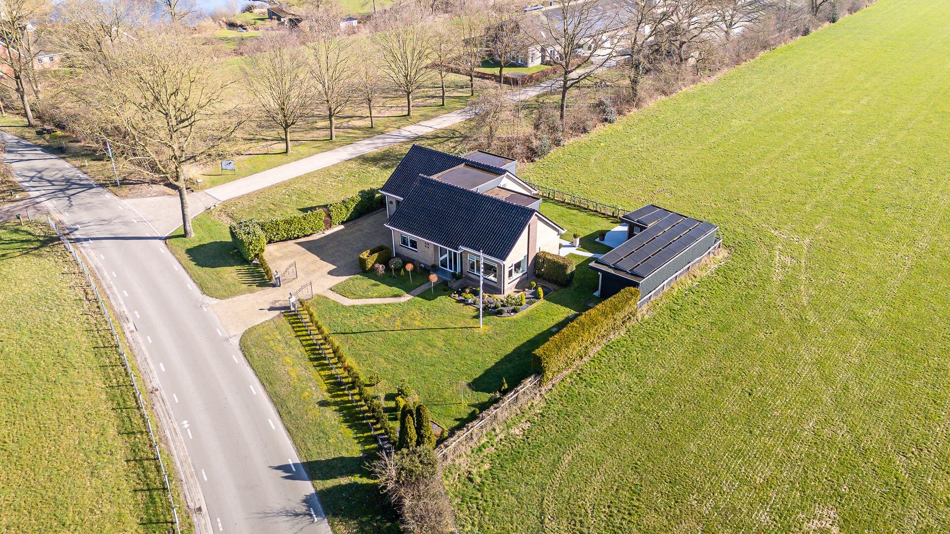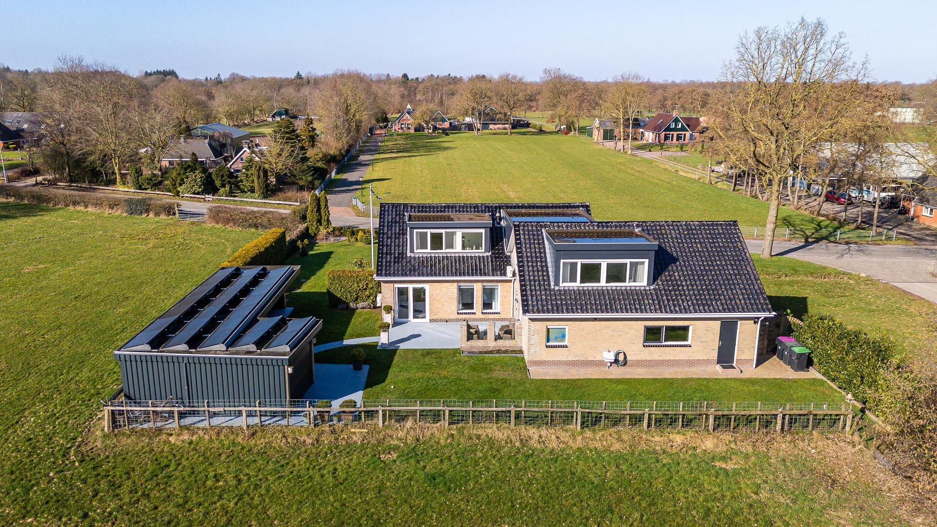 Het houten tuinhuis met overkapping biedt een fijne plek voor de loungeset of stalling. Op de overkapping van het tuinhuis zijn maar liefst 25 zonnepanelen geplaatst. Het vaste schuurgedeelte is ideaal voor het opbergen van gereedschap of voor hobby’s, zodat alles netjes uit het zicht blijft. Daarnaast is er een fijn zonneterras met glasafscheiding, perfect om rustig van het uitzicht en de zon te genieten. De strakke betonvloer loopt door in een sierlijk pad richting het tuinhuis, wat de tuin niet alleen stijlvol maar ook praktisch maakt.