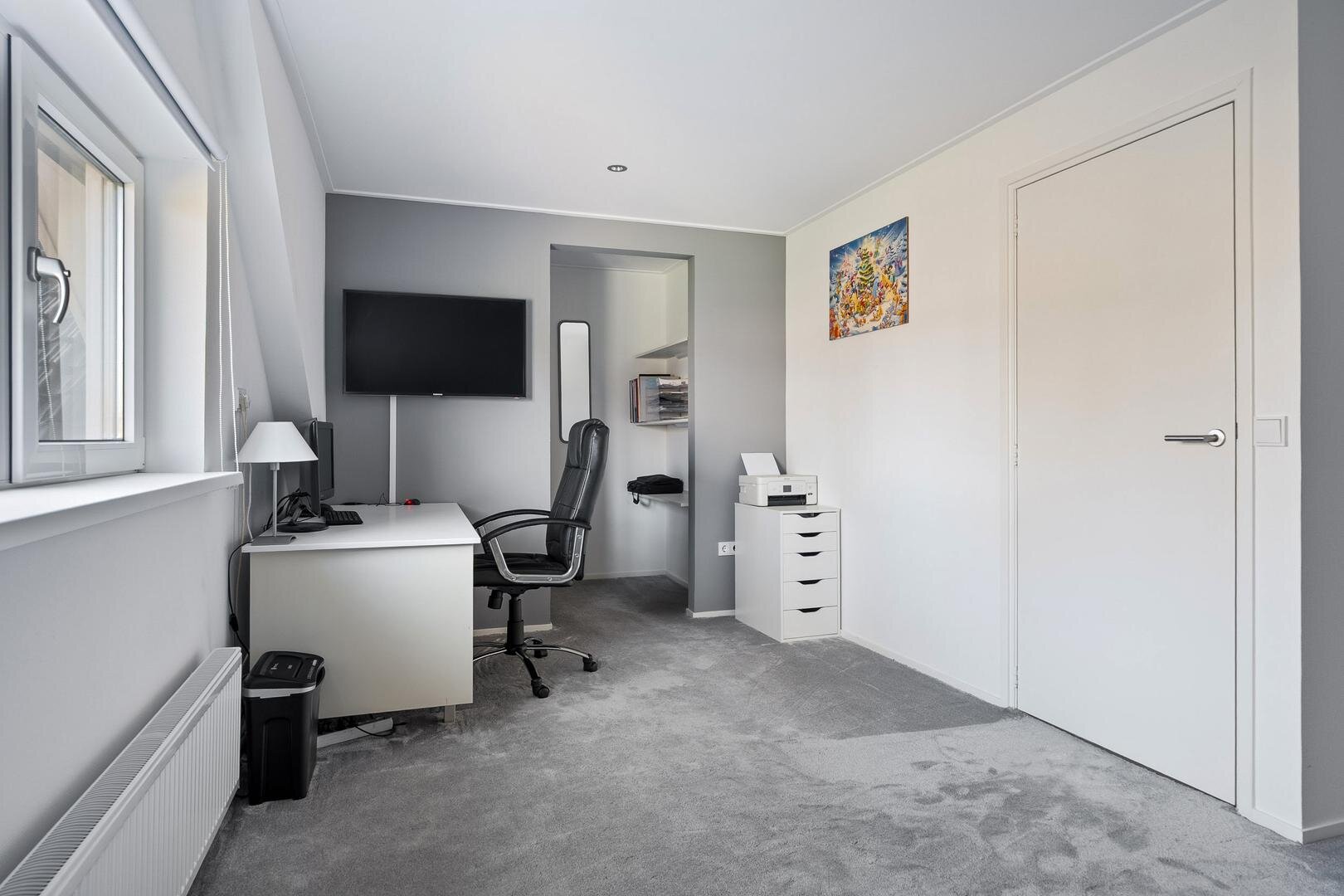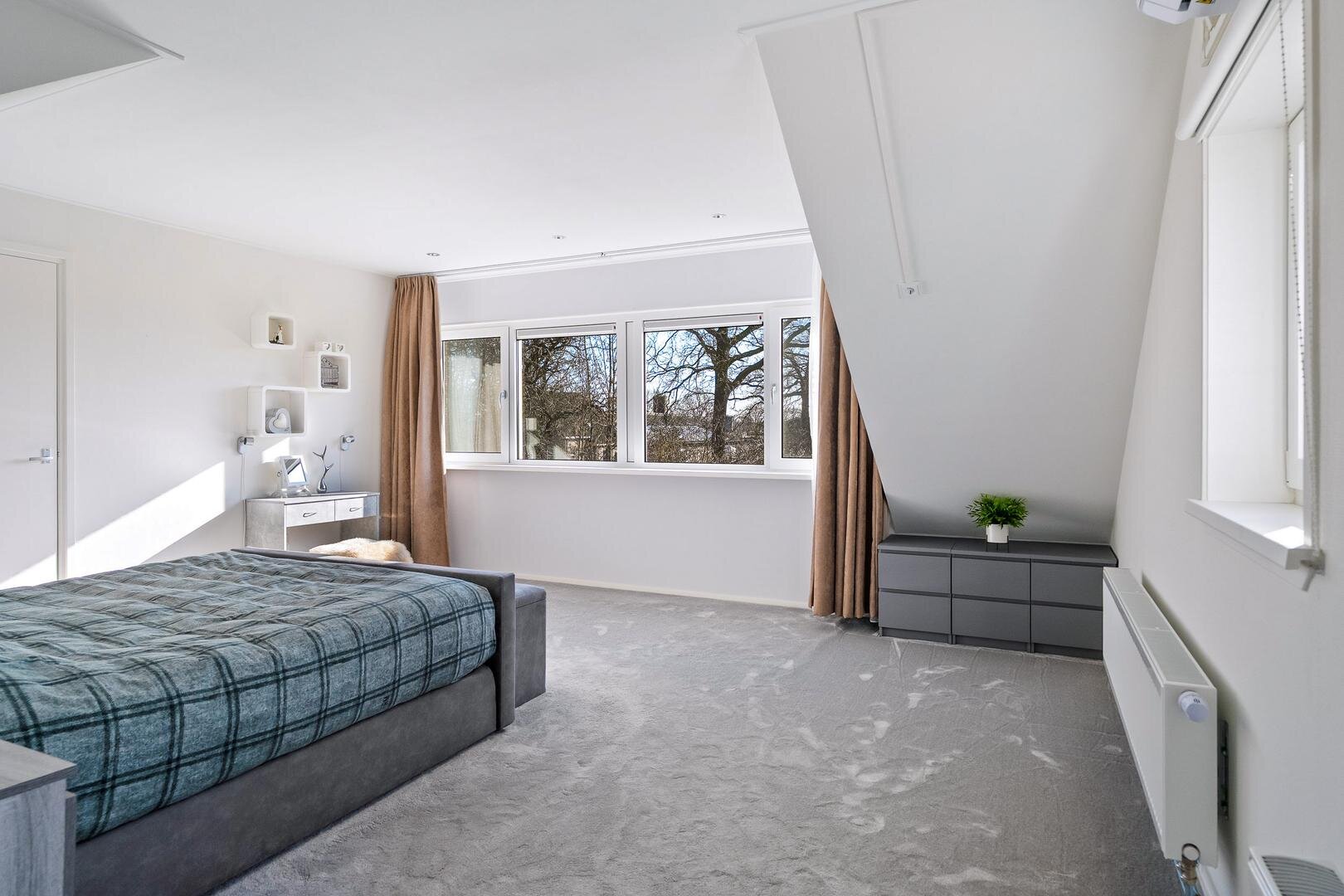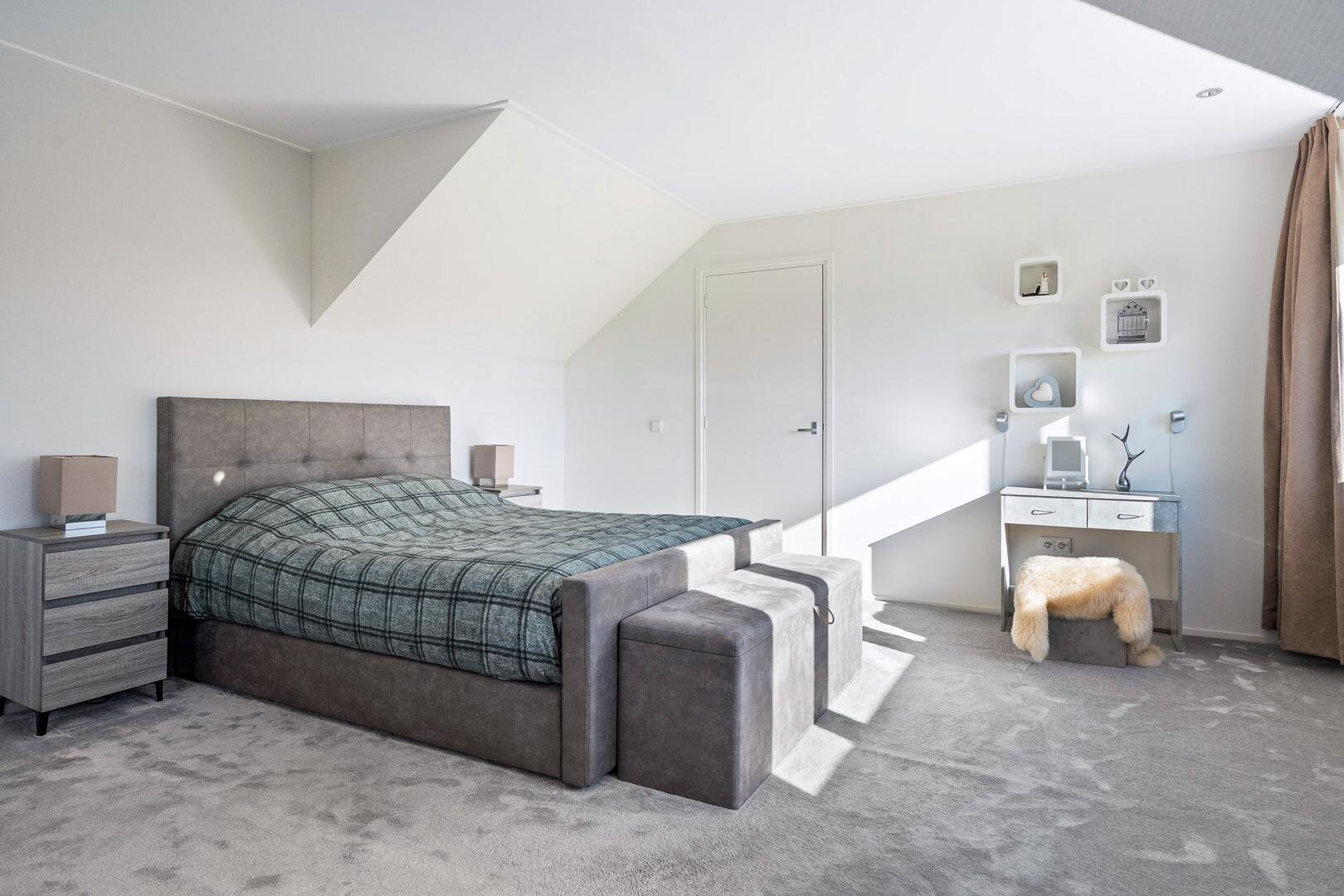 De eerste verdieping beschikt over een ruime overloop met vide, die toegang geeft tot drie royale slaapkamers. Dankzij de dakkapellen zijn de kamers ruim en licht. Daarnaast bevindt zich op deze verdieping een tweede badkamer, voorzien van een toilet en een wastafelmeubel. Extra praktisch zijn de drie handige inloopkasten die zorgen voor volop bergruimte.