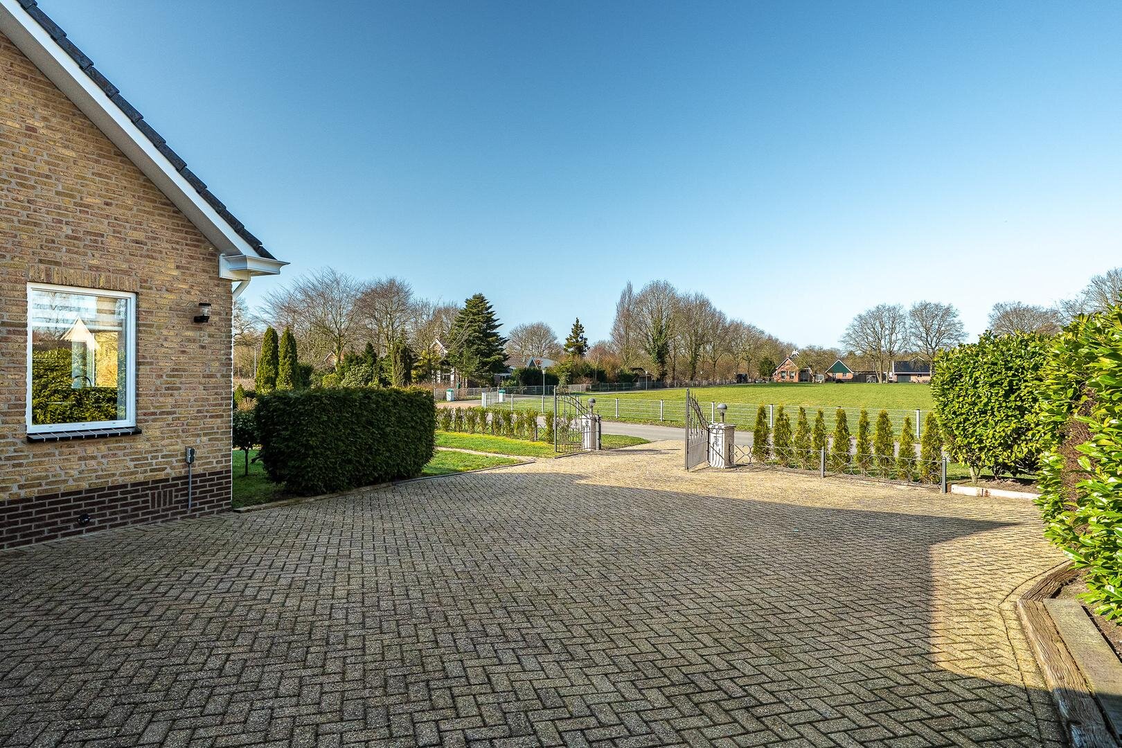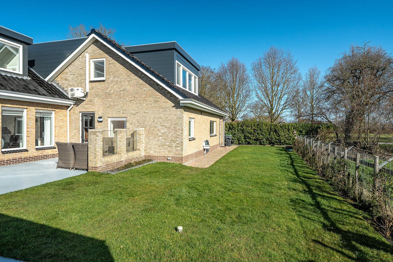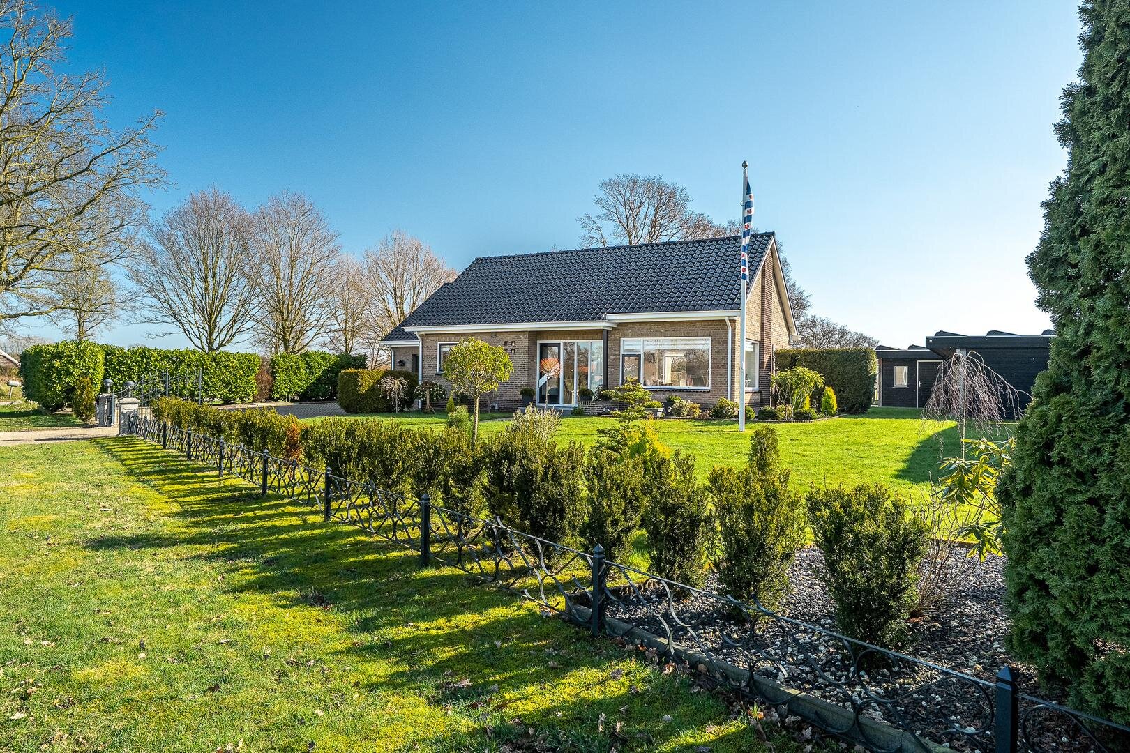 Rondom de woning ligt een mooie, groene tuin. Het groene gazon biedt volop ruimte om te spelen, te ontspannen of lekker in de zon te zitten. De tuin is omgeven door een sierlijk hekwerk met een praktische tuinpoort, waardoor het een afgesloten en geborgen plek is. De Friese wimpel wappert fier en geeft meteen de landelijke charme van deze plek.