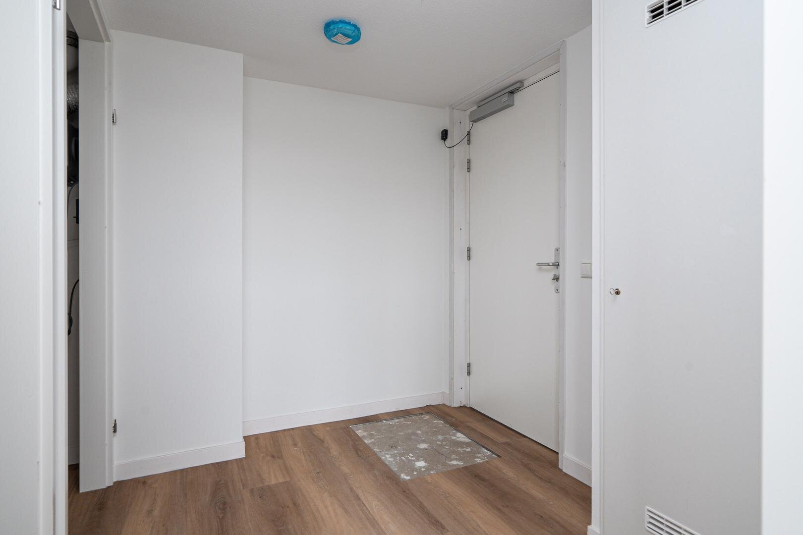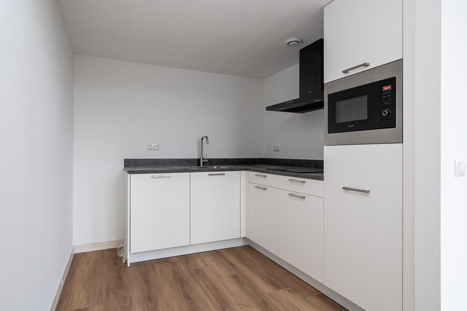 De woonkamer is voorzien van een open keuken met inbouwapparatuur (o.a. inductiekookplaat, combimagnetron, koelkast met vriesvak). De badkamer heeft een wastafel met kastje, douche met douchedeur en een toilet met hangend closet.